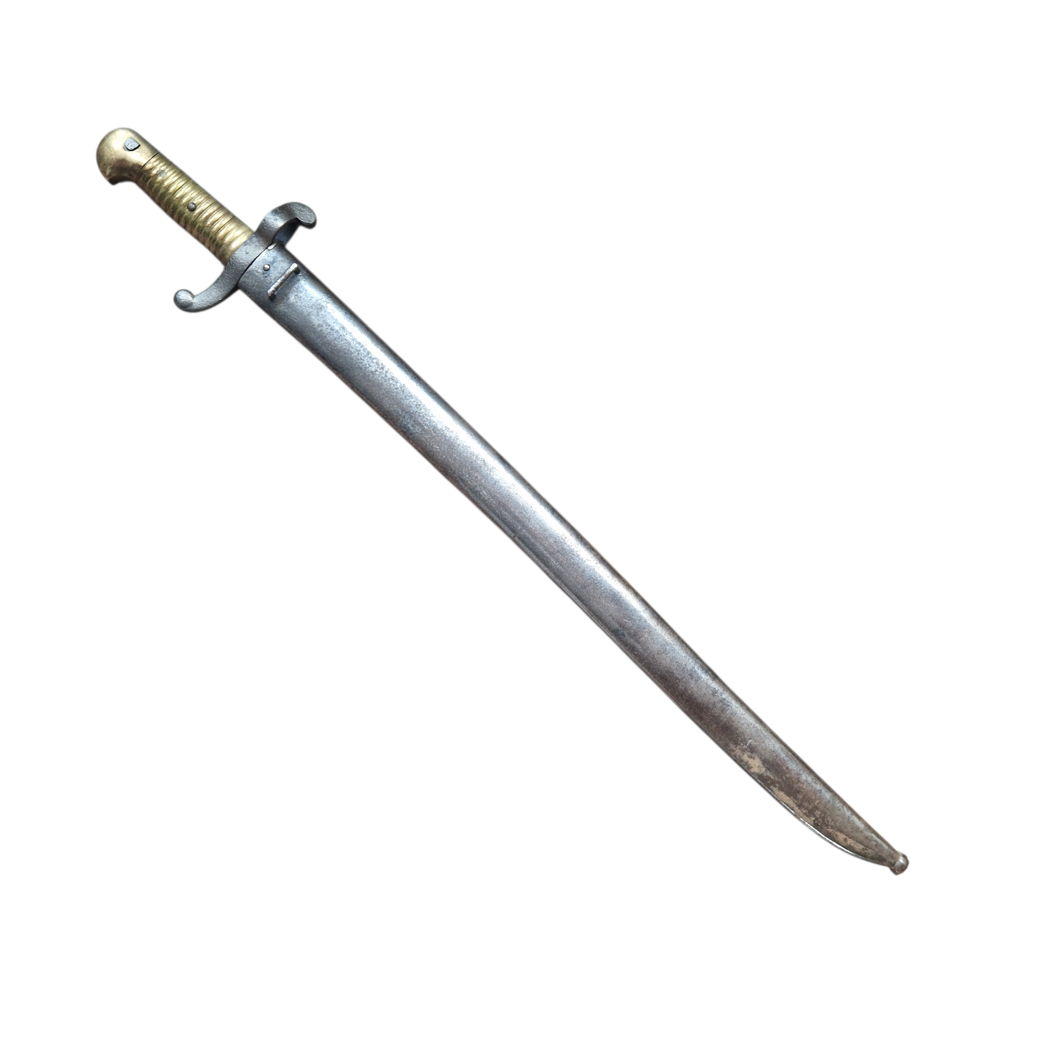 W ofercie dostępny jest również bagnet francuski Chassepot z wytwórni Tulle — rzadko spotykana odmiana w tym typie. Egzemplarz jest niezgodny z pochewką, jednak zarówno bagnet, jak i pochewka zachowały się w bardzo dobrym stanie. Przy mocowaniu żaby widoczna jest surowa, nienaruszona stal, co sugeruje wieloletni brak demontażu. Jelec i głownia pozostają w oryginalnym stanie, bez śladów czyszczenia.