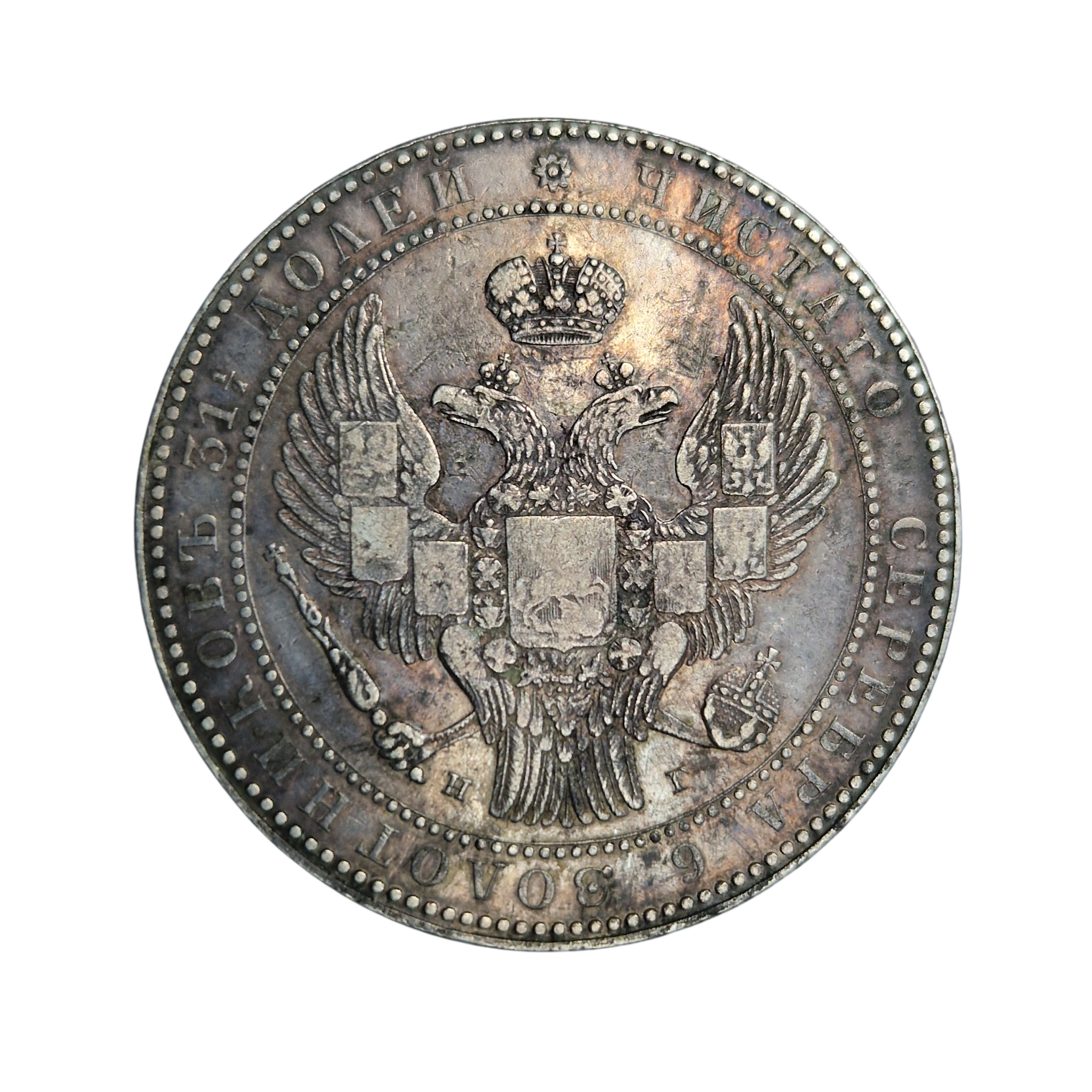 1 1/2 rubla 10 zł Królestwo Kongresowe 1833 rok, moneta dwunominałowa, bita w srebrze, waga około 31,71 grama, moneta obiegowa w dobrym stanie zachowania 3+ ładne lustro, co wyróżnia monetę to piękna naturalna ciemna patyna.