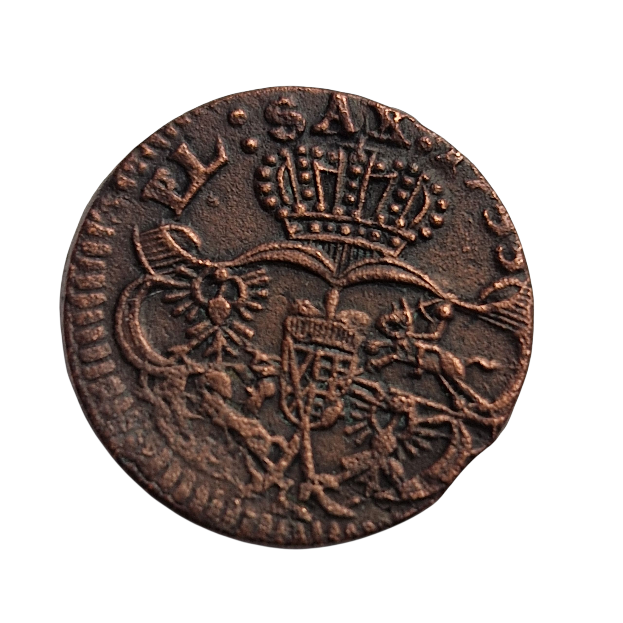 1 Grosz Koronny August III Sas, 1755 rok, mennica Gubin, moneta obiegowa, STAN 3 – moneta miedziana , rant gładki, waga 3,40 g, średnica 21 mm