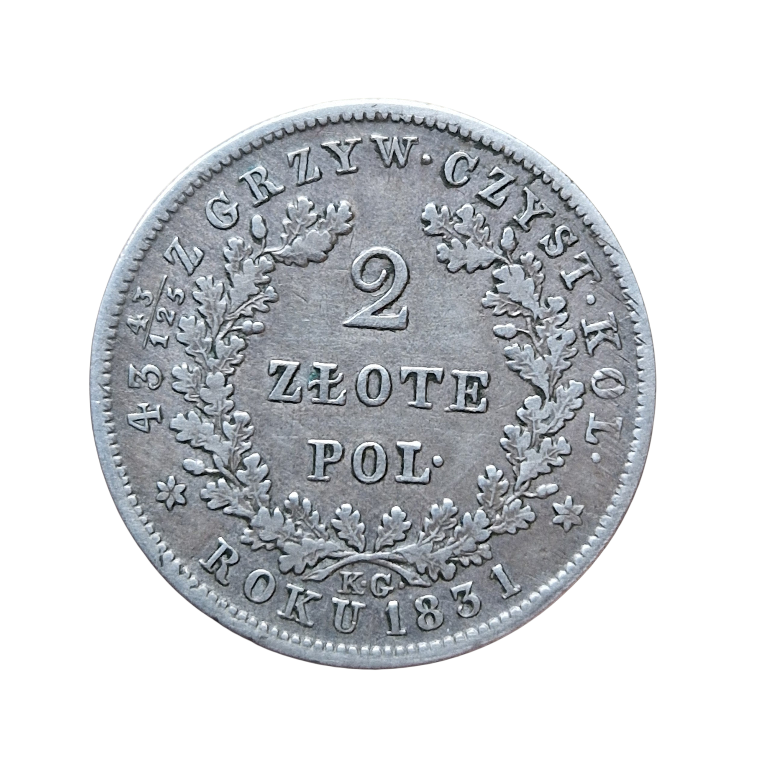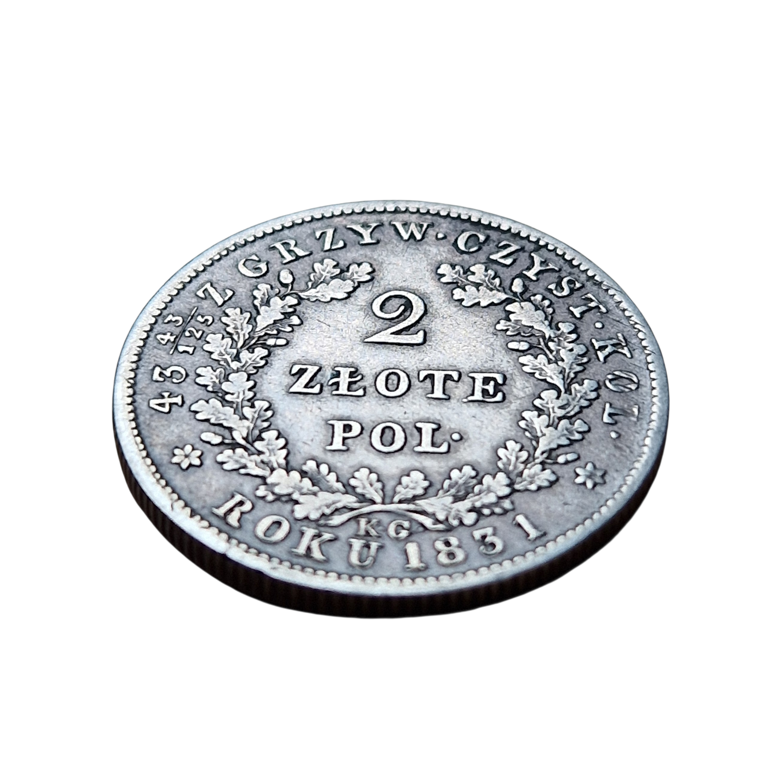 2 złote Powstanie Listopadowe, bardzo delikatny justunek jak na ten typ monety, bardzo ładna obiegowa moneta, piękna równomierna patyna, stan; 3+