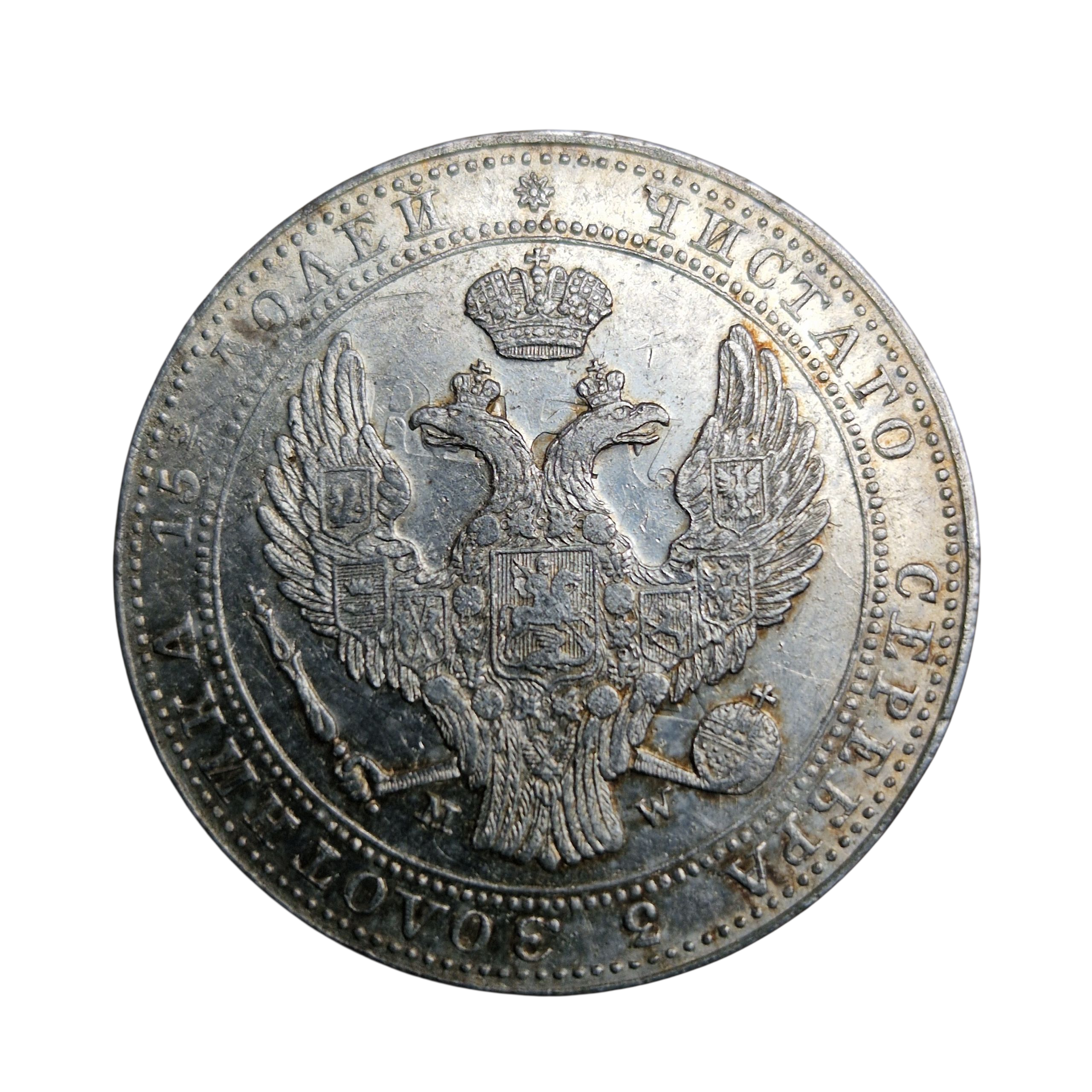 3/4 rubla, 5 złotych MW Warszawa, dwunominałowa pięknie zachowana moneta, odmiana z trzema jagodami po piątej kępce, z dużymi cyframi daty i cyfrą jeden z długim daszkiem, Egzemplarz z wyrażnym efektem ducha, sprzedawana moneta ze zdjęcia, zdjęcia gabinetowe są wykonane przy sztucznym oświetleniu, STAN ZACHOWANIA; 2. Efekt ducha na monecie odnosi się do błędu menniczego, w którym na jednym stemplu pojawiają się odciski dwóch lub więcej różnych wzorów, co powoduje że jeden wizerunek ,,przebija” się przez drugi, tworząc zniekształcony obraz przypominający ducha .Zazwyczaj jest to efekt niedokładnego wbicia dwóch stempli w ten sam krążek lub powielenia motywu z awersu na rewersie monety, co może stworzyć widok przypominający zarys orła przebijający się przez całą monetę.