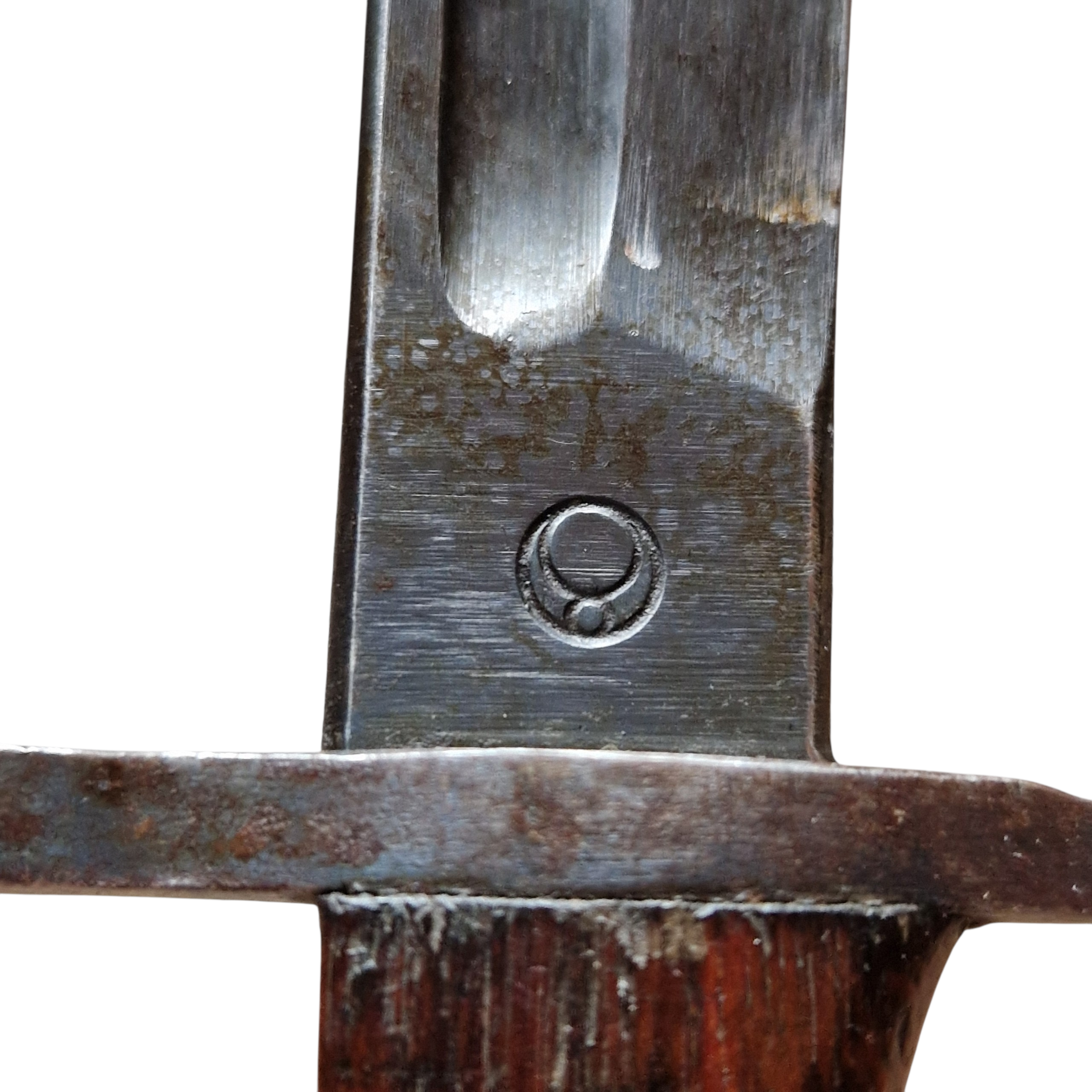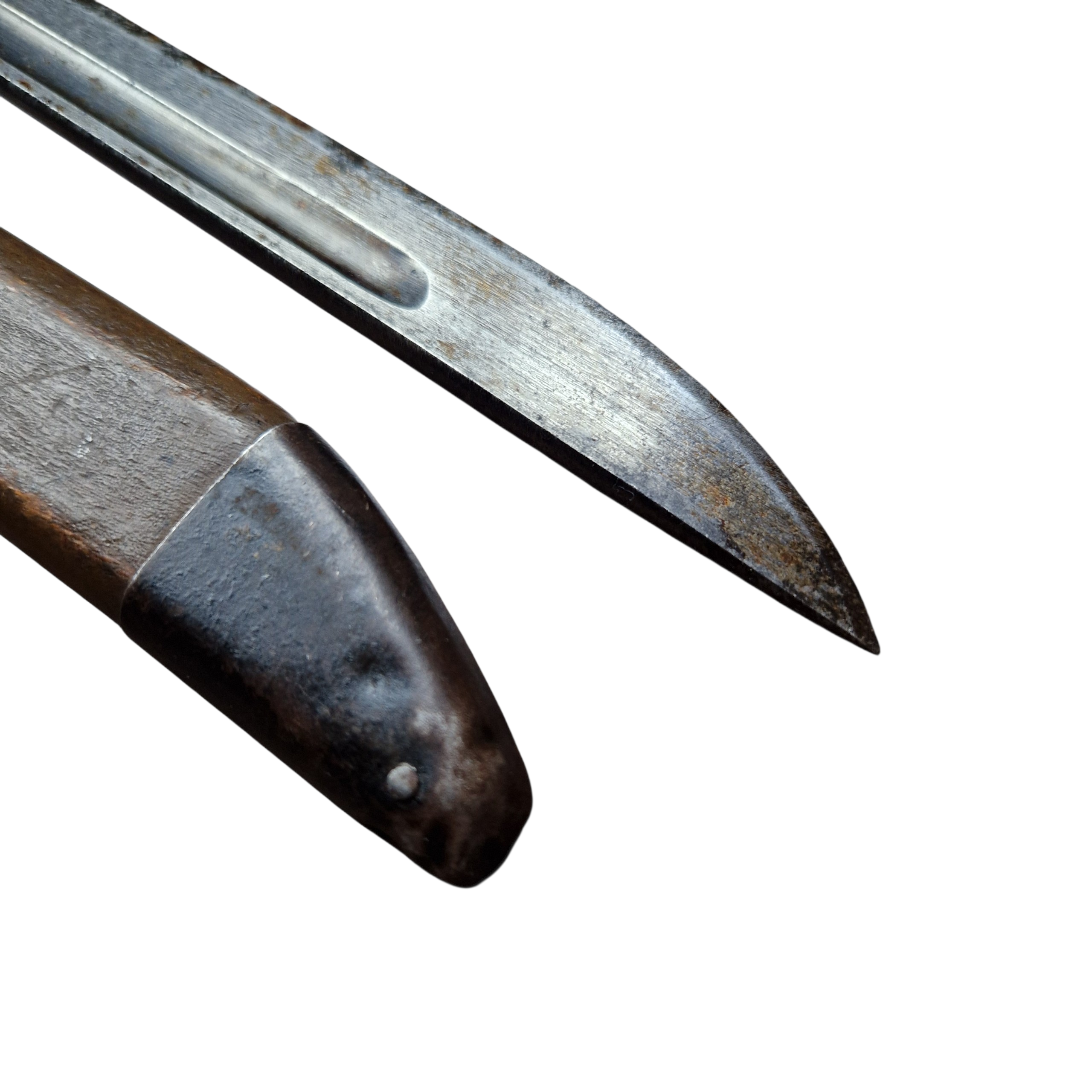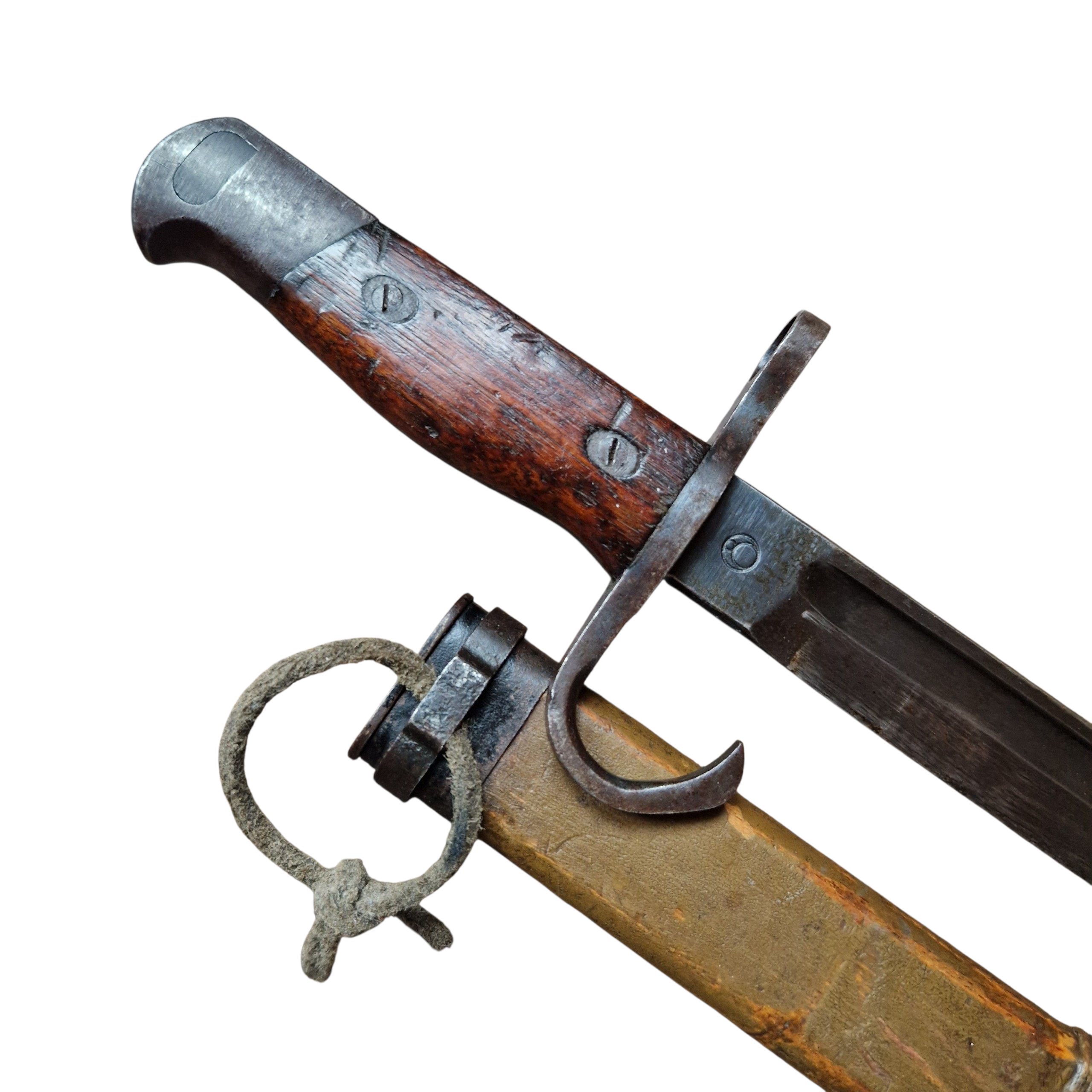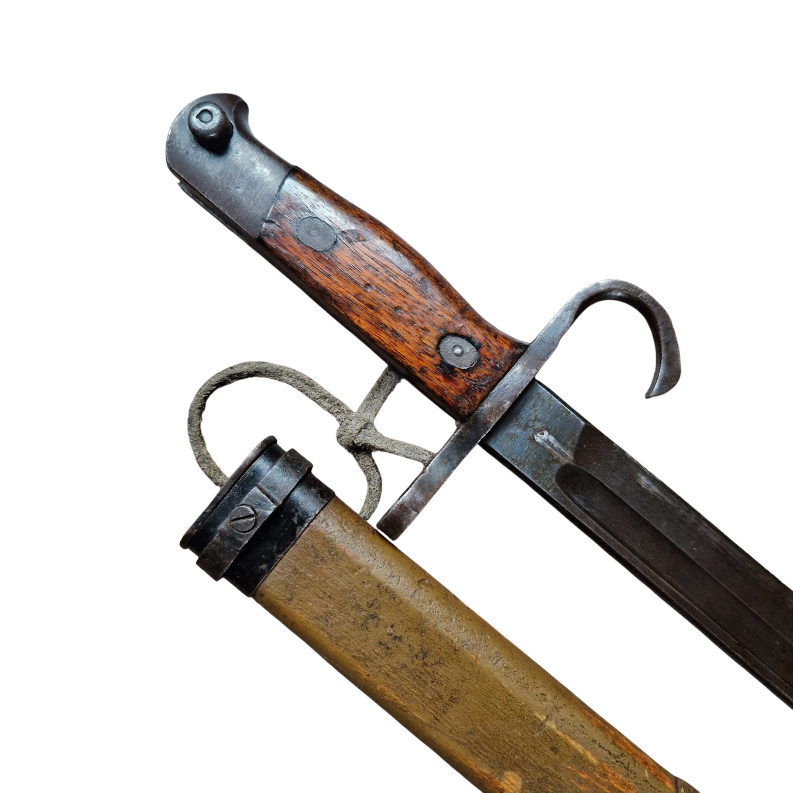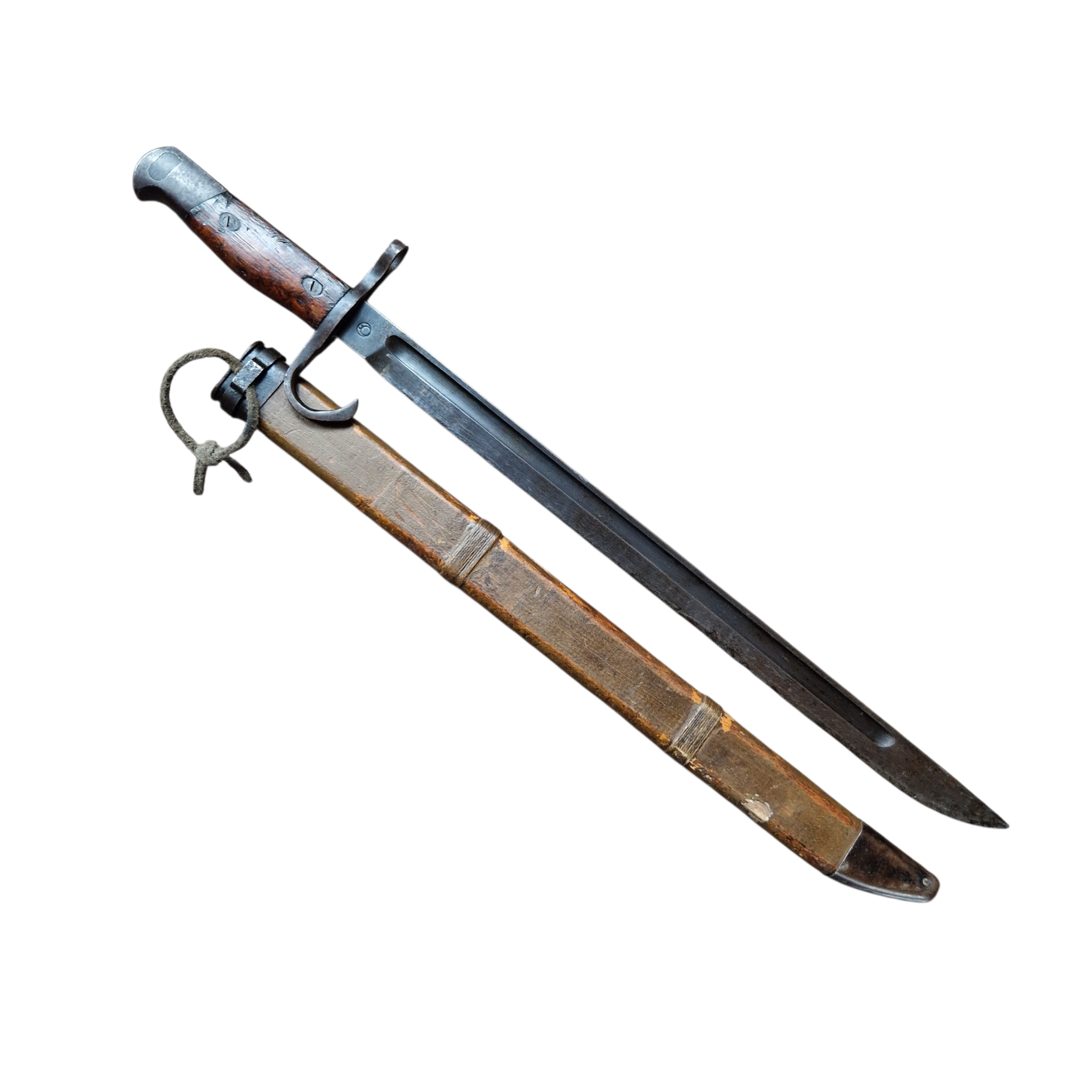 Bagnet Japoński Arisaka z bardzo rzadką pochwą z trzasek drewna z końca wojny, pochwa zastępcza z końca wojny, [ 44-45 rok], bagnet produkcji kontraktora czyli niewielkiej mano faktury ,,podwykonawcy” głównego arsenału; Rikugun Zoheisho Nagoya Kosho, bagnet pochodzi z USA, w Europie, Polsce nigdy wcześniej nie był w kolekcji, bagnet typ 30 czyli nieco wcześniejszy niż pochwa, sztych głowni ostrzony fabrycznie na bojowo, do połowy głowni, podobnie jak w Polskich bagnetach ,, mobilizacyjnych”, bagnet posiada bity numer broni 49567 z japońskimi oznaczeniami obok. bagnet w bardzo dobrym stanie, pełny oryginał, najbardziej ciekawą częścią bagnetu jest pochwa, nie jest to żadna kopia indyjska, pochewka klejona z dwóch trzasek drewna, sporo farby koloru khaki, sznurek widoczny na zdjęciach był z bagnetem i tak zostaje pozostawiony, jest ewidentnie stary, widoczna drobna naprawa w jednym miejscu pole 1cm x 1cm, niewielkie pęknięcie na drewnie około 6 cm bez znaczenia wizualnego jak i użytkowego pochwy. takich pochew zachowało się niewiele do naszych czasów, cena jest stosunkowo niska jak za taką rzadkość, tak naprawdę koszt całości to głównie pochwa.