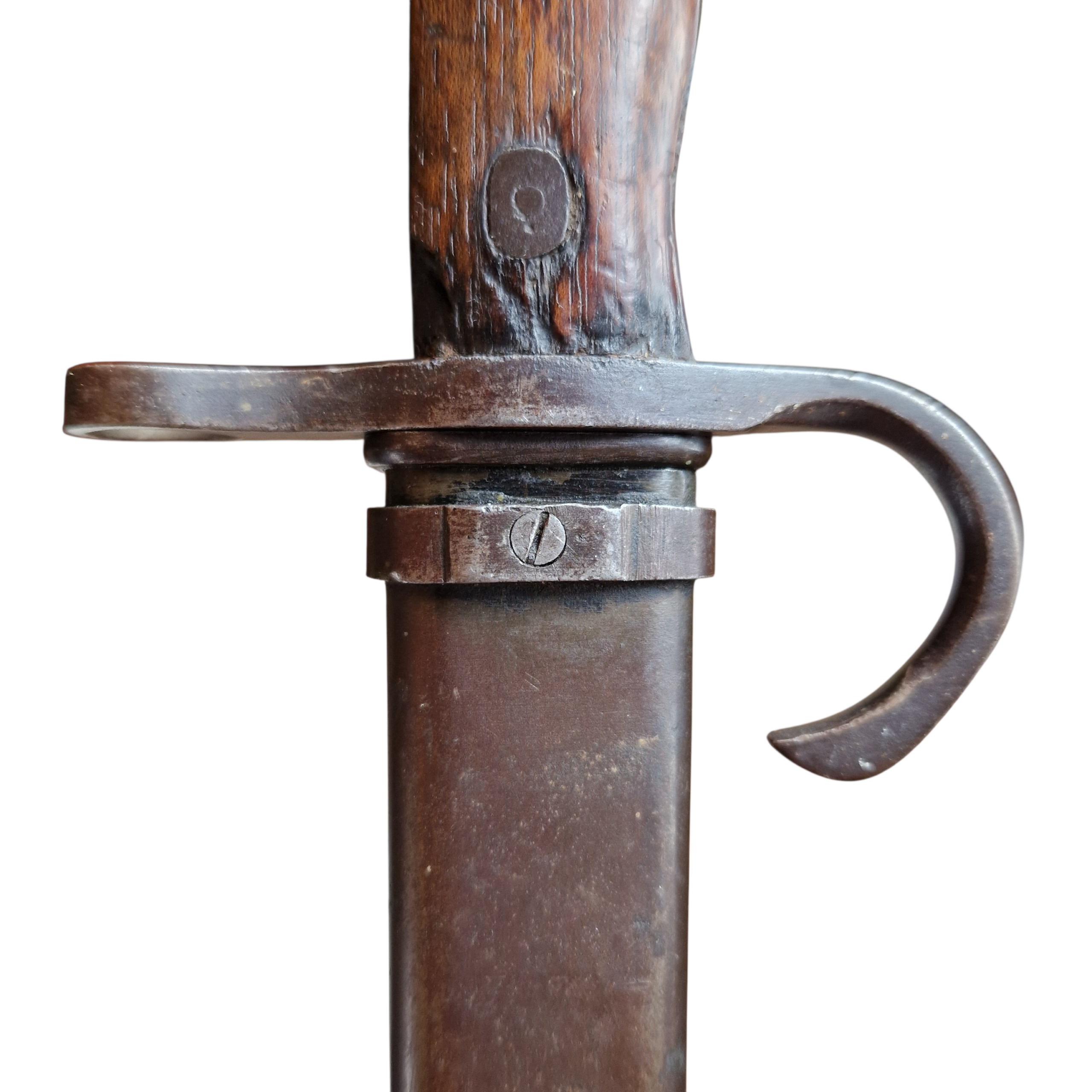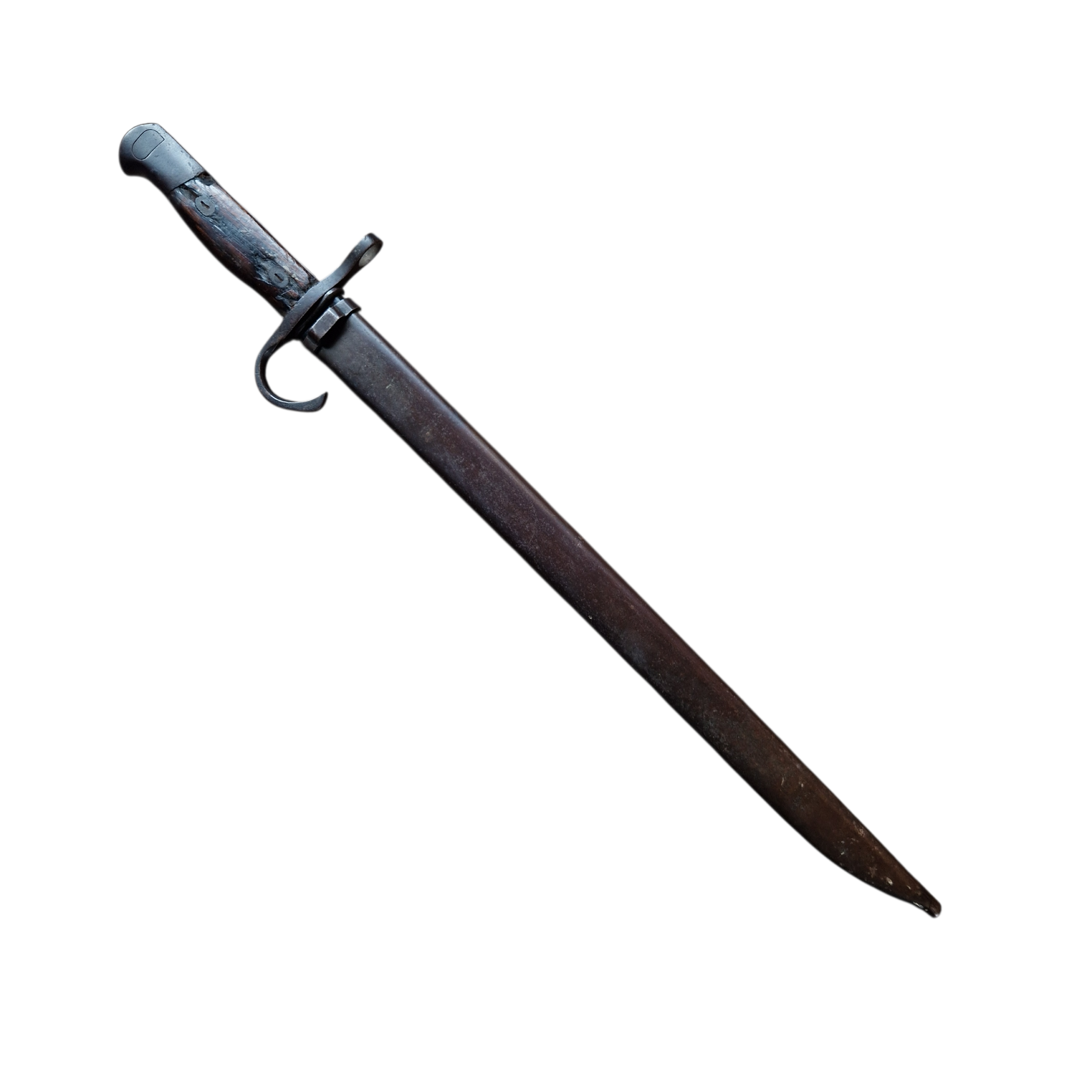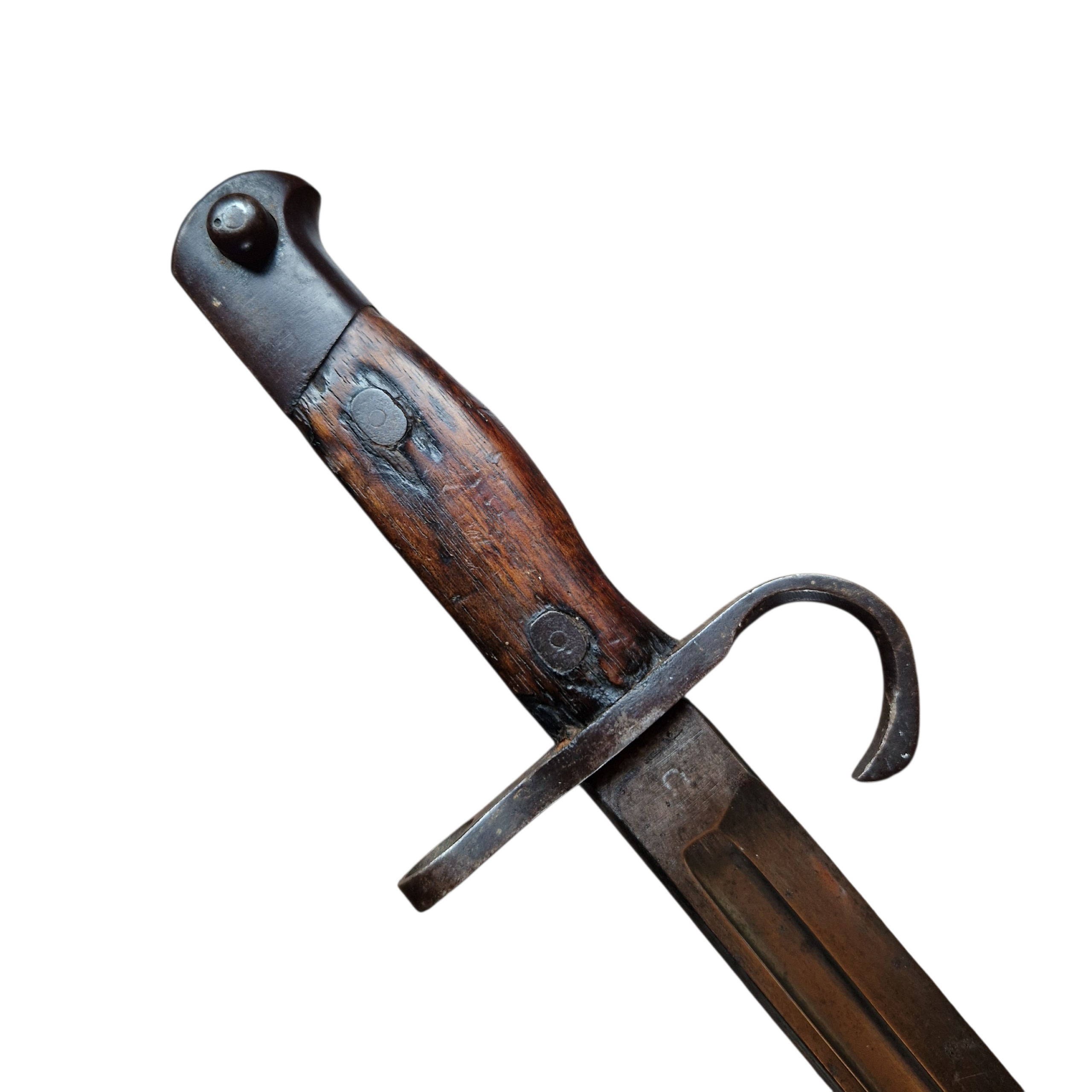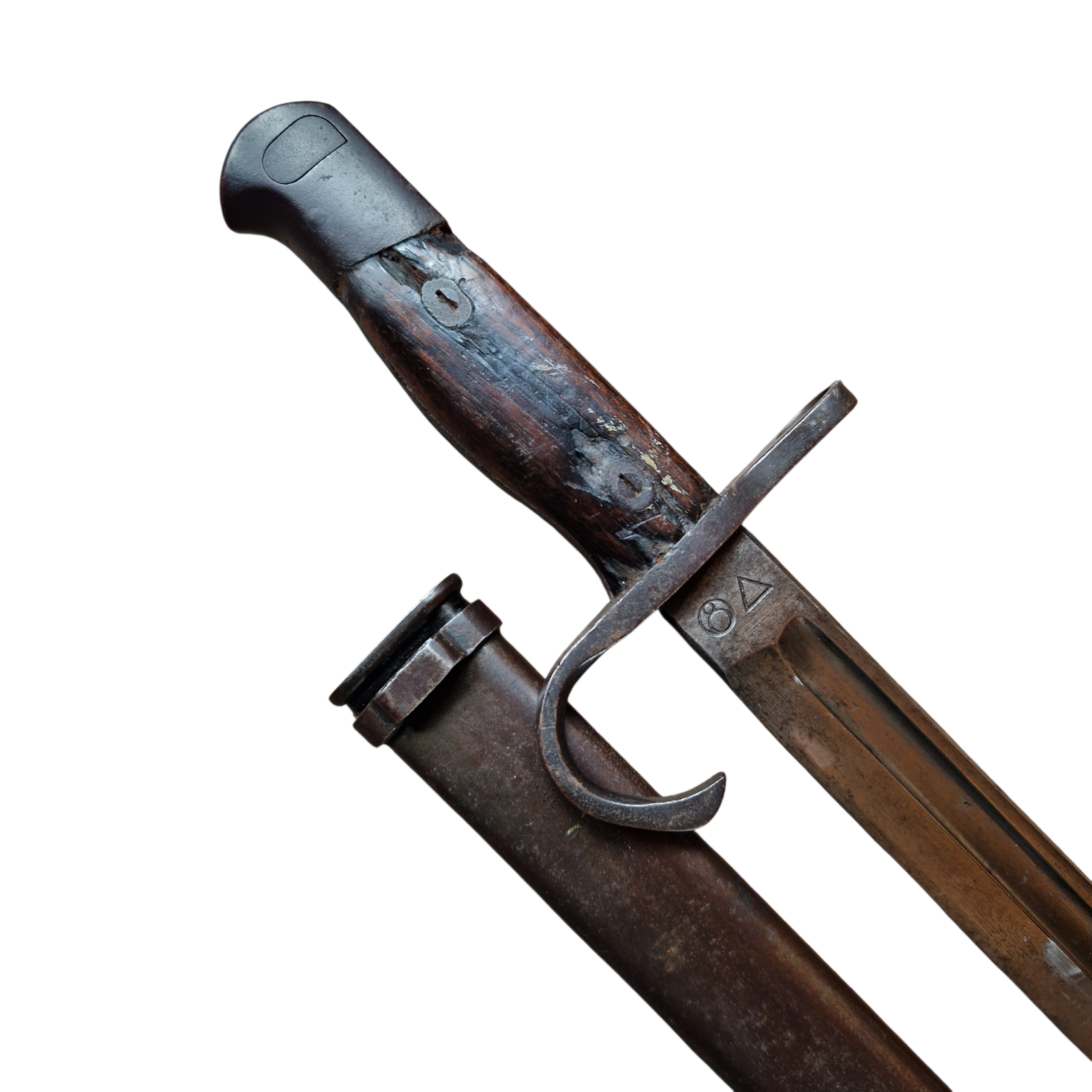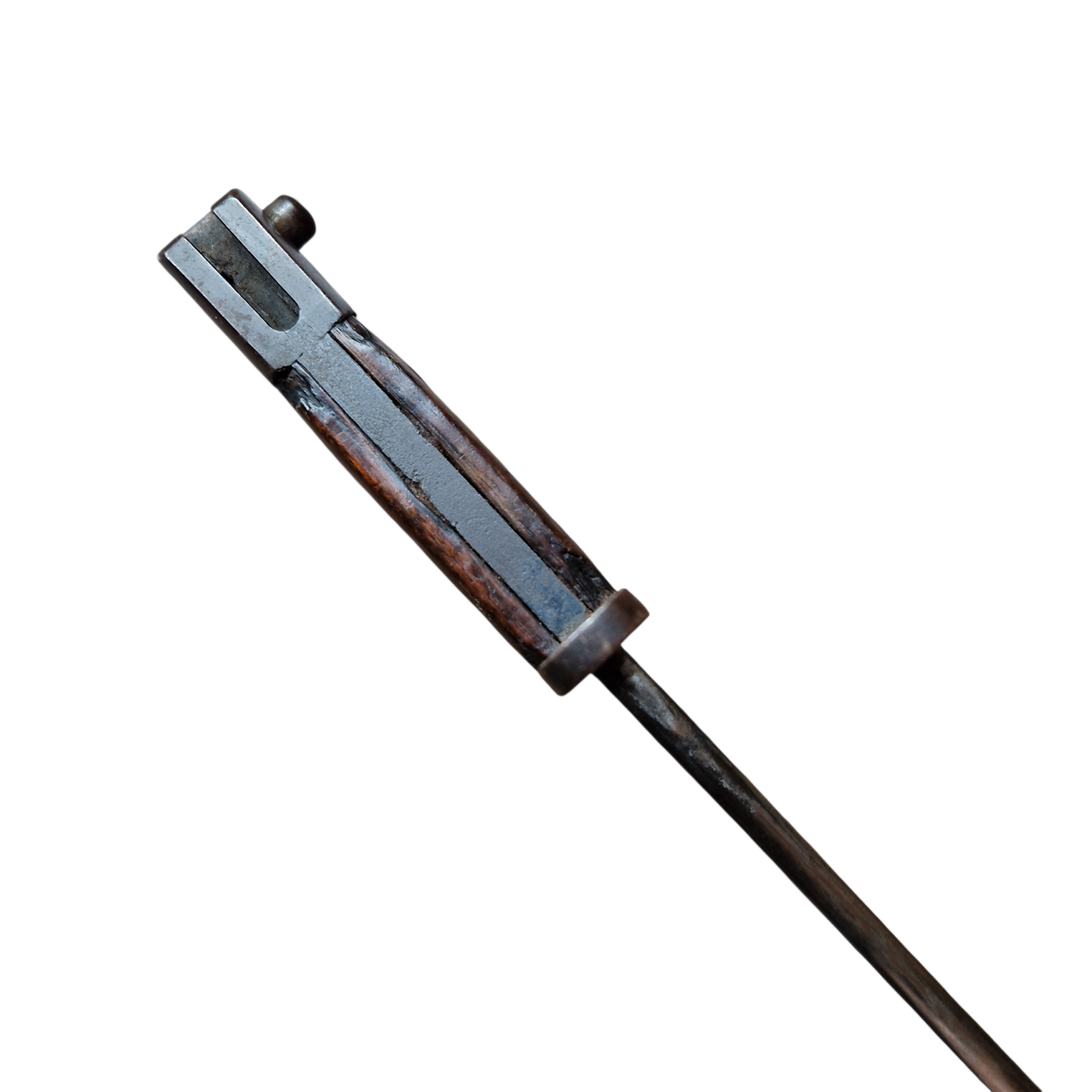 Bagnet japoński Arisaka producent Rikugun Zoheisho Nagoya Kosho aisan KOGYO, bagnet w bardzo dobrym stanie, bez ingerencji, stan zupełnie naturalny, drobne ubytki w okładkach rękojeści z epoki, pochewka oryginalna bez zagnieceń , zatrzask, dławik sprawne.