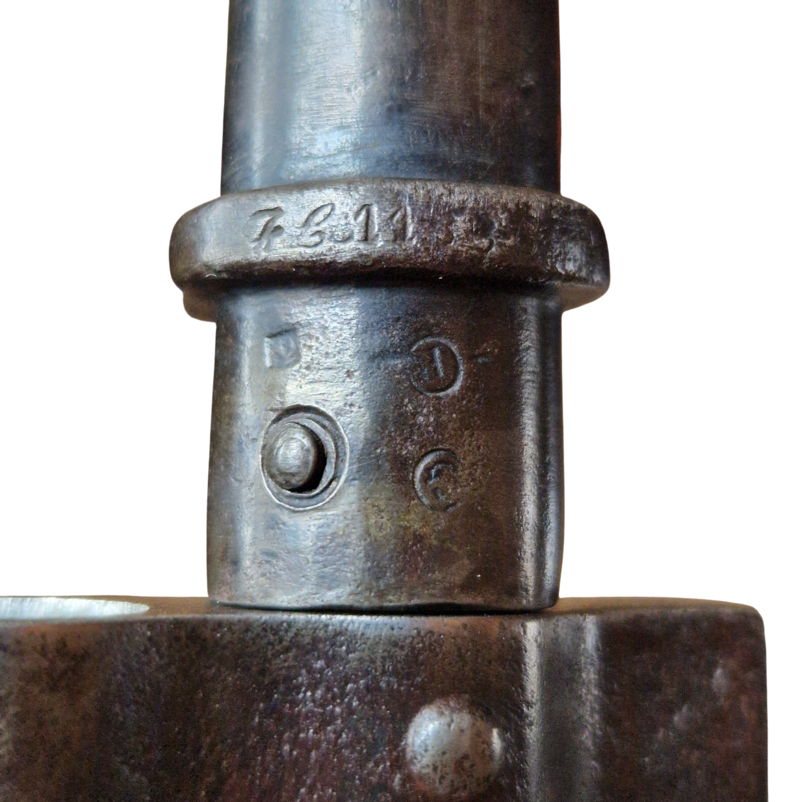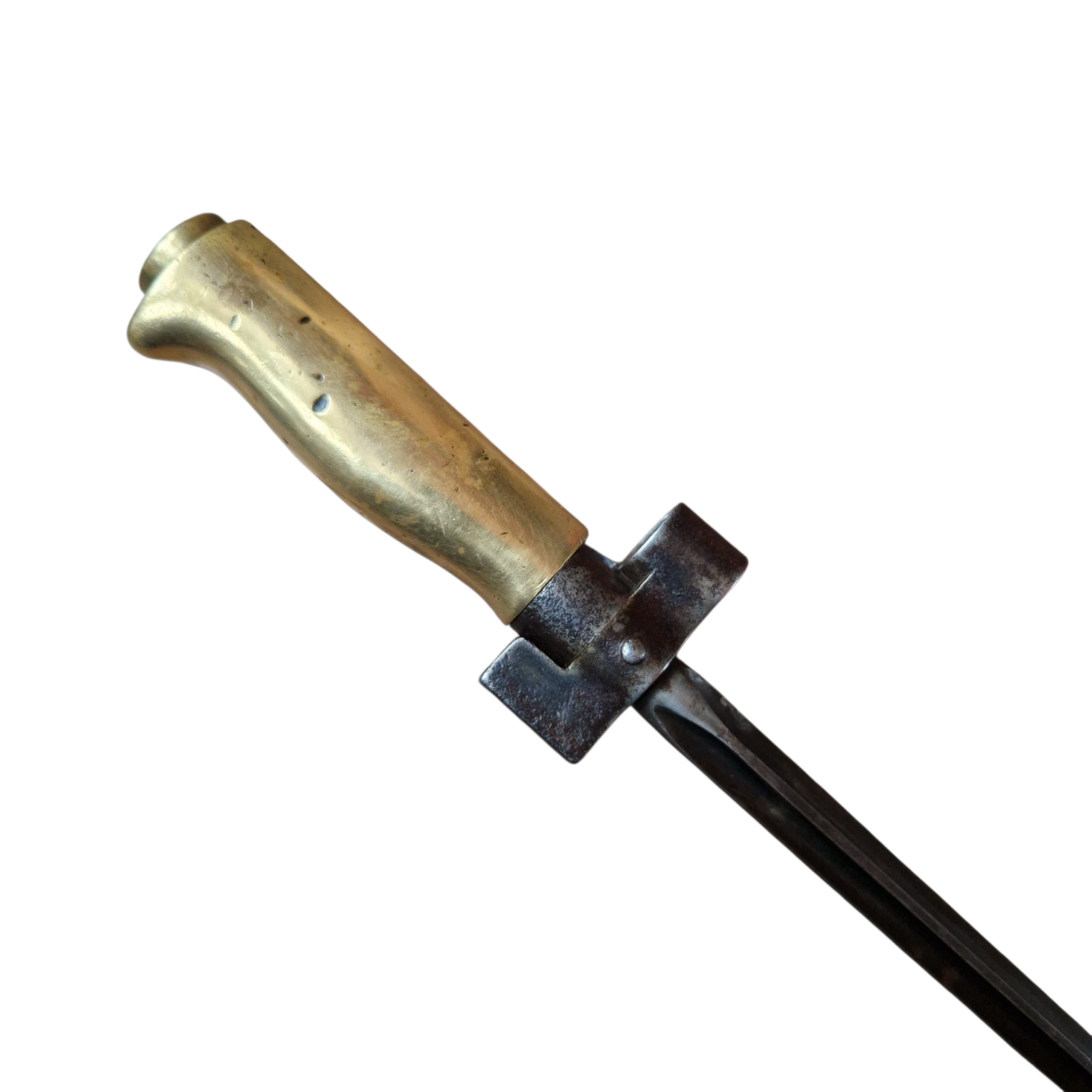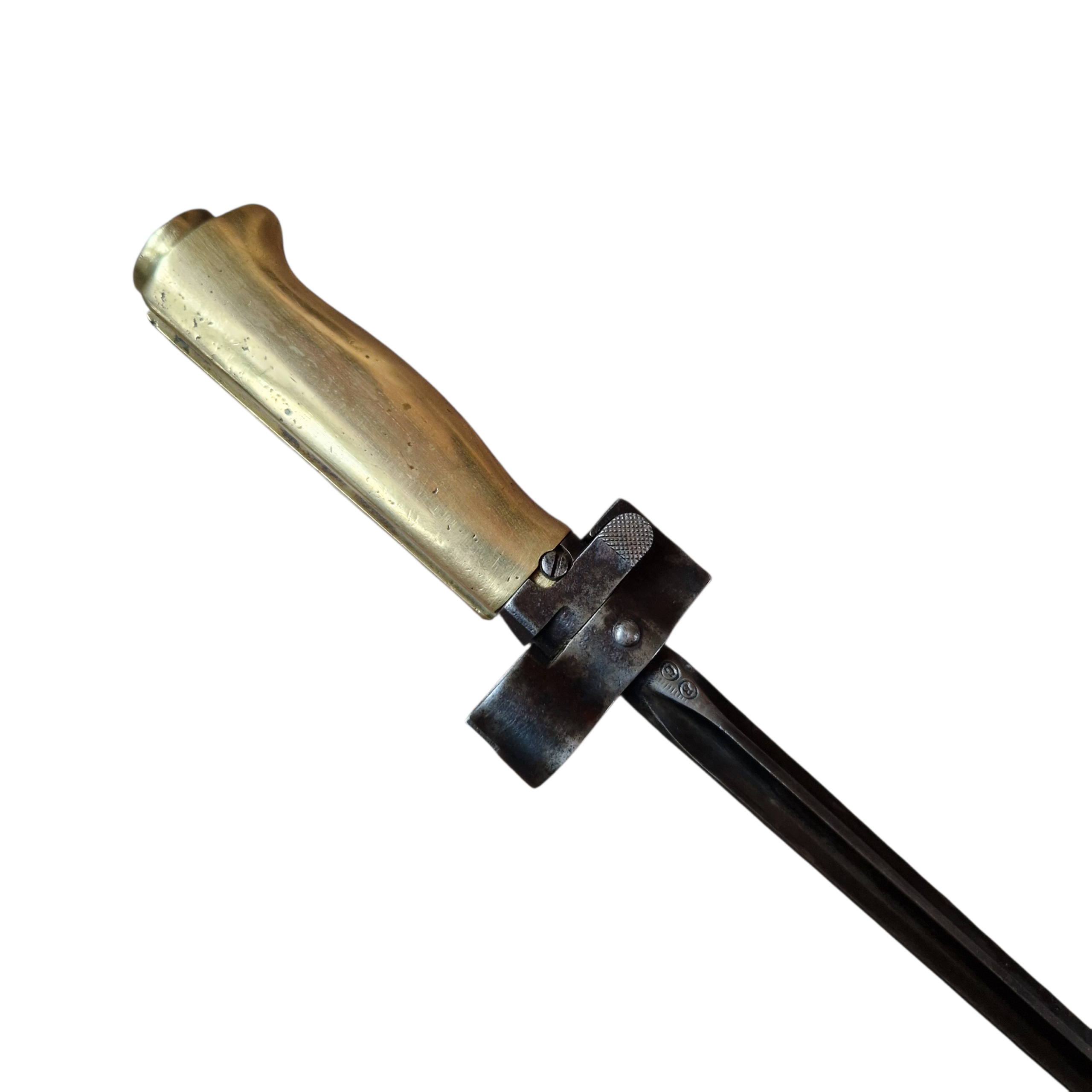 Bagnet typu Lebel [ Mle 1886] bagnet SKRÓCONY, rękojeść mosiężna, jelec jak i głownia bagnetu w CZARNEJ OKSYDZIE, zakończenie pochewki- nitowana gałka- widoczna na zdjęciu świadczy o tym że bagnet został przejęty przez Niemców zapewne skrócony i po oksydowany, bez cech odbiorów Niemieckich, bardzo ładny stan bagnetu, wręcz kolekcjonerski, wszystko sprawne, ostatnie zdjęcie przedstawia porównanie długości do standardowego Lebela.