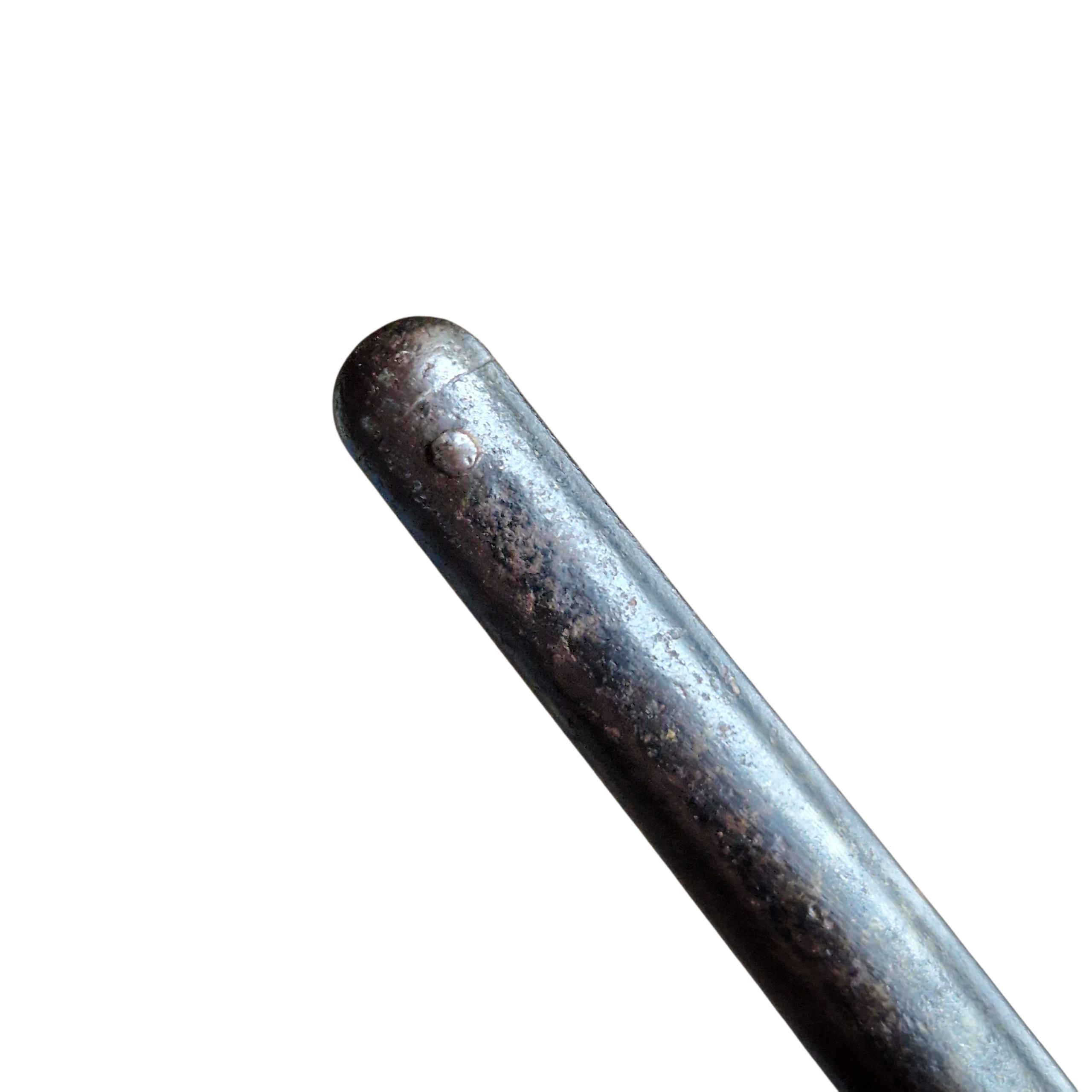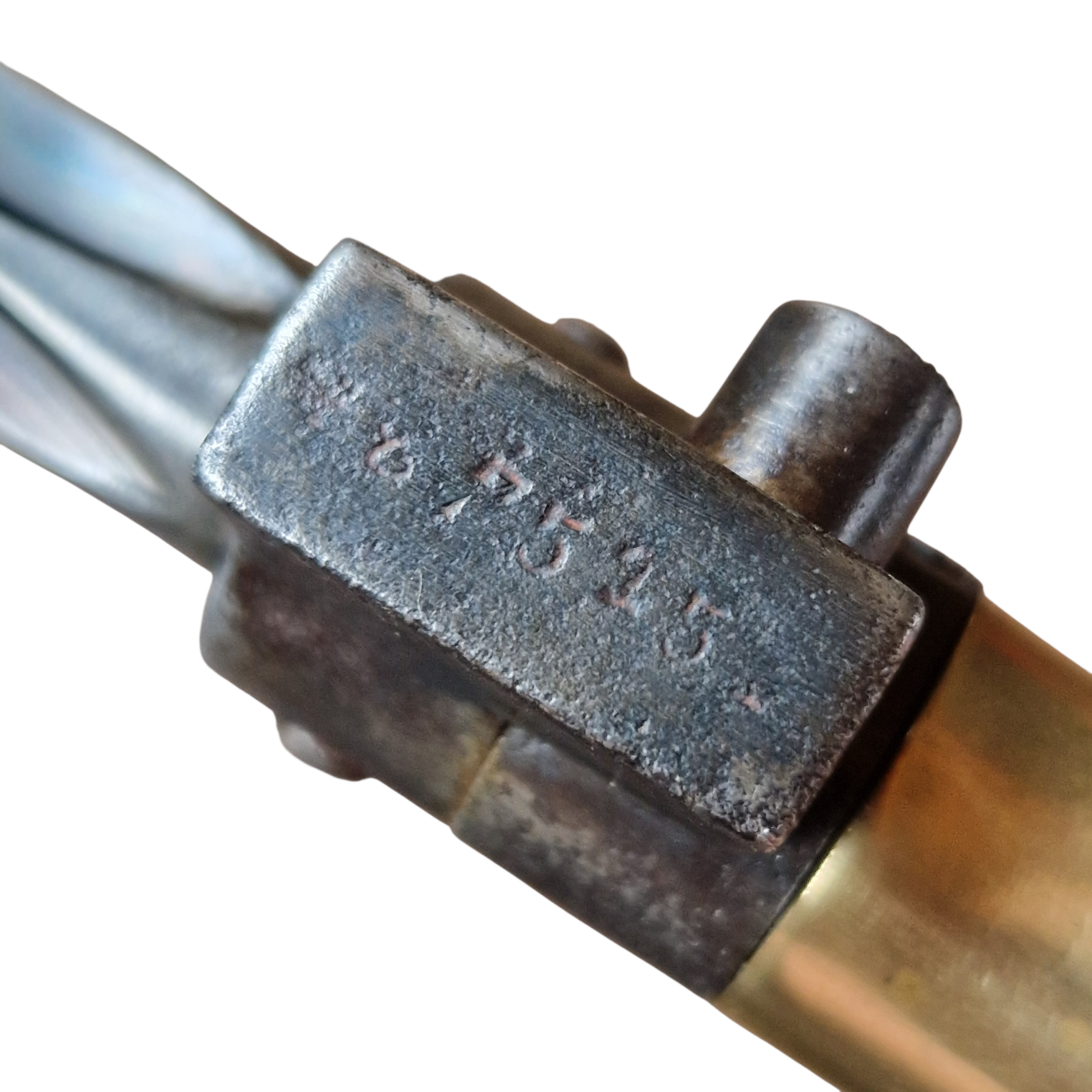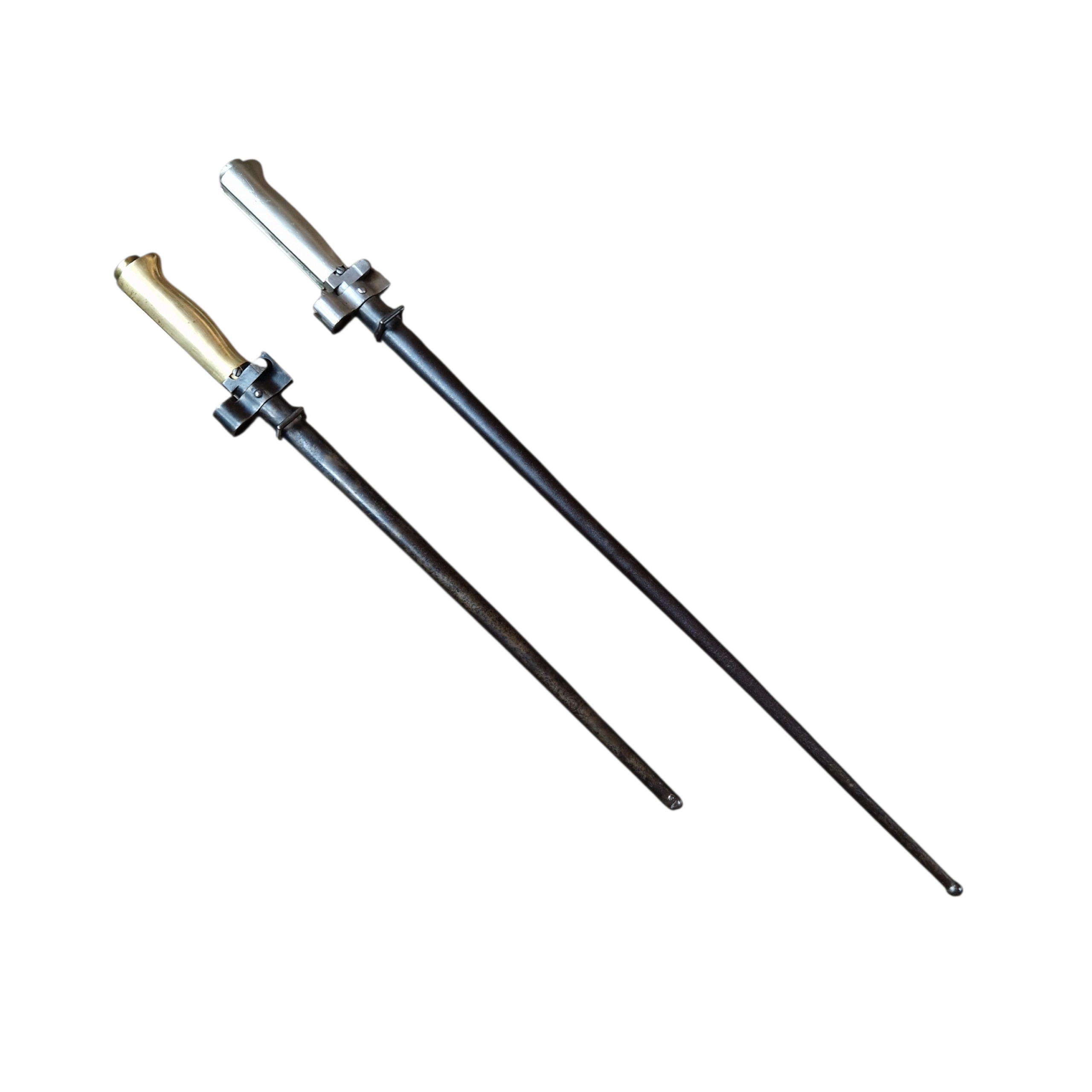Bagnet typu Lebel [ Mle 1886] bagnet SKRÓCONY, rękojeść mosiężna, jelec jak i głownia bagnetu w CZARNEJ OKSYDZIE, zakończenie pochewki- nitowana gałka- widoczna na zdjęciu świadczy o tym że bagnet został przejęty przez Niemców zapewne skrócony i po oksydowany, bez cech odbiorów Niemieckich, bardzo ładny stan bagnetu, wręcz kolekcjonerski, wszystko sprawne, ostatnie zdjęcie przedstawia porównanie długości do standardowego Lebela.