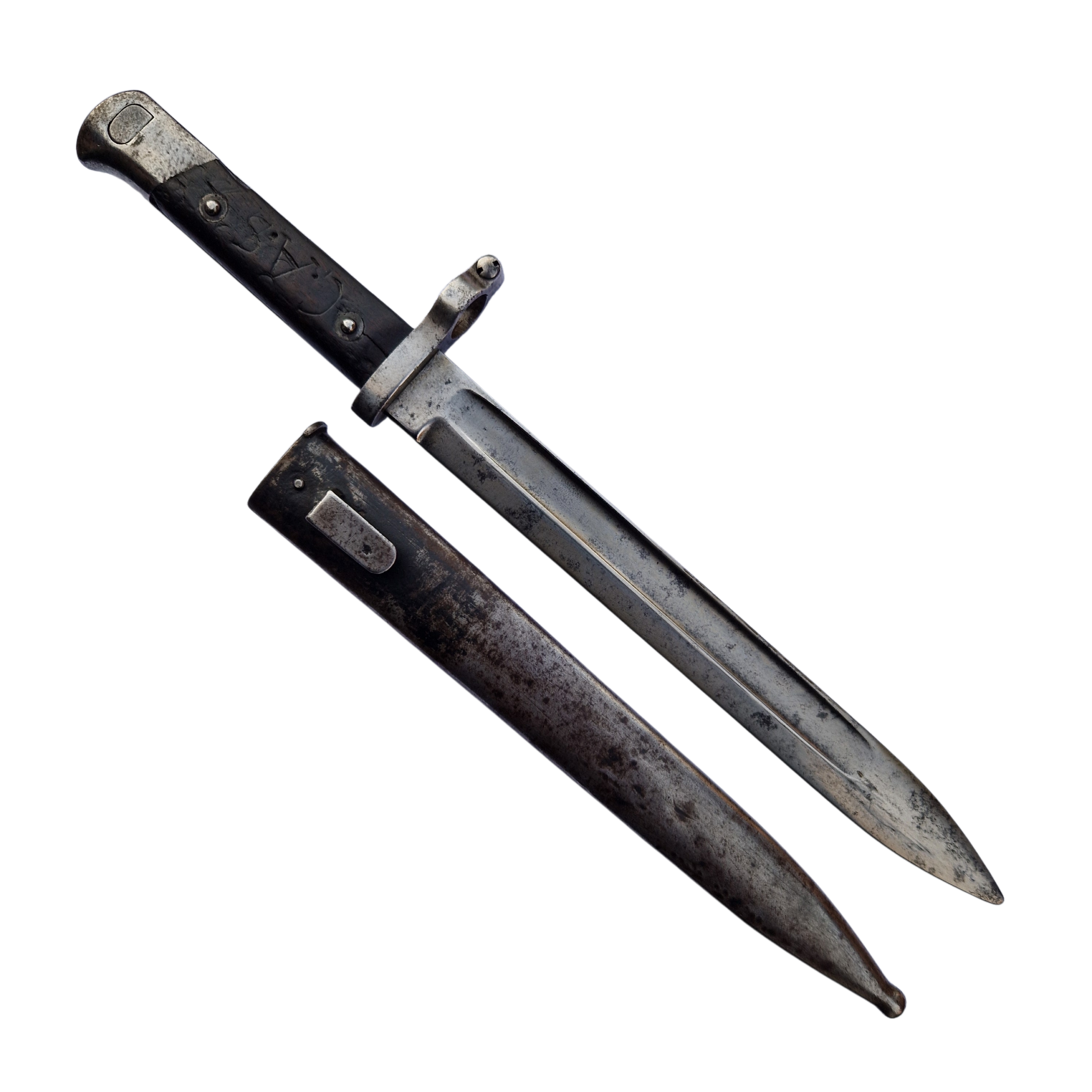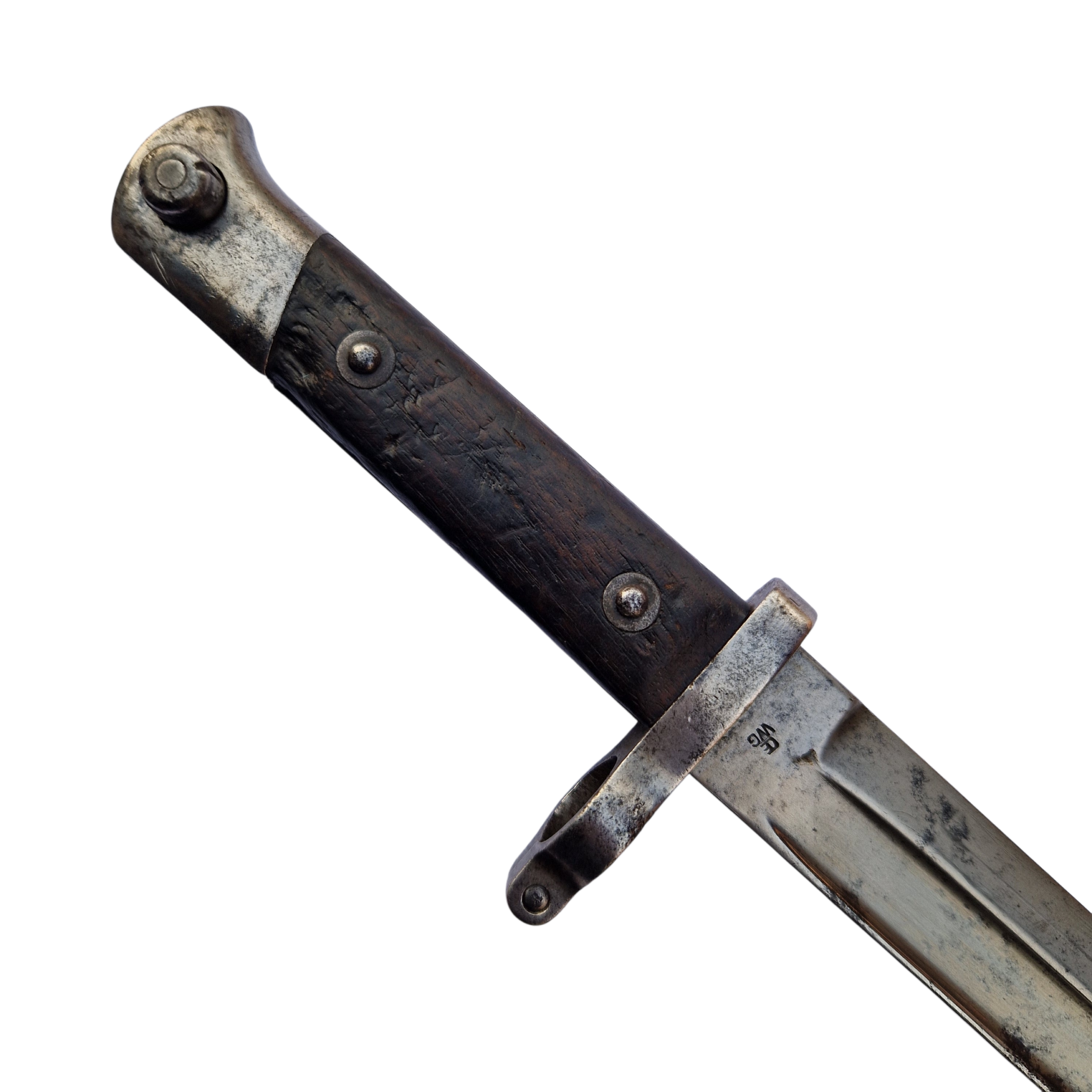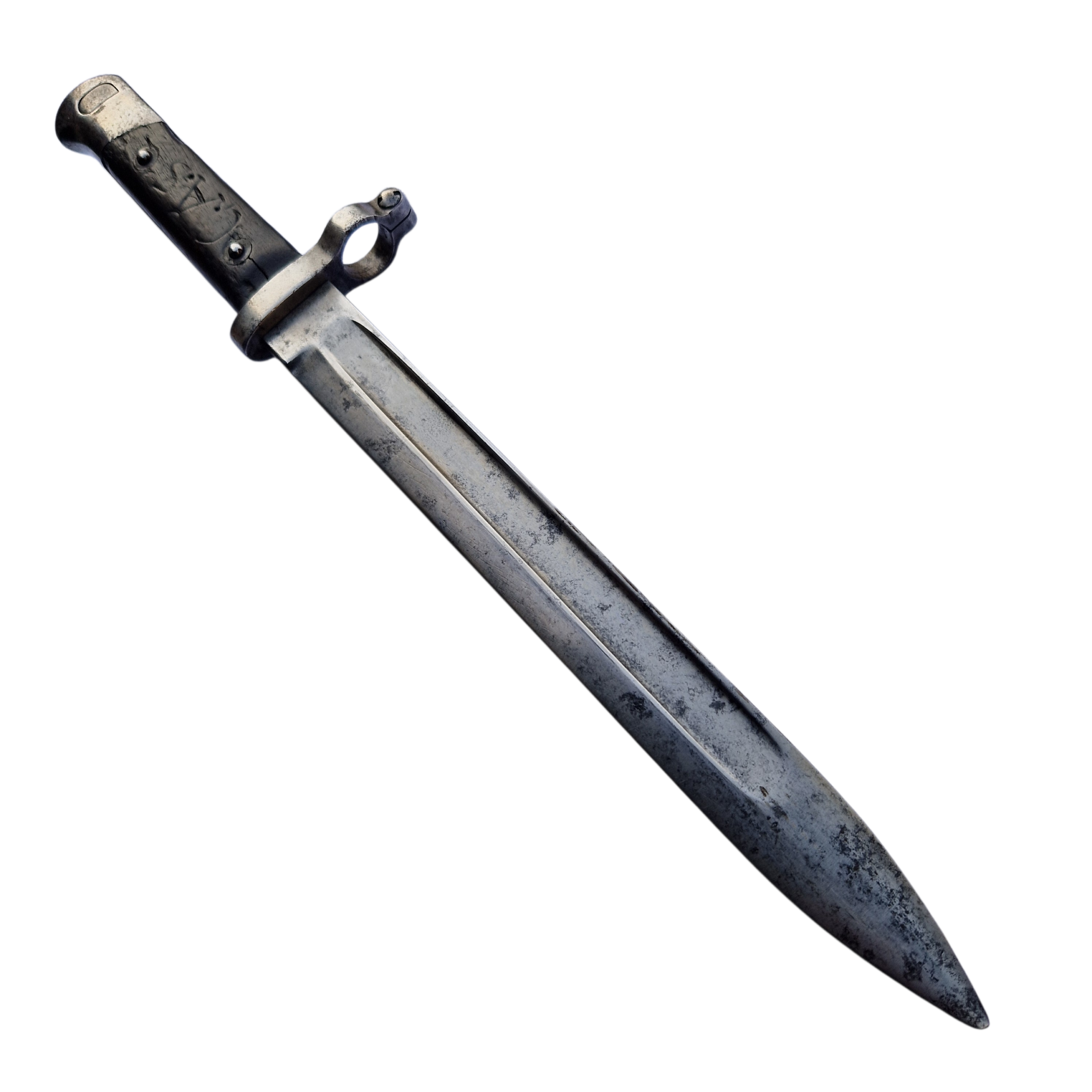 Bagnet Mannlicher wzór 1886, dość rzadki żołnierski bagnet w stanie dobrym +, pochwa niepozagniatana, bagnet jak i pochwa bez oznak dzisiejszej ingerencji, bagnet produkcji OEWG- Steyr, na okładce rękojeści wyryty napis z epoki; C.A.S. , bagnet wzór 1890/95 różnił się od bagnetu wzór 1886 tylko średnicą pierścienia jelca, przedstawiony bagnet ma średnicę 17,5 mm co świadczy ze jest to starszy wzór 1886. Zachęcamy do zakupu gdyż bagnet wzór 1886 jest coraz trudniejszy do zdobycia, szukamy obecnie od kilku tygodni na rynkach Austrii , Niemiec i Francji tego wzoru i niestety NIE MA. Na bagnet jest DARMOWA WYSYŁKA. Bagnety po wcześniejszym umówieniu można zobaczyć i zakupić w biurze naszej firmy.