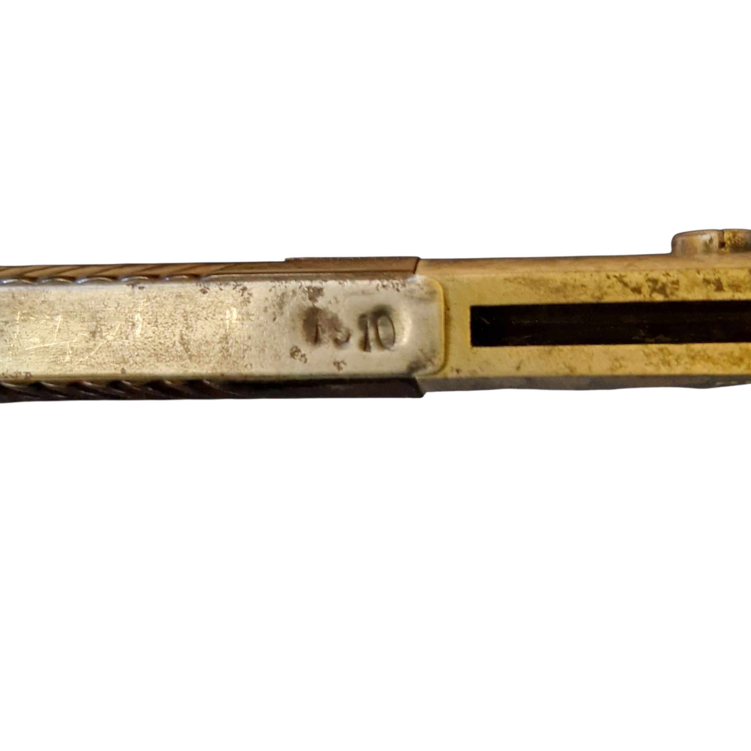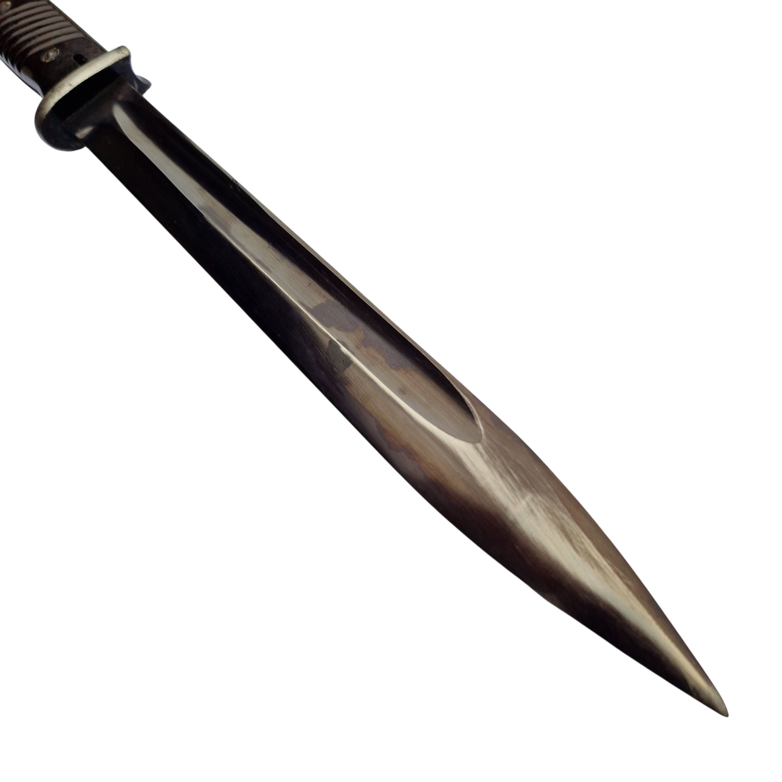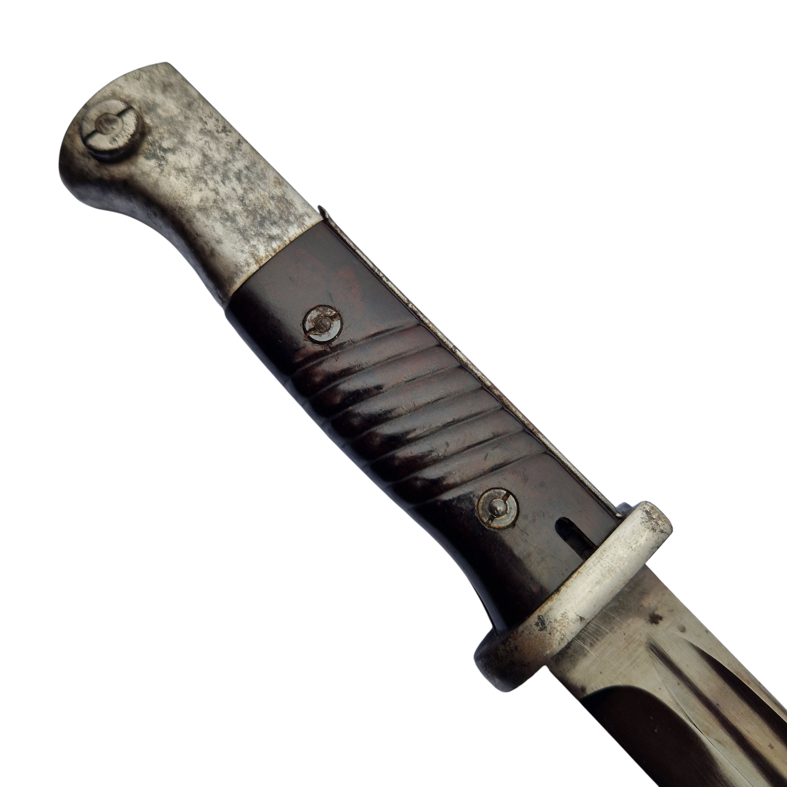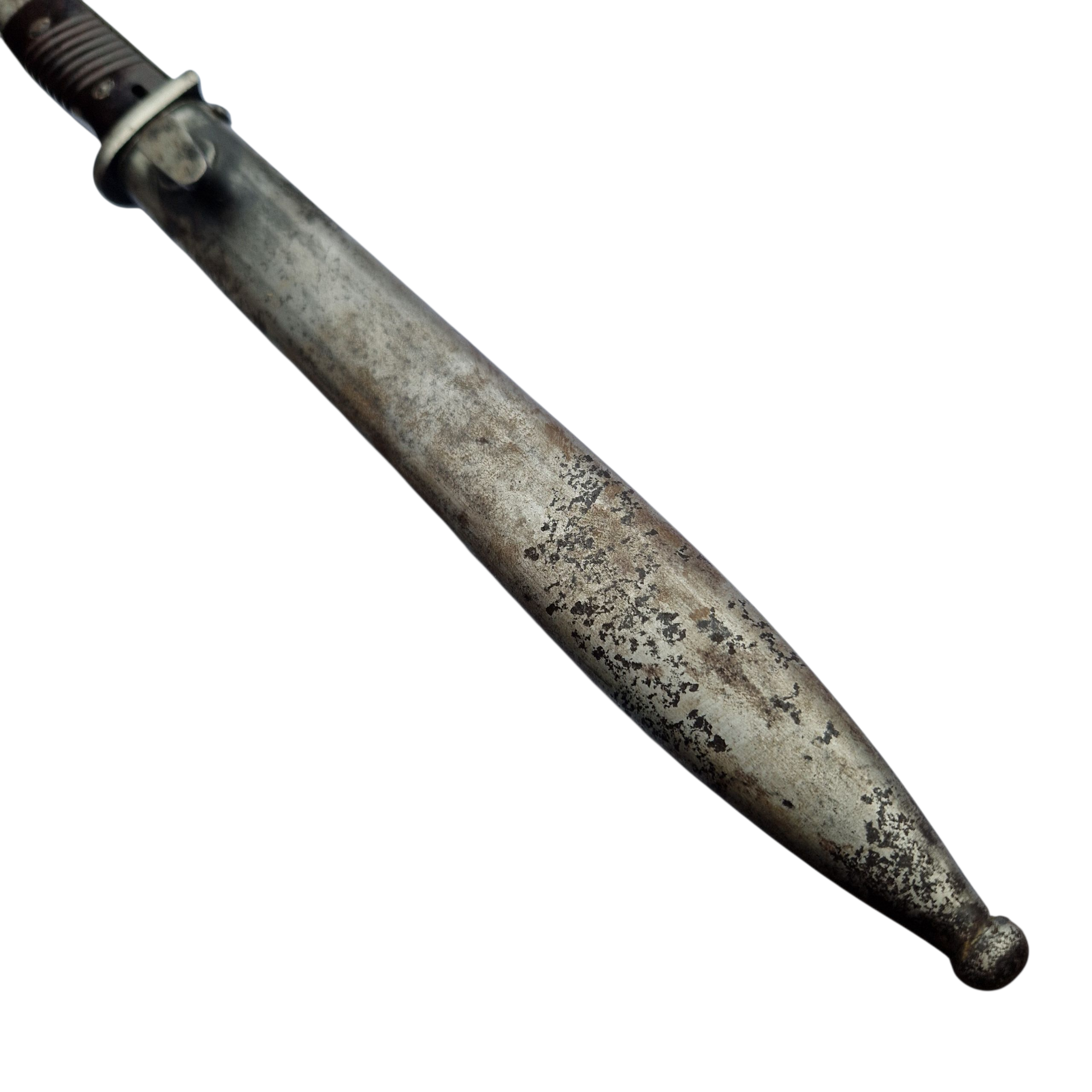 Bardzo ciekawy bagnet przynależność bagnetu niejasna, najprawdopodobniej jest to bagnet wyprodukowany pod koniec wojny tzw. „składak”, głownia w pięknie zachowanej oksydzie kolor oksydy przebija w fiolet , okładki bakelit mieszany brązowy i czarny, jedyne oznaczenia na bagnecie na osłonie ogniowej wybity numer 1910, następnie na zatrzasku numer 9949, widoczne tylko po wciśnięciu zatrzasku, bagnet w stanie bardzo dobrym+, pochwa bez zagięć, zatrzask trzyma,
