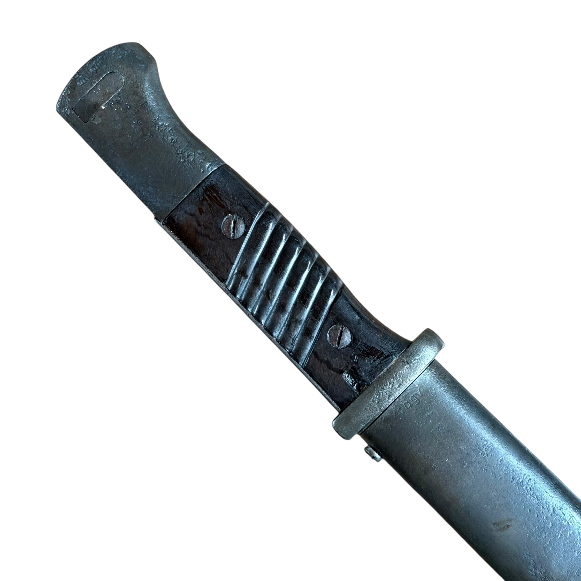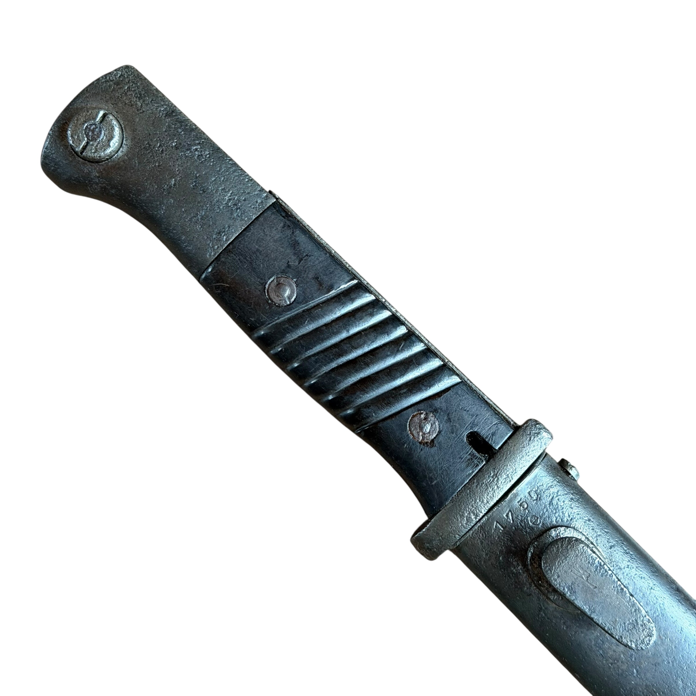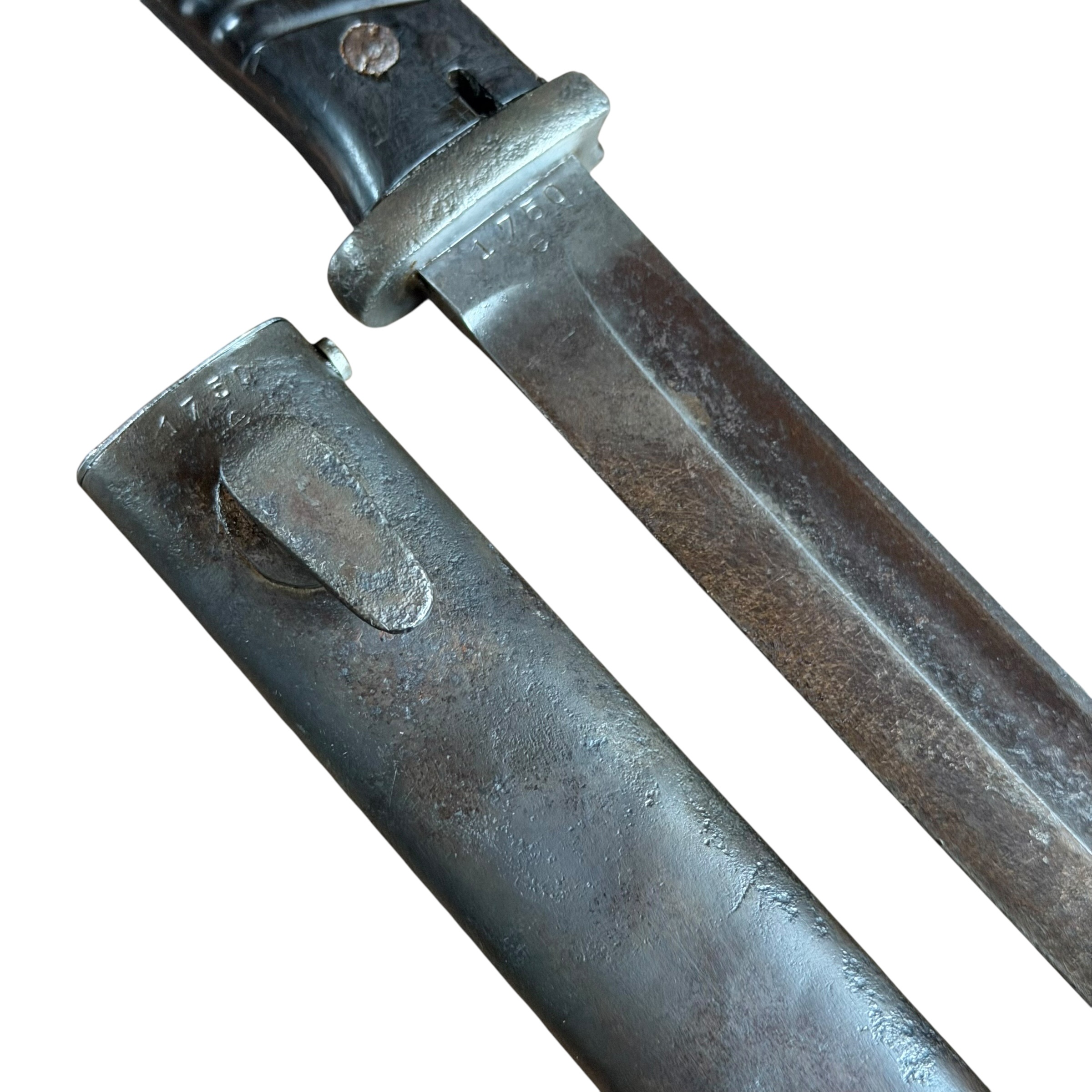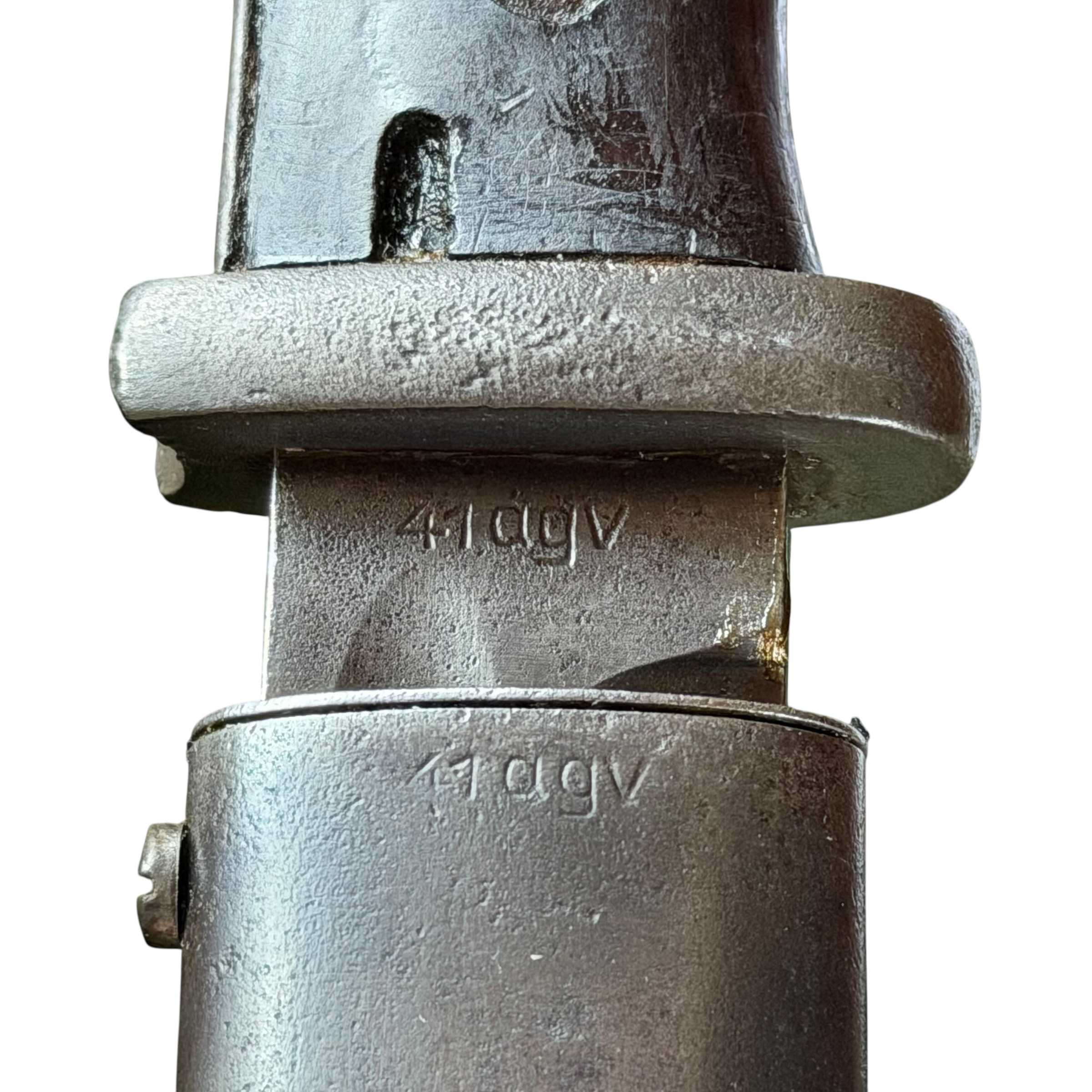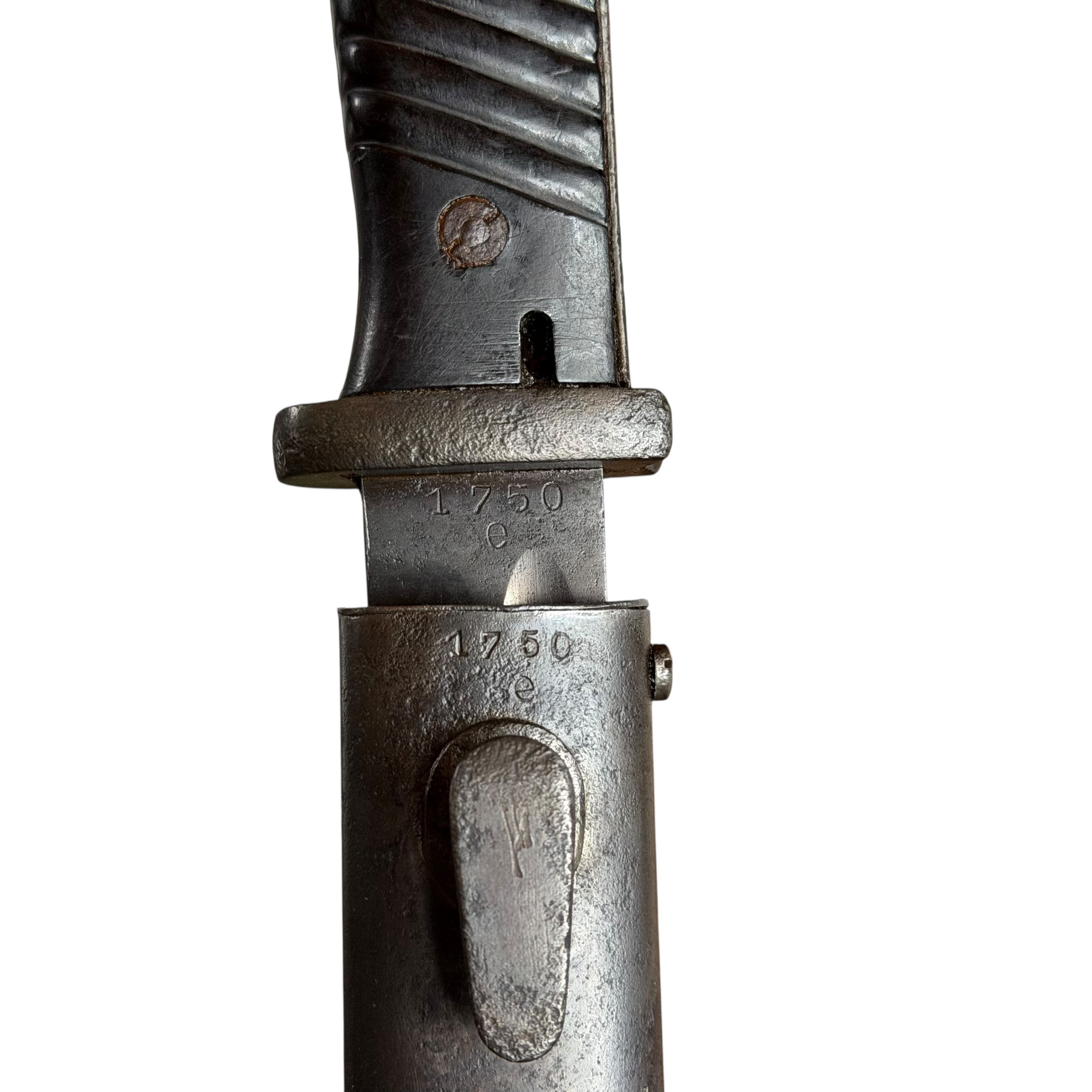 Bagnet mauser s84/98 ZGODNY, sygnowany numerem 1750 e, producent Berg&Co, Solingen-Ohligs kod: agv, pochwa posiada kilka malutkich wgnieceń, bagnet sygnowany Wafenamtami, bardzo klimatyczny bagnet w przyjemnym stanie