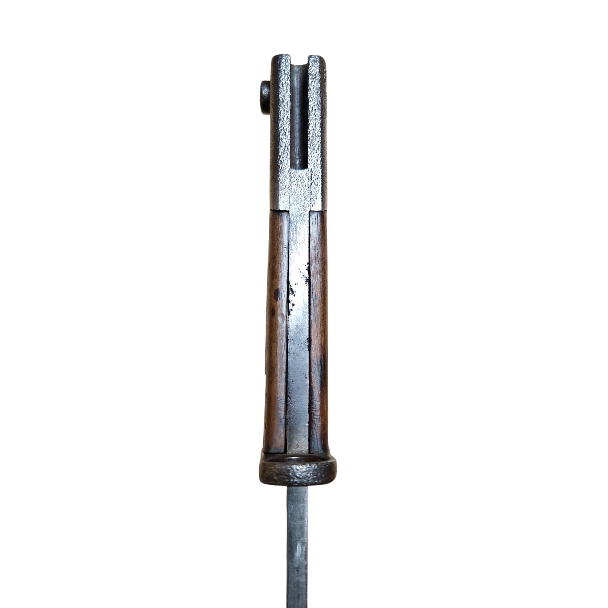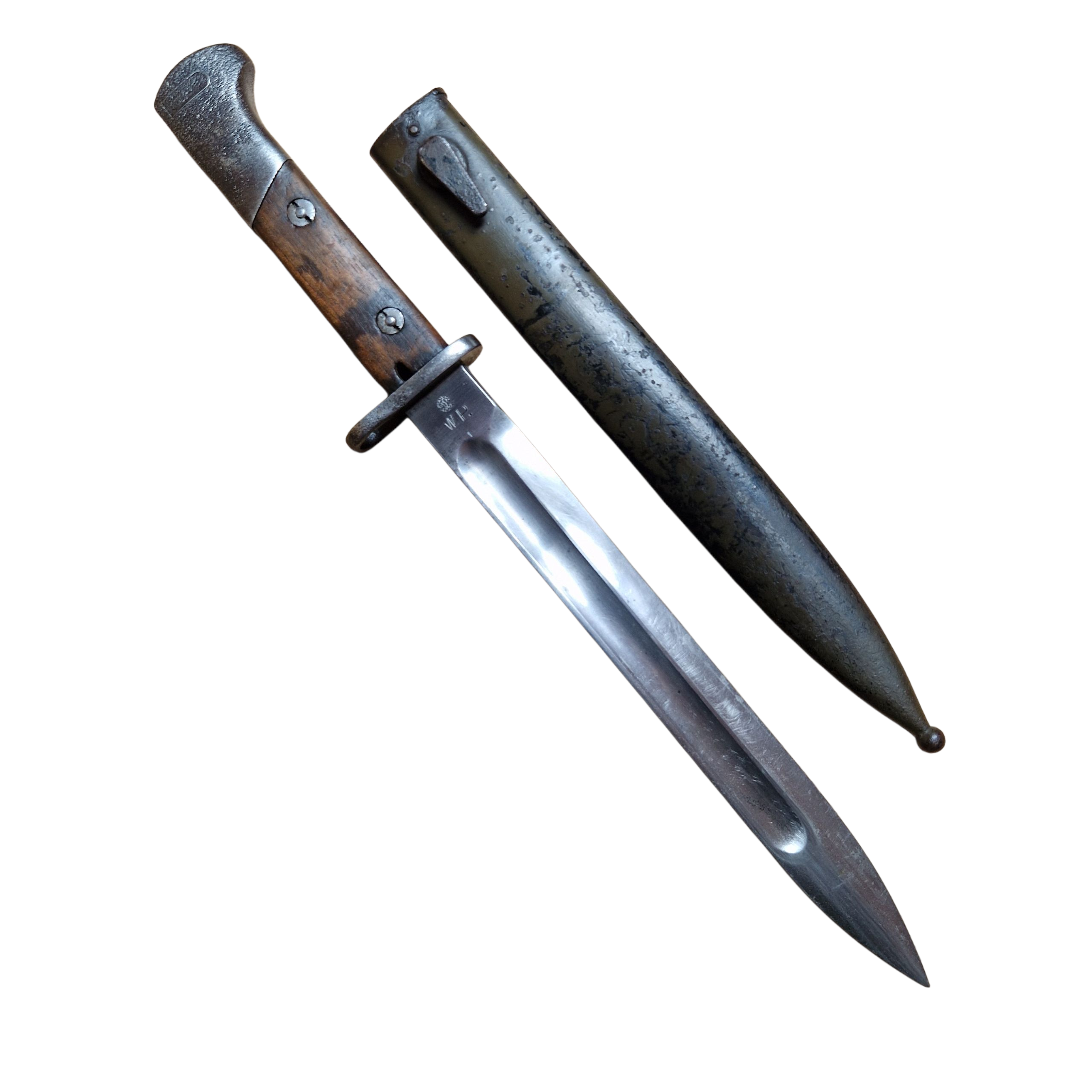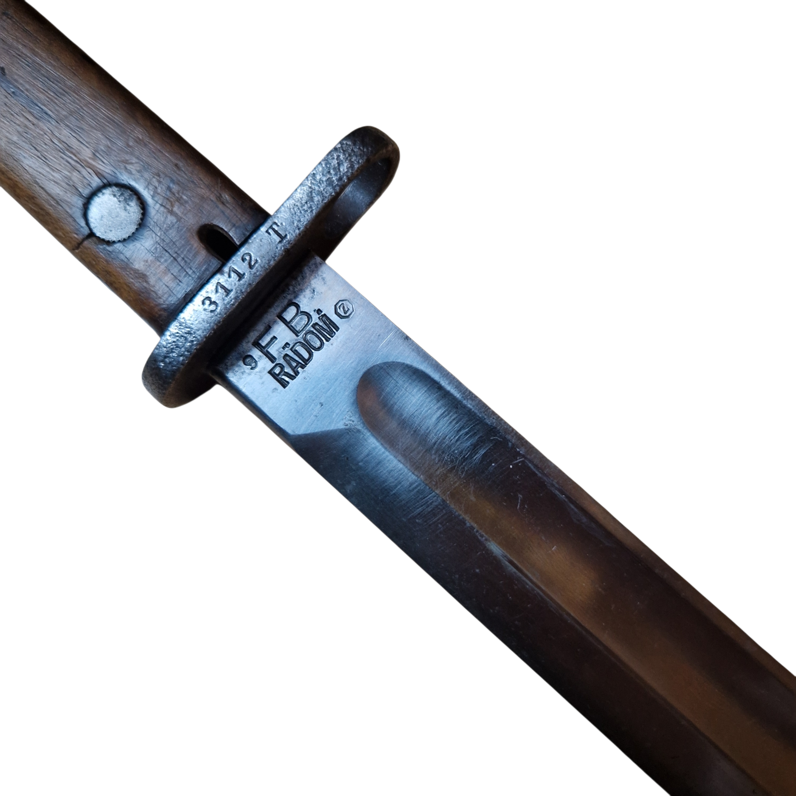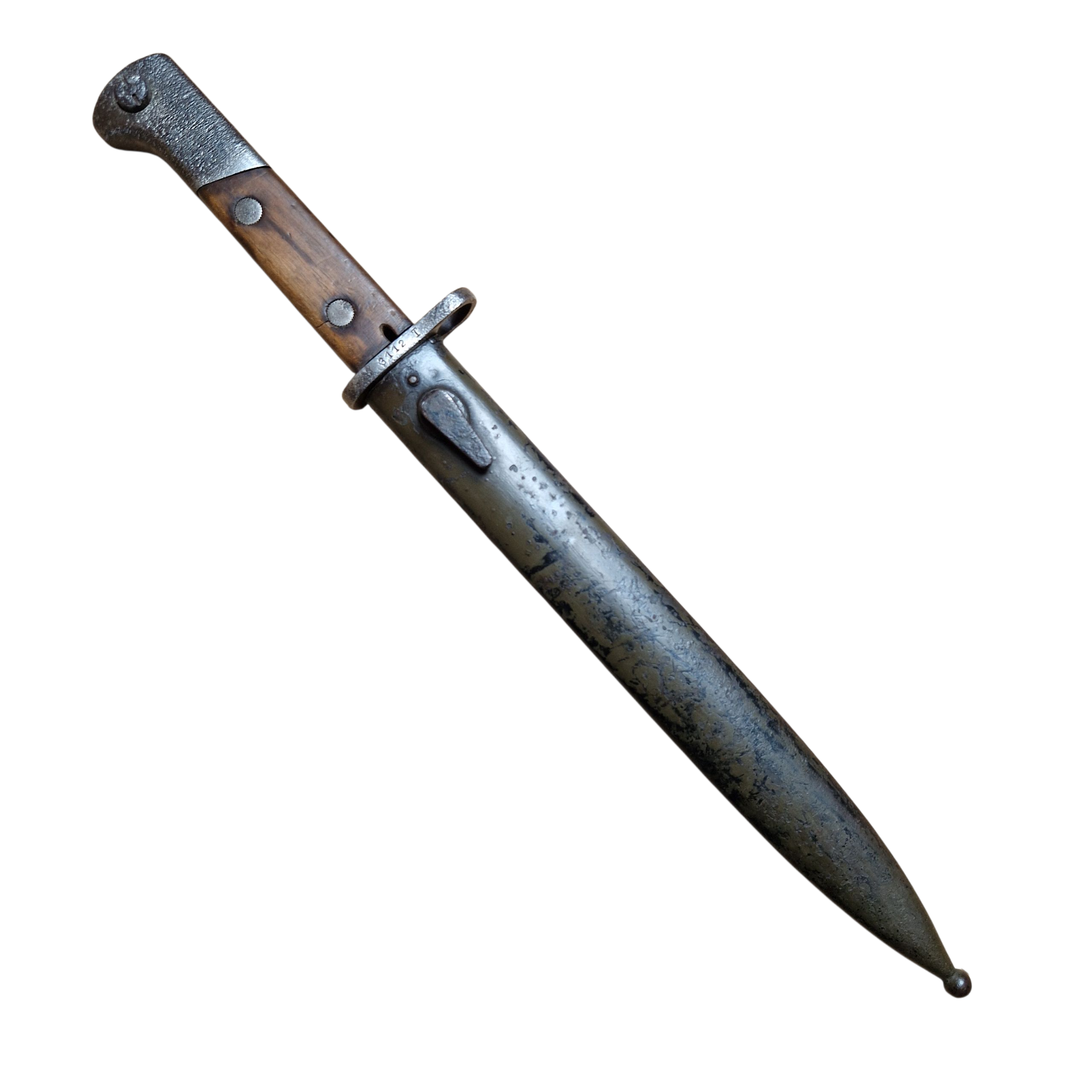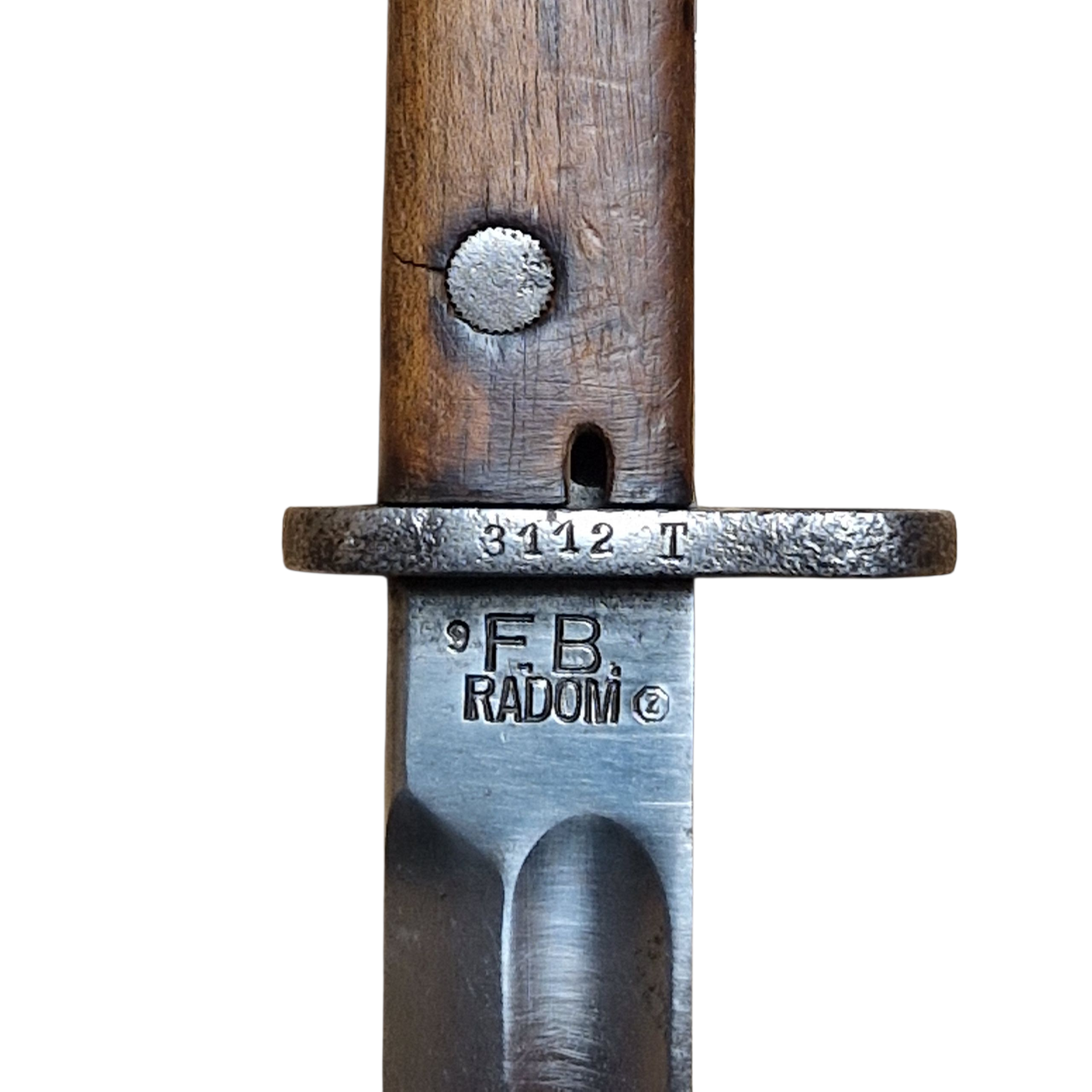 Bagnet Polski wzór 29, produkcji Fabryki Broni w Radomiu z odbiorem Z wraz z pochwą w oryginalnym malowaniu khaki, sygnowana przy tylnym nicie GG?, osobno N i osobno V , na progu cyfra 9 przy F.B.RADOM , na jelcu numer 3112T , zatrzask sprawny , lekko wyczuwalny luz na okładce – bez znaczenia, bardzo ładny egzemplarz .