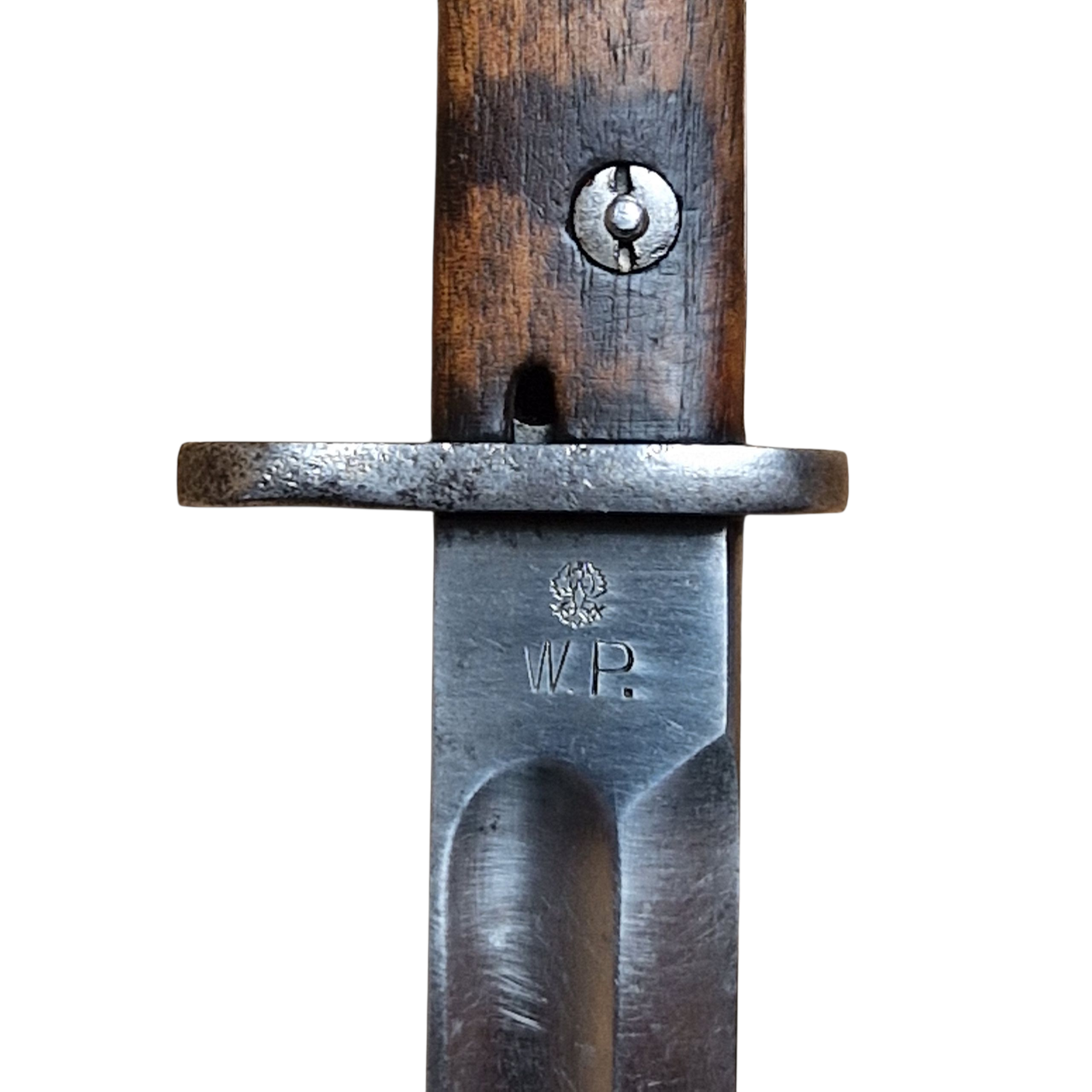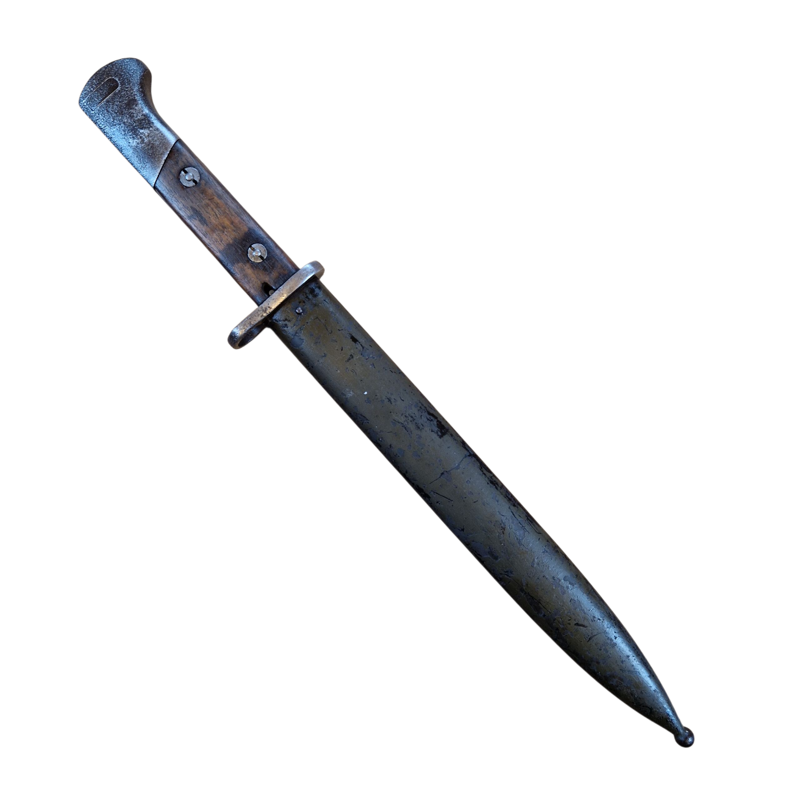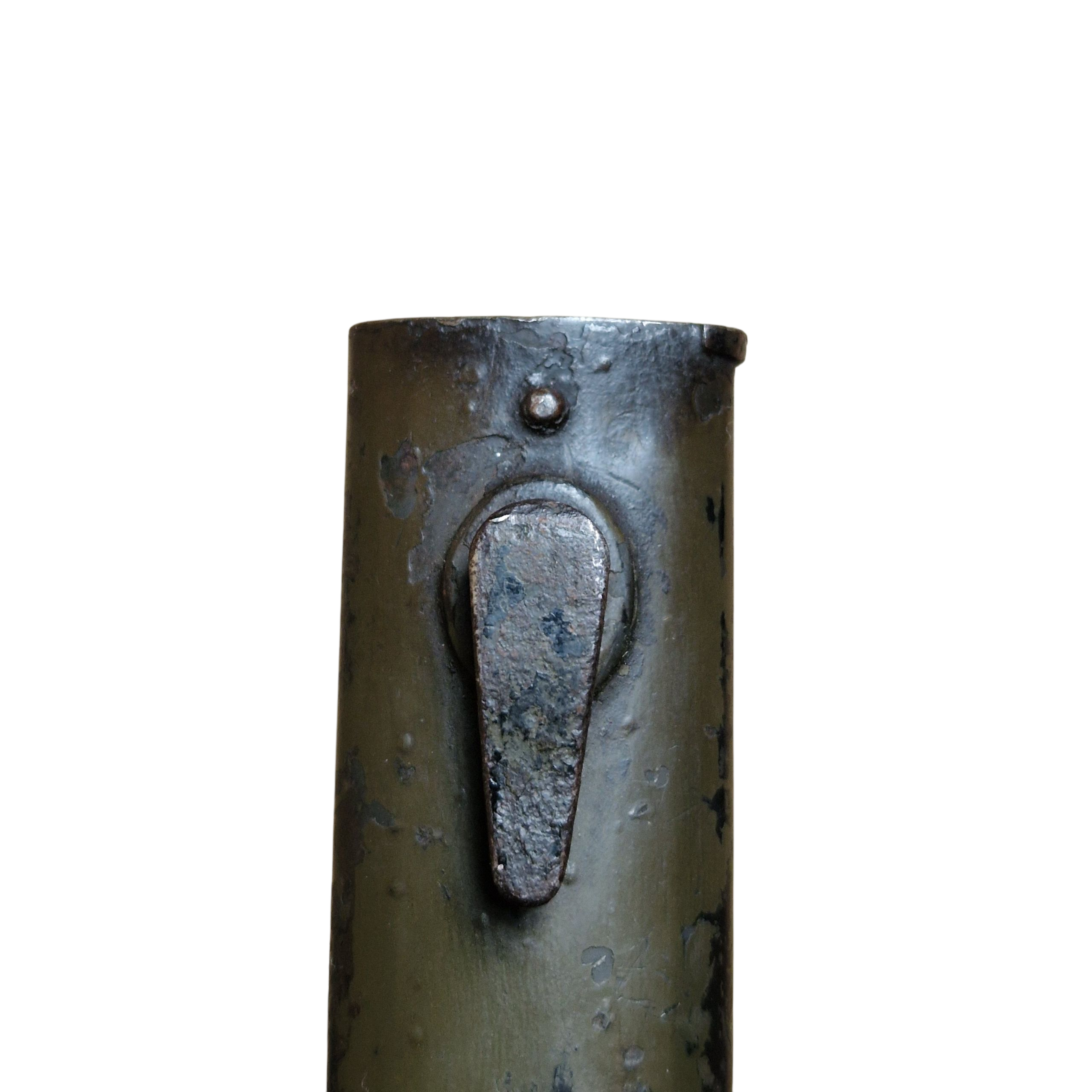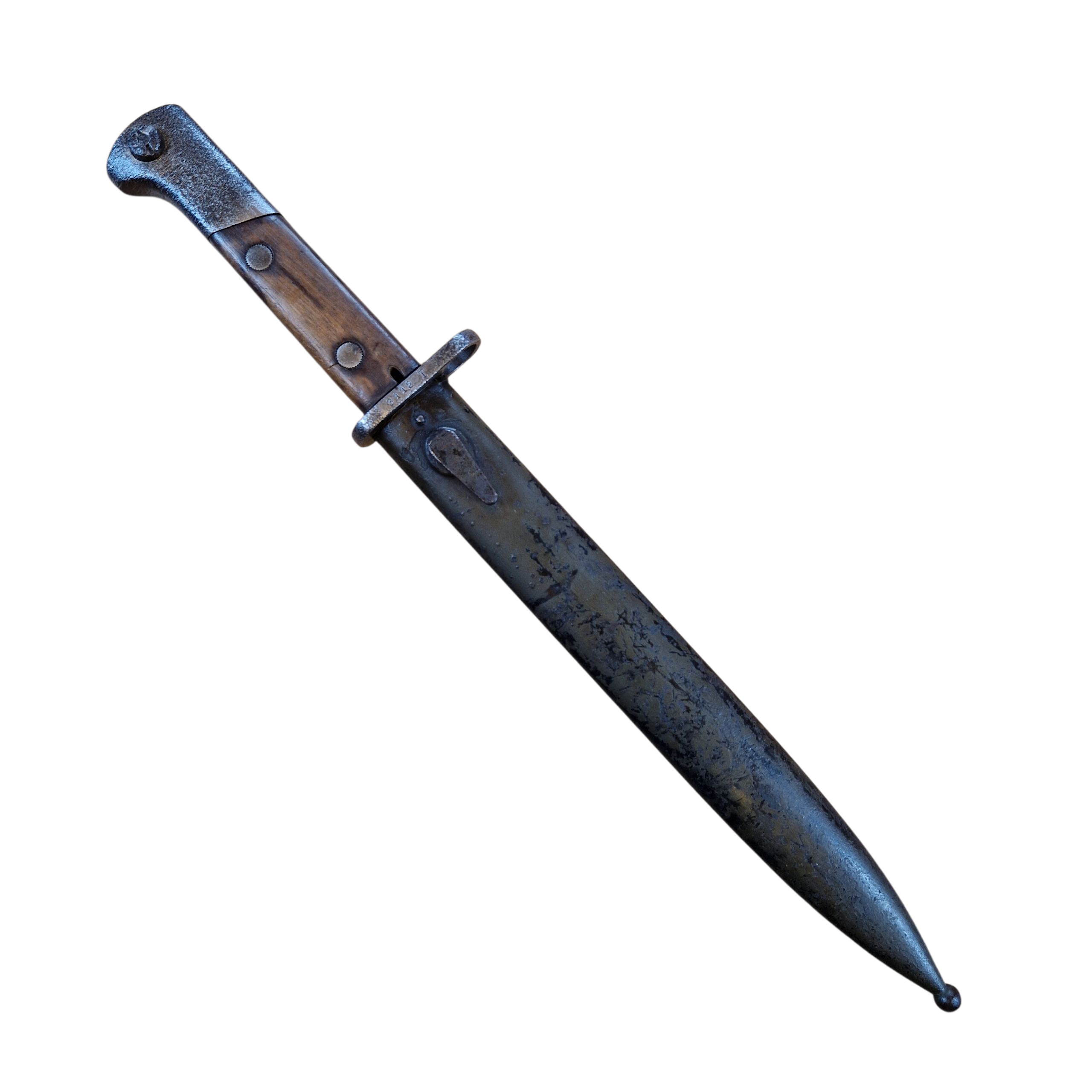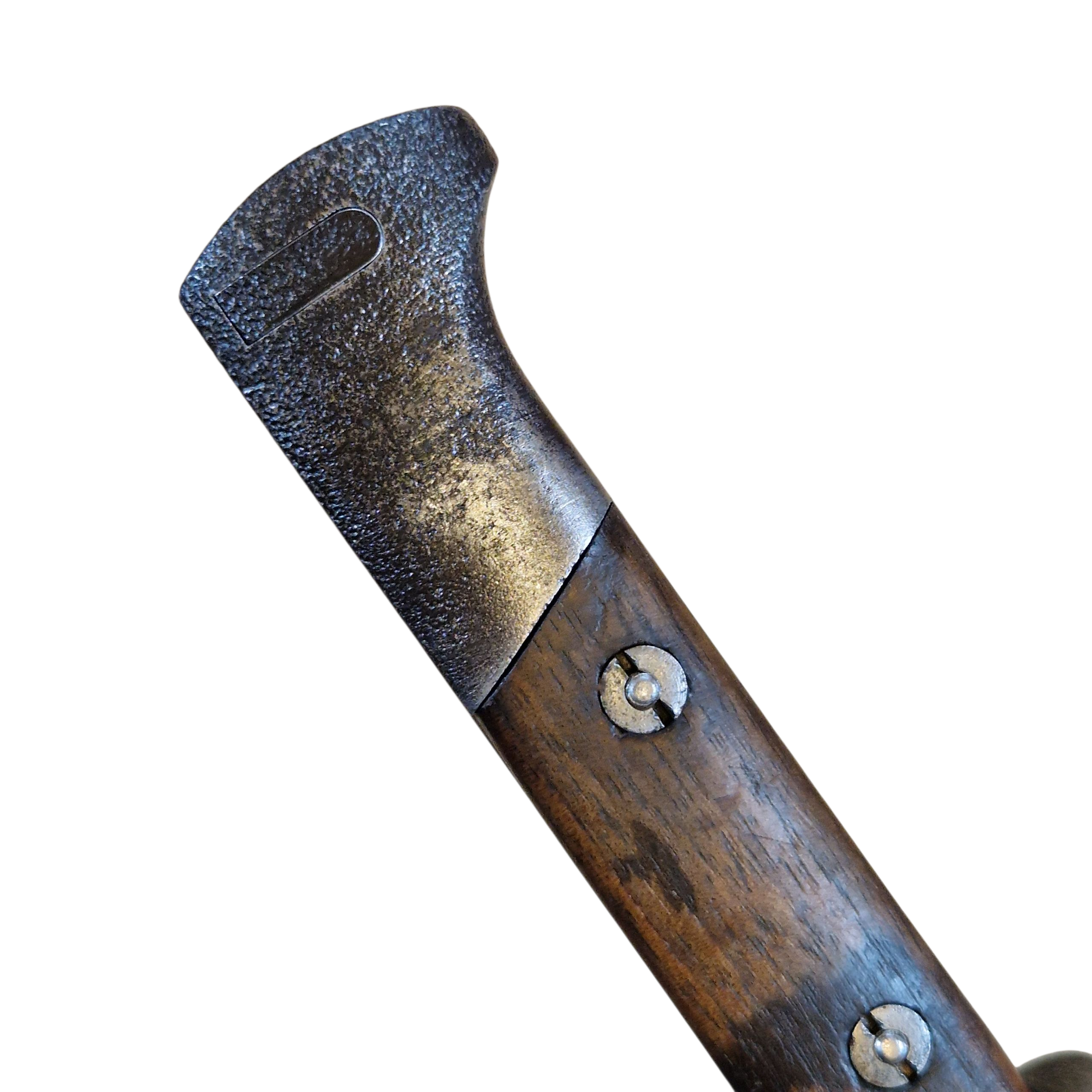 Bagnet Polski wzór 29, produkcji Fabryki Broni w Radomiu z odbiorem Z wraz z pochwą w oryginalnym malowaniu khaki, sygnowana przy tylnym nicie GG?, osobno N i osobno V , na progu cyfra 9 przy F.B.RADOM , na jelcu numer 3112T , zatrzask sprawny , lekko wyczuwalny luz na okładce – bez znaczenia, bardzo ładny egzemplarz .