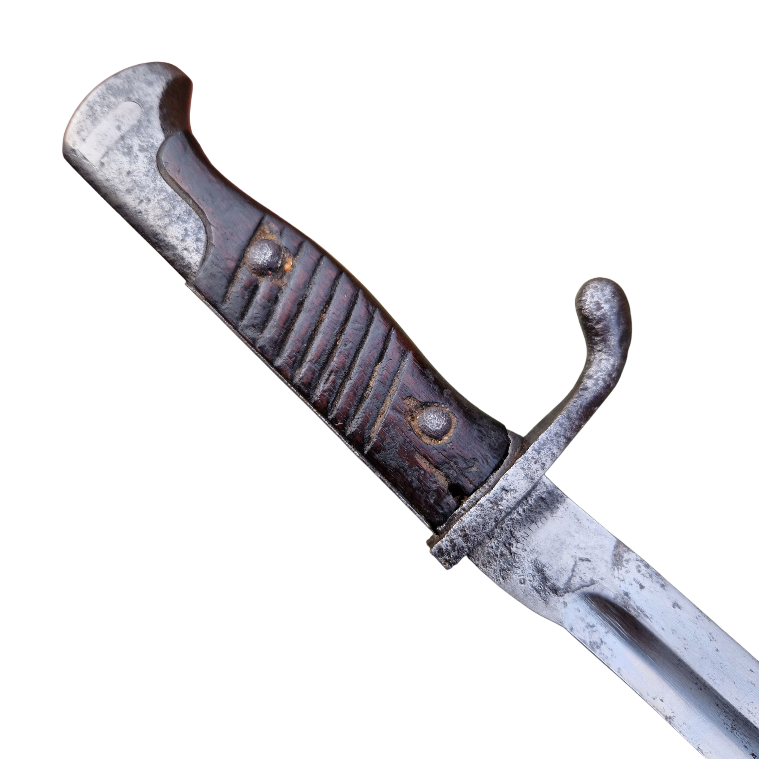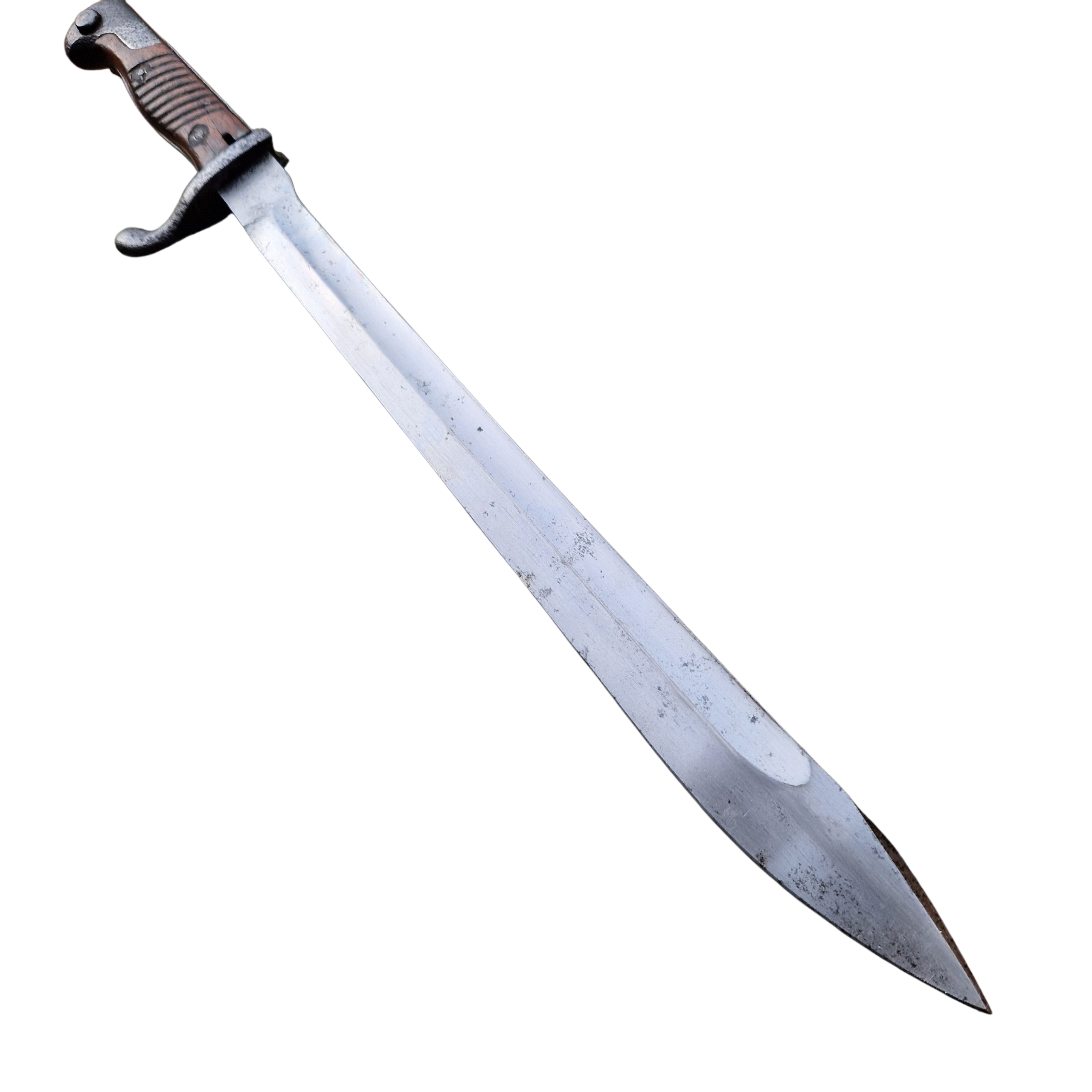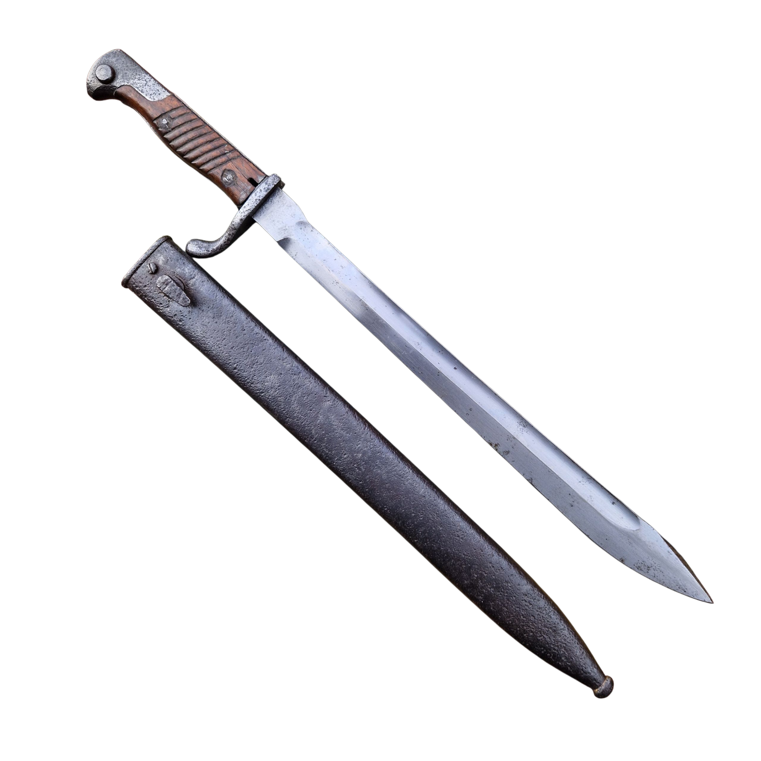Bagnet niemiecki S 98/05 „Liść” przeznaczony do karabinków Mauser. Wersja Podoficerska (z piłą) Regulaminowo usuniętą po 1917 roku, Producent z „rodziny” solingen, reszta sygnatury producenta trudne do odczytania, Widoczne ślady lekkiej korozji na rękojeści i pochwie, zatrzask i dławik sprawny, stan bagnetu dobry. Bagnet można obejrzeć i zakupić w biurze naszej firmy po wcześniejszym umówieniu.