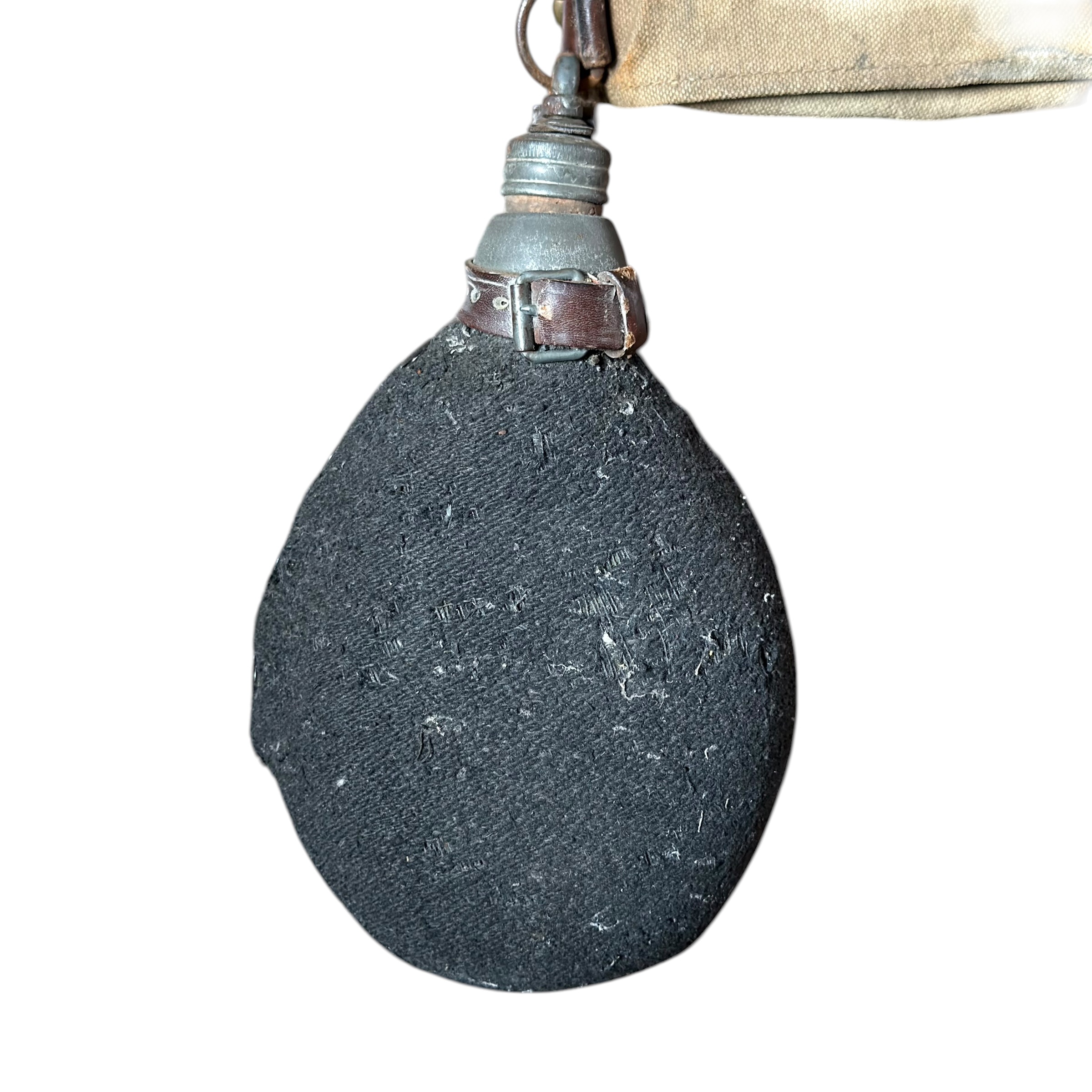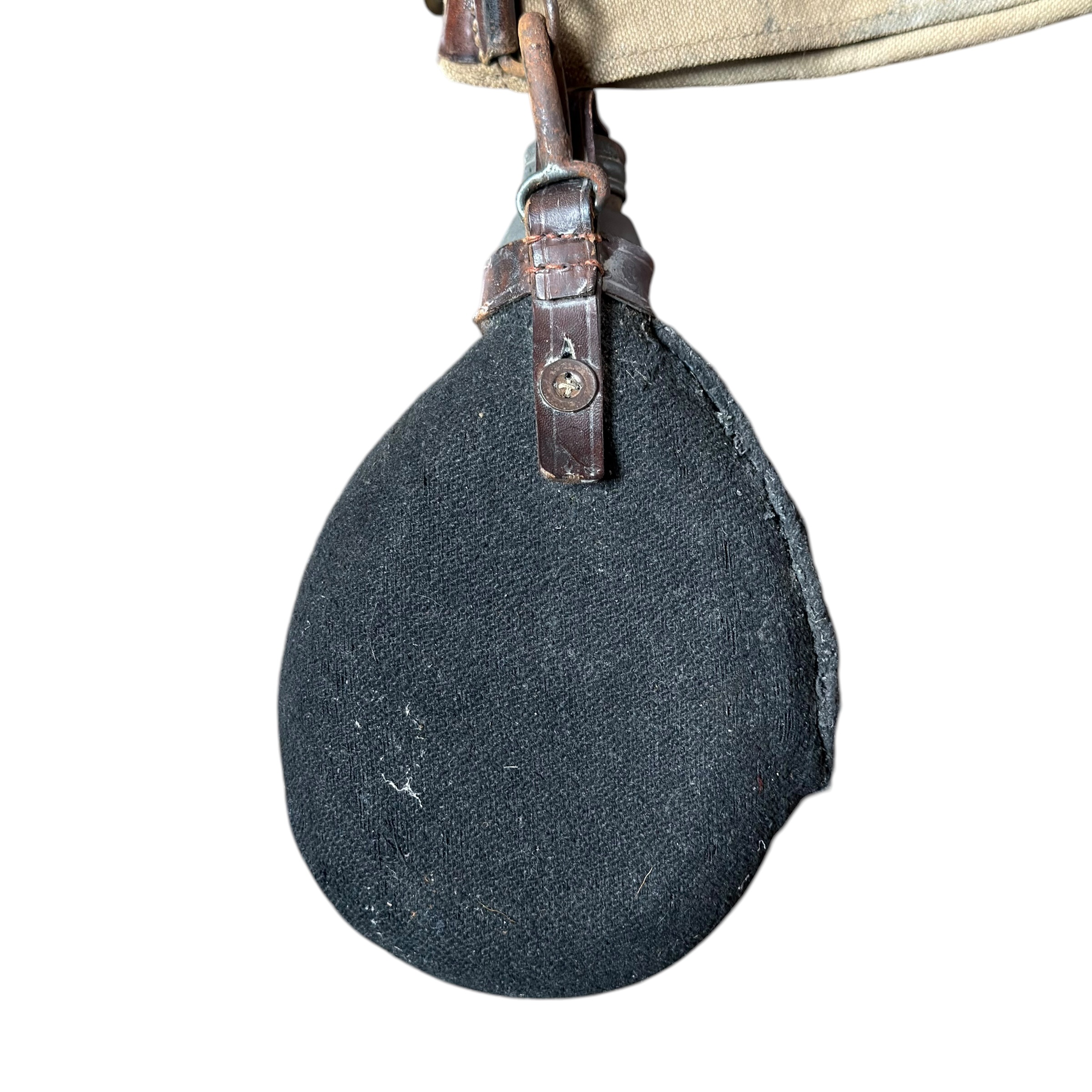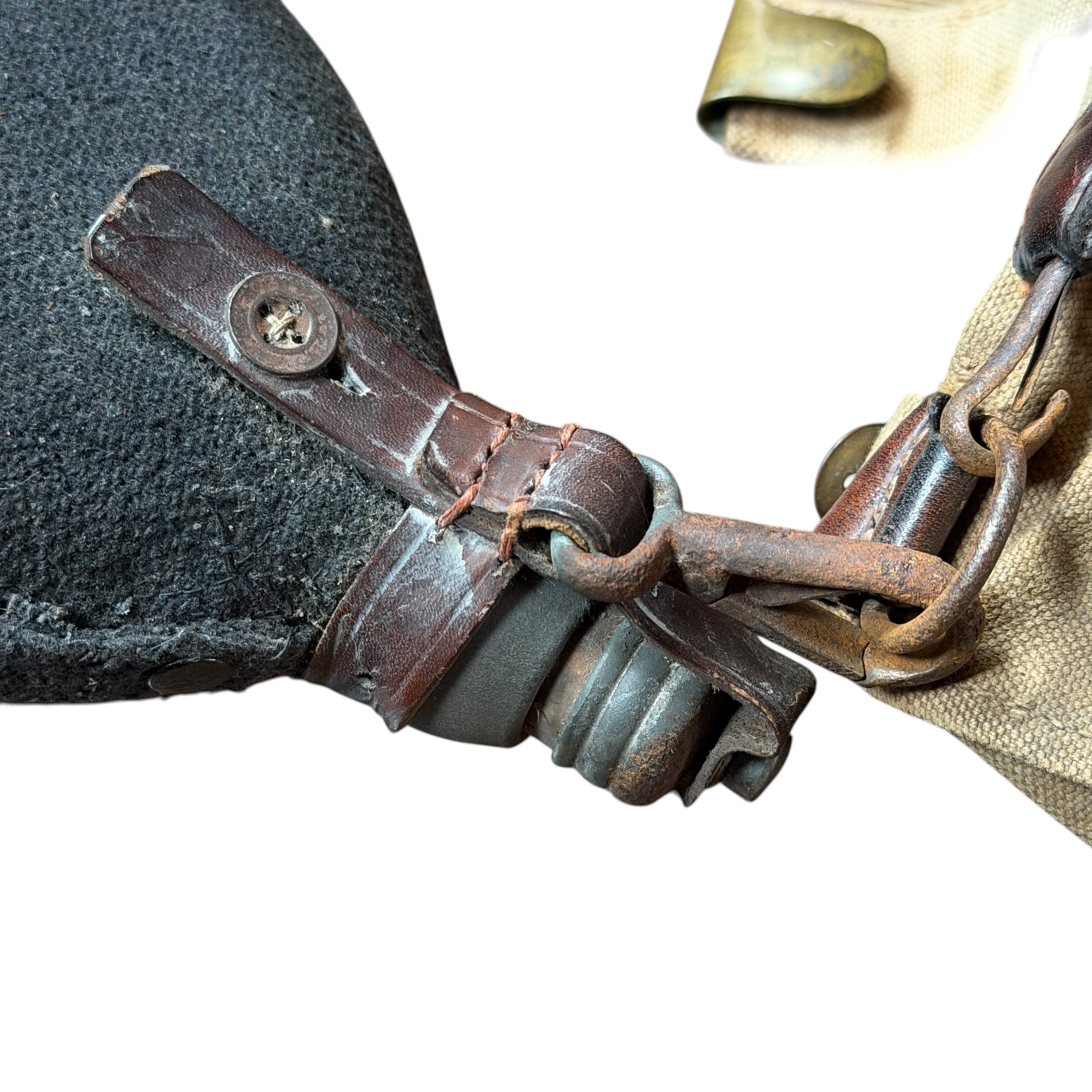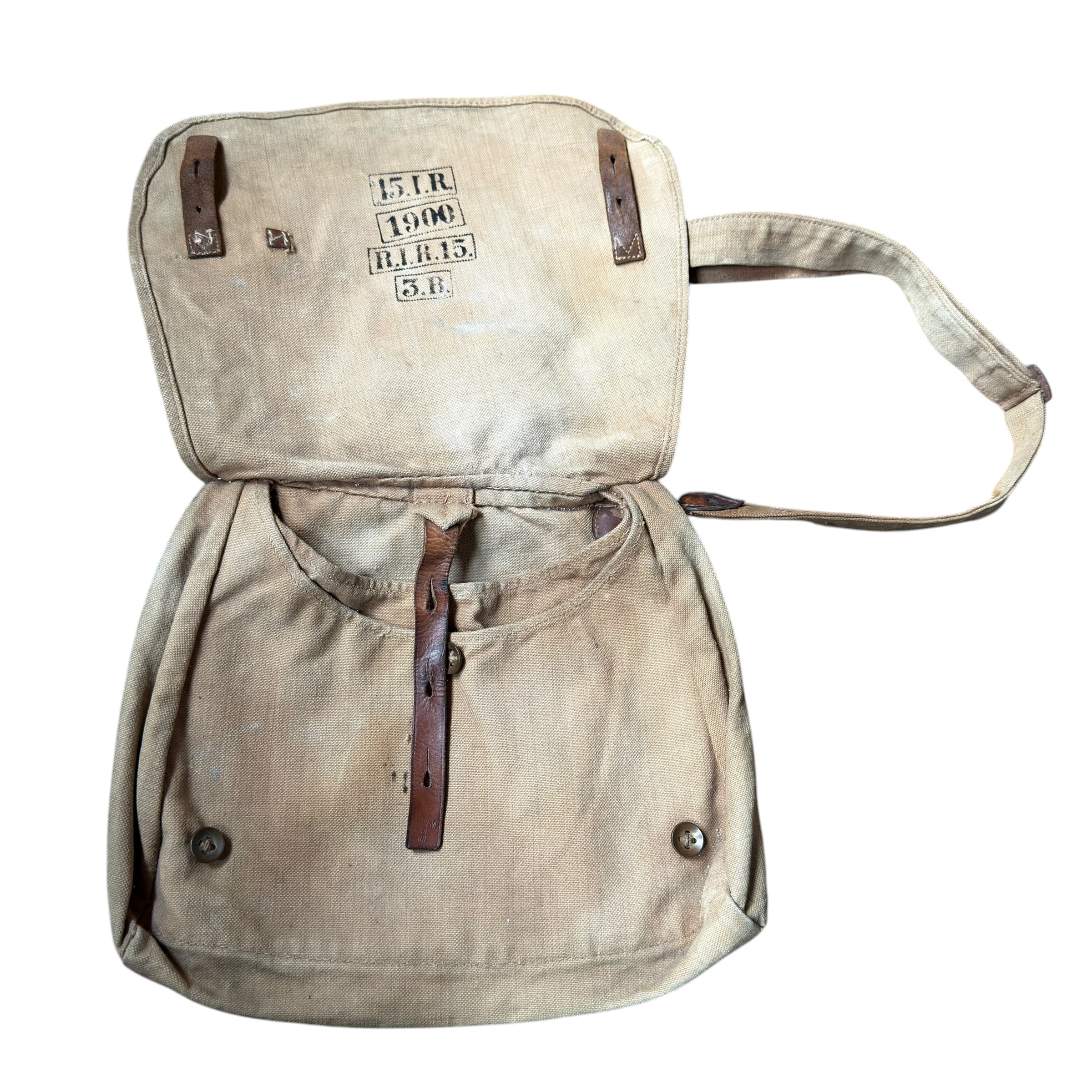 Cesarstwo Niemieckie – chlebak wraz z paskami i manierką W REWELACYJNYM STANIE , tkanina bawełniana w kolorze jasno oliwkowym, obecne wszystkie guziki na pokrowcu manierki, w środku pięknie widoczne tuszowe sygnowanie  w tym datę „1900″ i oznaczenie „15 I. R.”; manierka z oryginalnym lekko skorodowanym karabińczykiem zawieszonym na torbie na chlebaku za pomocą  oryginalnej zawieszki , zawieszka wytarta w miejscu zawieszenia spójnie z karabińczykiem od manierki co wskazuje na oryginalny komplet manierki i chlebaka, jest to -wszystko na to wskazuje – całość z epoki!!  nakrętka manierki ze skórzanym oryginalnym  paskiem, manierka aluminiowa wraz z ciemno szarym filcowym pokrowcem, całość zachowana bardzo dobrze,  okaz muzealny, rzadko spotykany komplet, tutaj cena nie jest najważniejsza, w tym przypadku widać historię na wysokim poziomie.