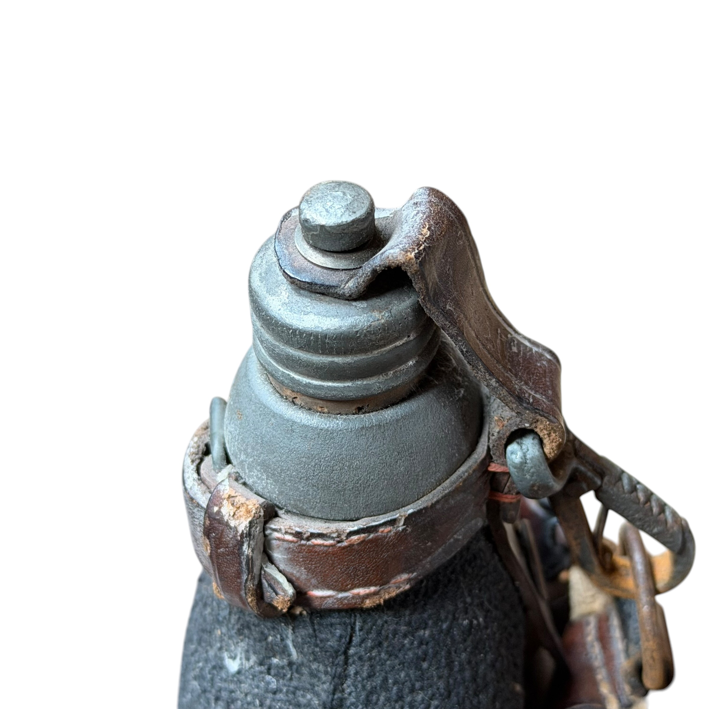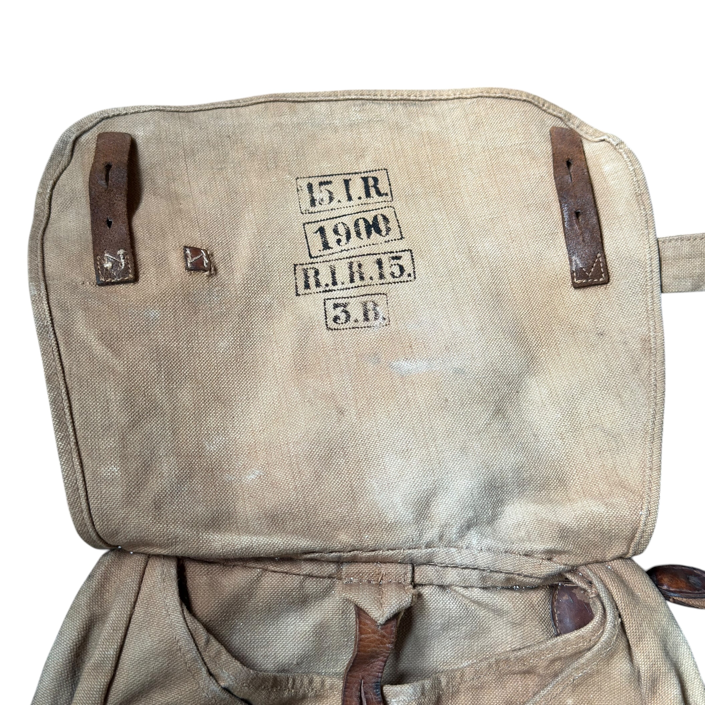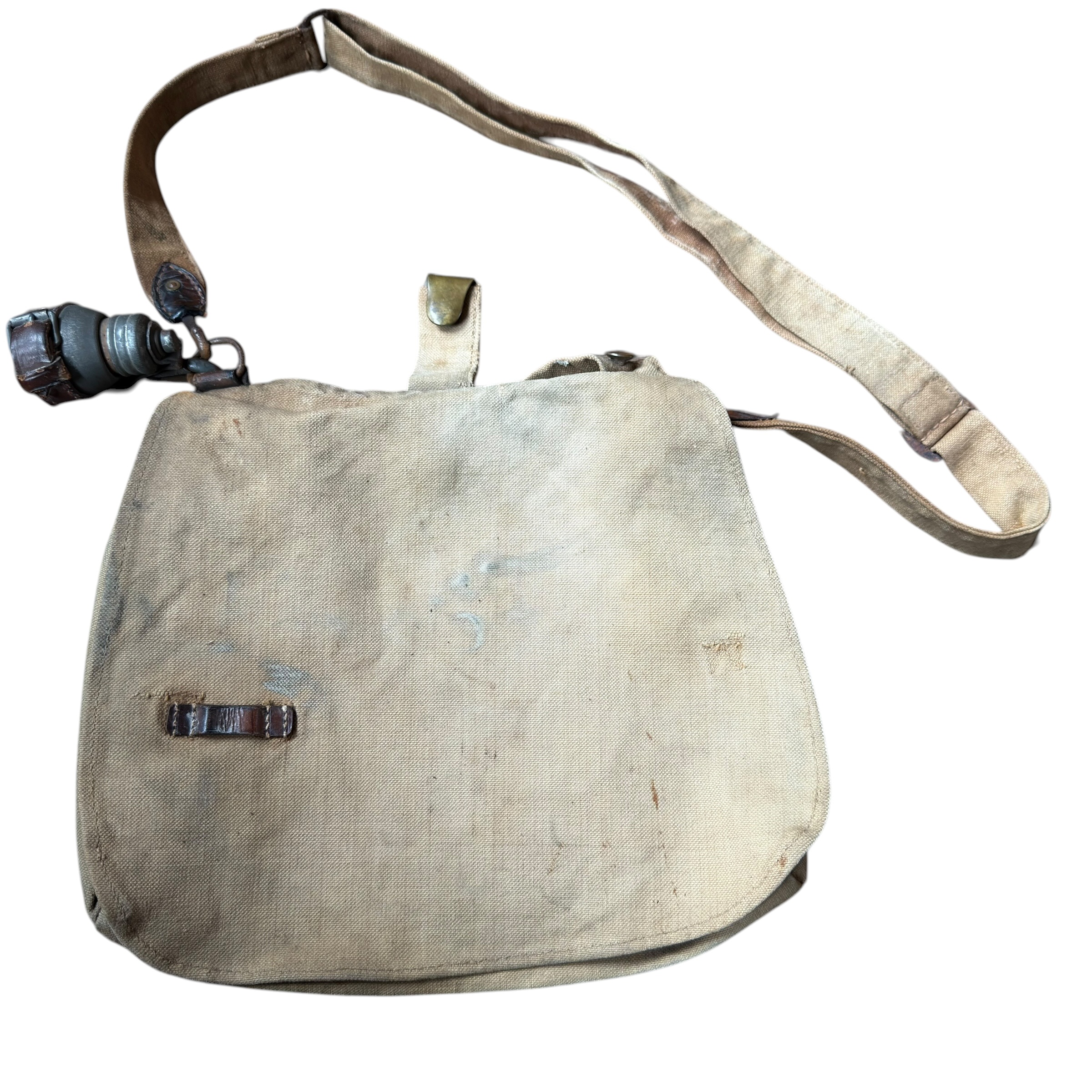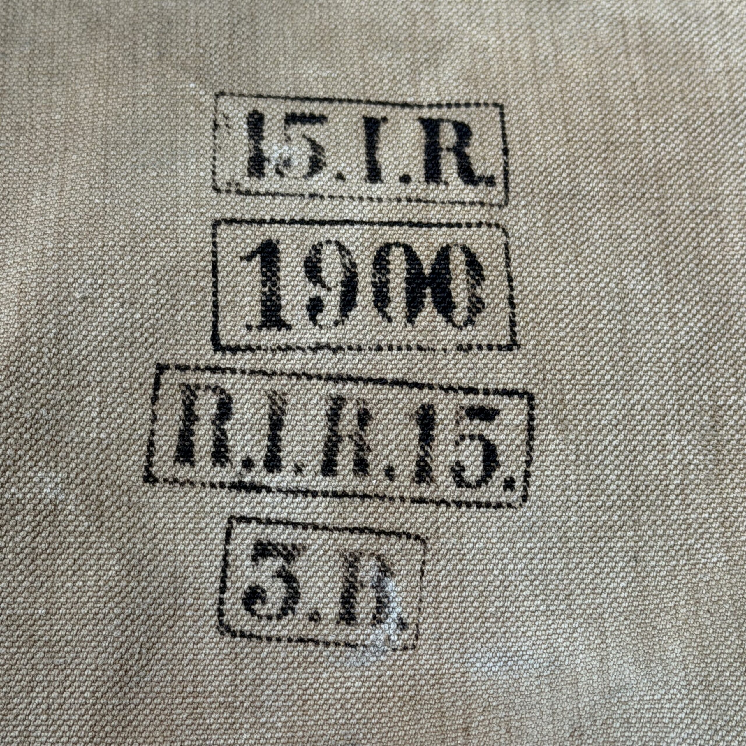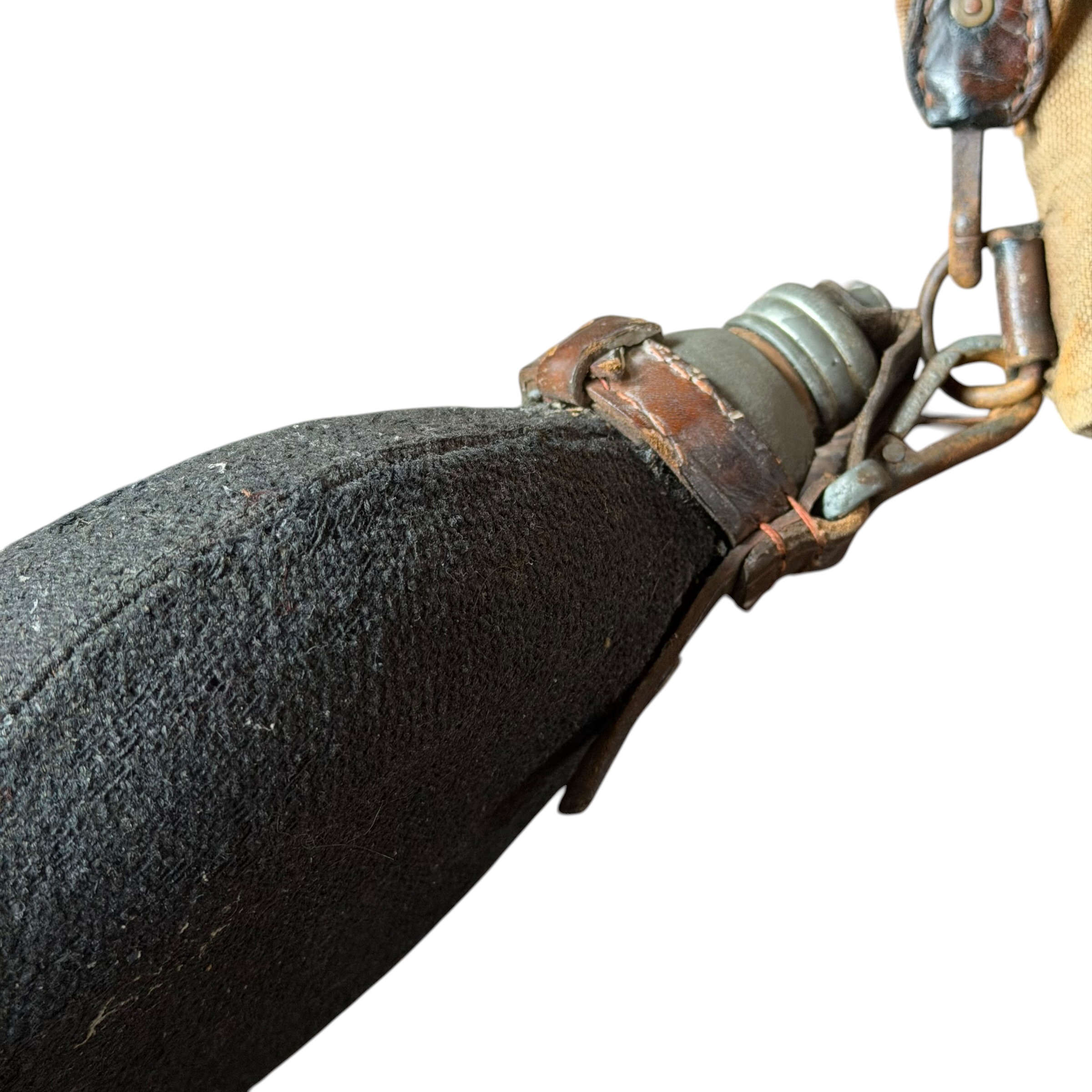 Cesarstwo Niemieckie – chlebak wraz z paskami i manierką W REWELACYJNYM STANIE , tkanina bawełniana w kolorze jasno oliwkowym, obecne wszystkie guziki na pokrowcu manierki, w środku pięknie widoczne tuszowe sygnowanie  w tym datę „1900″ i oznaczenie „15 I. R.”; manierka z oryginalnym lekko skorodowanym karabińczykiem zawieszonym na torbie na chlebaku za pomocą  oryginalnej zawieszki , zawieszka wytarta w miejscu zawieszenia spójnie z karabińczykiem od manierki co wskazuje na oryginalny komplet manierki i chlebaka, jest to -wszystko na to wskazuje – całość z epoki!!  nakrętka manierki ze skórzanym oryginalnym  paskiem, manierka aluminiowa wraz z ciemno szarym filcowym pokrowcem, całość zachowana bardzo dobrze,  okaz muzealny, rzadko spotykany komplet, tutaj cena nie jest najważniejsza, w tym przypadku widać historię na wysokim poziomie.