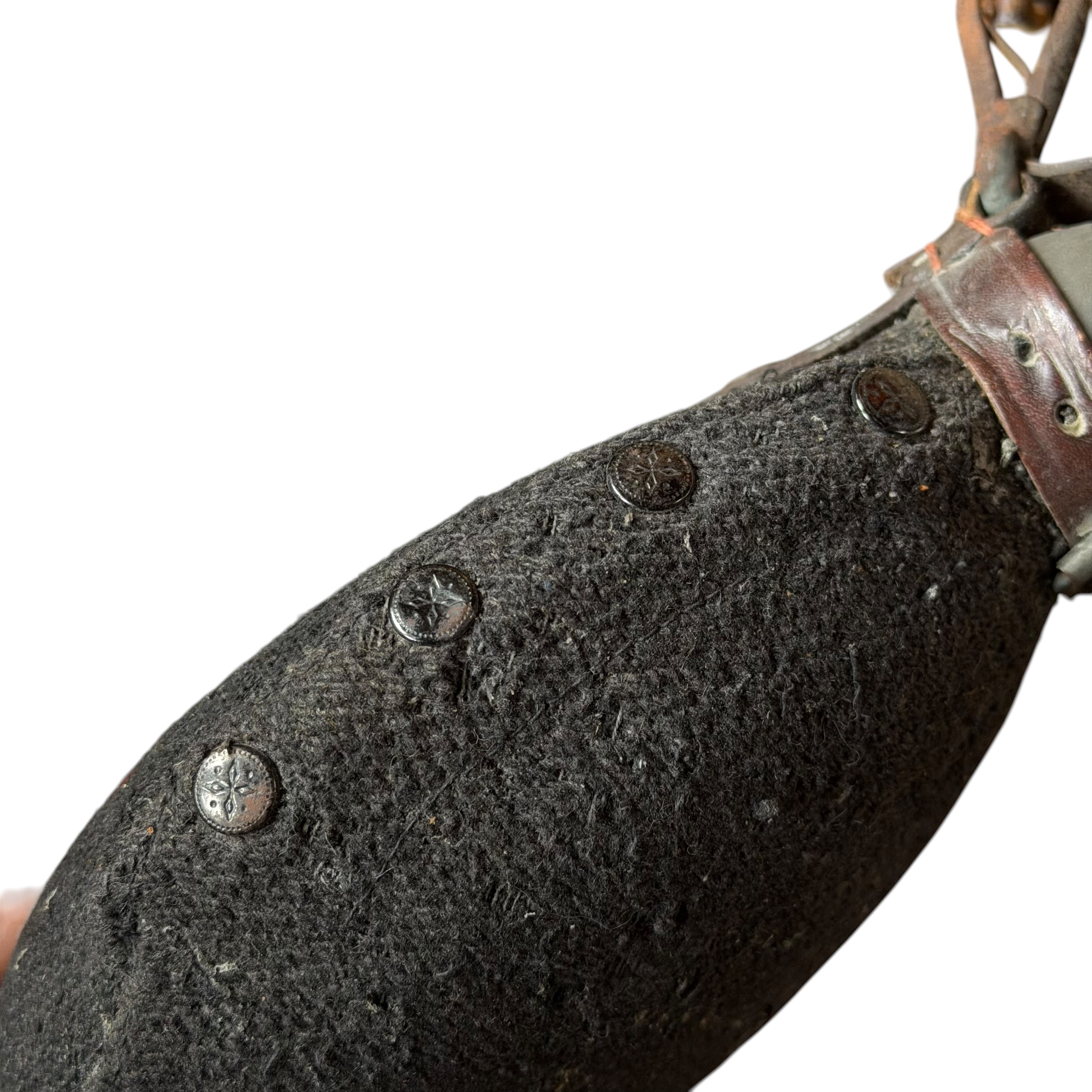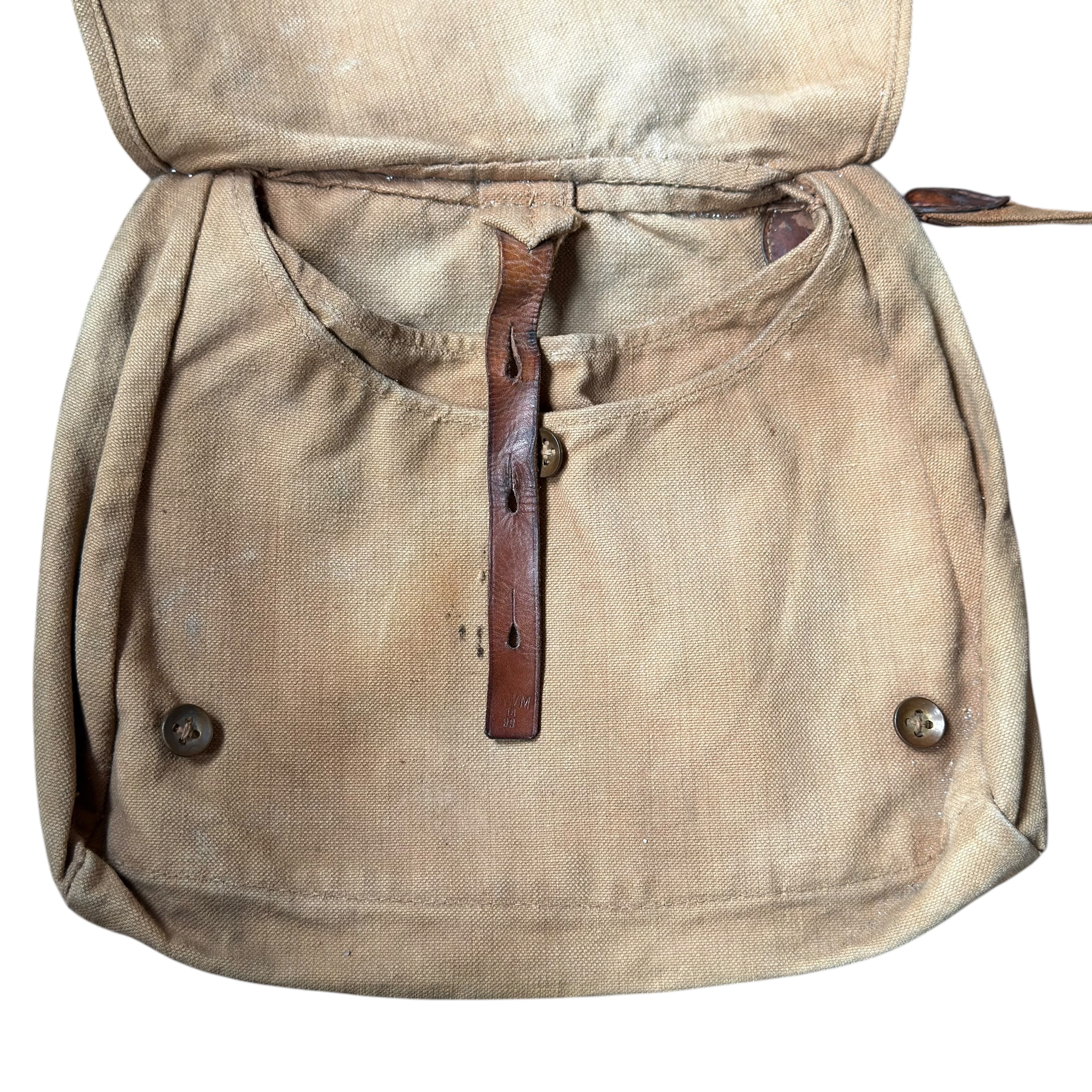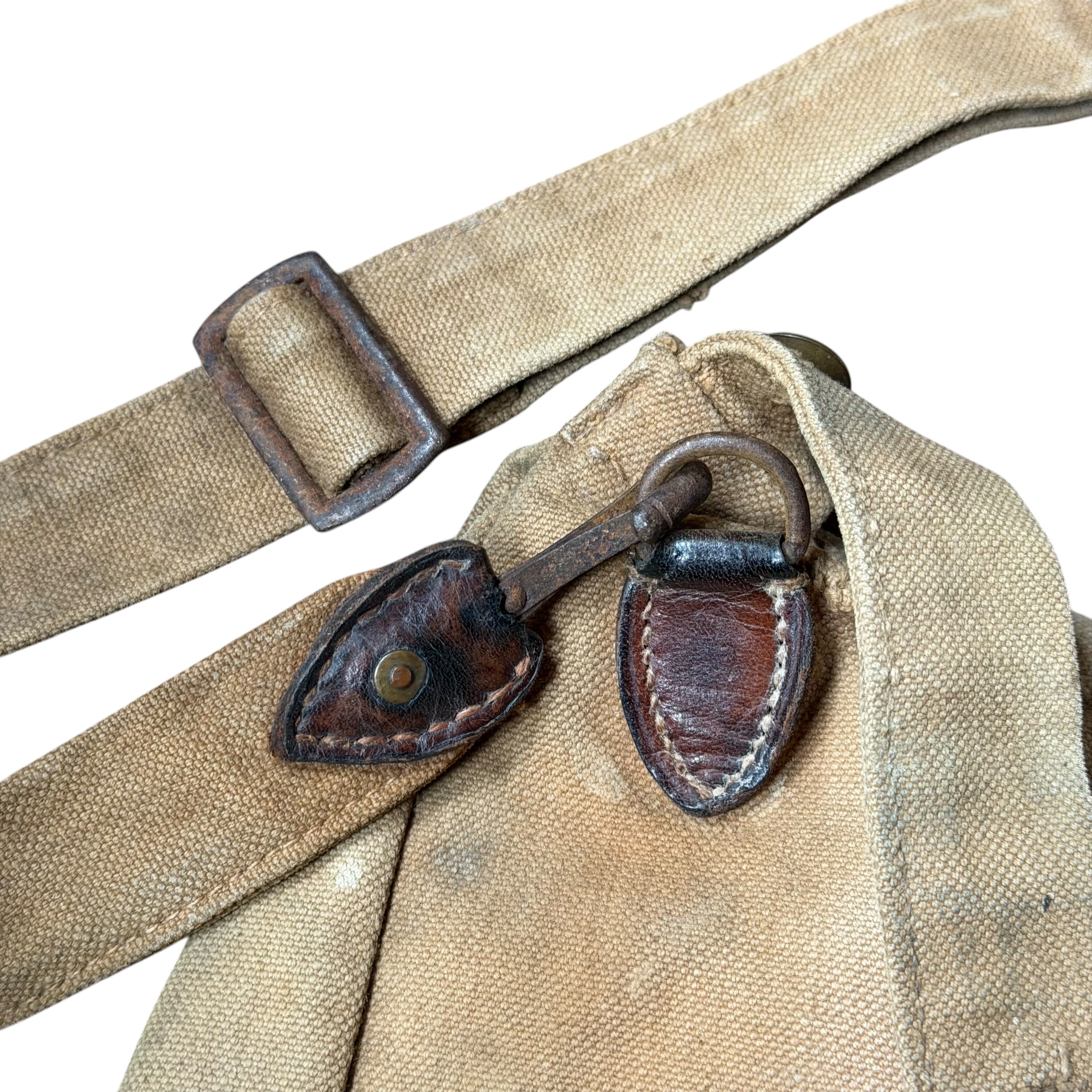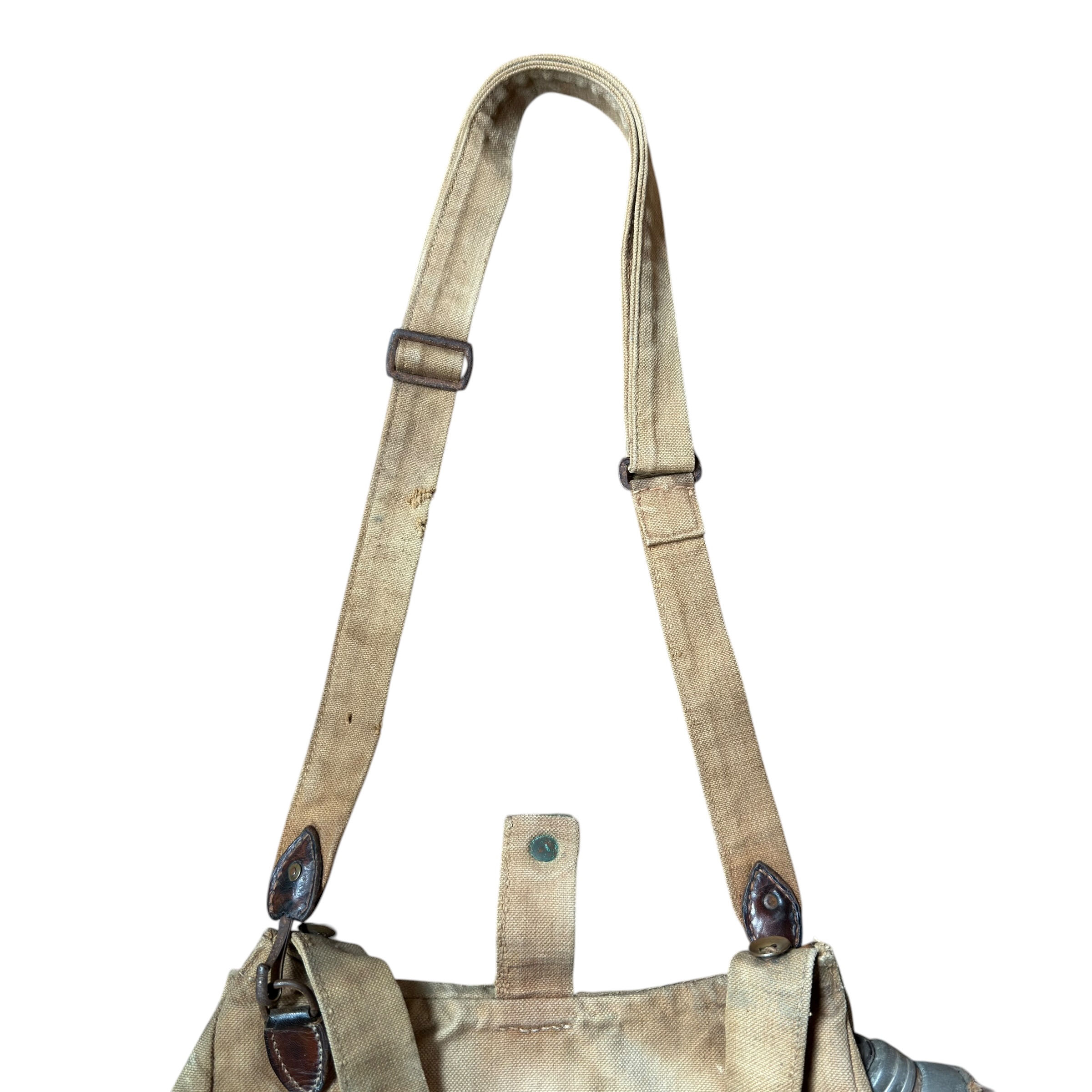 Cesarstwo Niemieckie – chlebak wraz z paskami i manierką W REWELACYJNYM STANIE , tkanina bawełniana w kolorze jasno oliwkowym, obecne wszystkie guziki na pokrowcu manierki, w środku pięknie widoczne tuszowe sygnowanie  w tym datę „1900″ i oznaczenie „15 I. R.”; manierka z oryginalnym lekko skorodowanym karabińczykiem zawieszonym na torbie na chlebaku za pomocą  oryginalnej zawieszki , zawieszka wytarta w miejscu zawieszenia spójnie z karabińczykiem od manierki co wskazuje na oryginalny komplet manierki i chlebaka, jest to -wszystko na to wskazuje – całość z epoki!!  nakrętka manierki ze skórzanym oryginalnym  paskiem, manierka aluminiowa wraz z ciemno szarym filcowym pokrowcem, całość zachowana bardzo dobrze,  okaz muzealny, rzadko spotykany komplet, tutaj cena nie jest najważniejsza, w tym przypadku widać historię na wysokim poziomie.