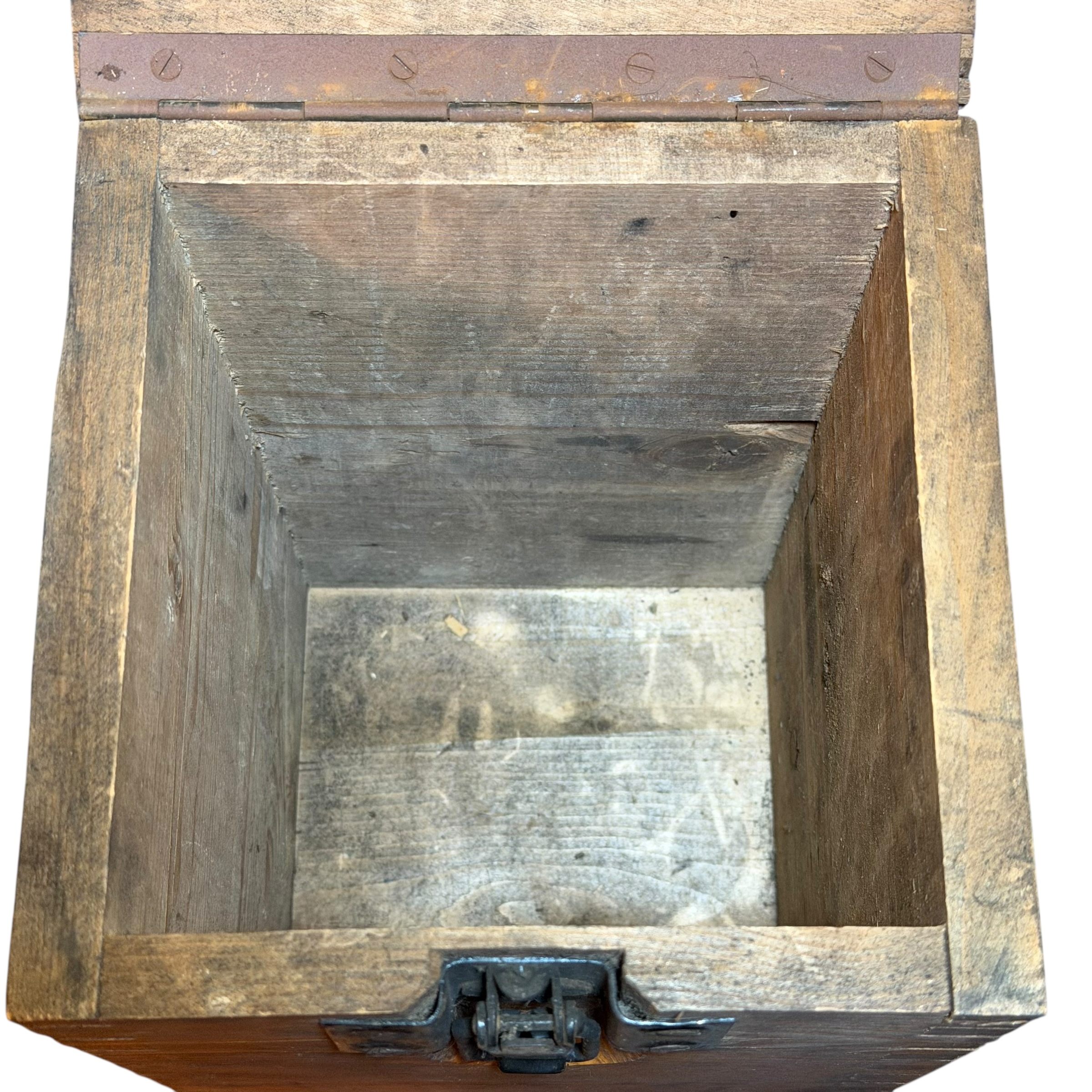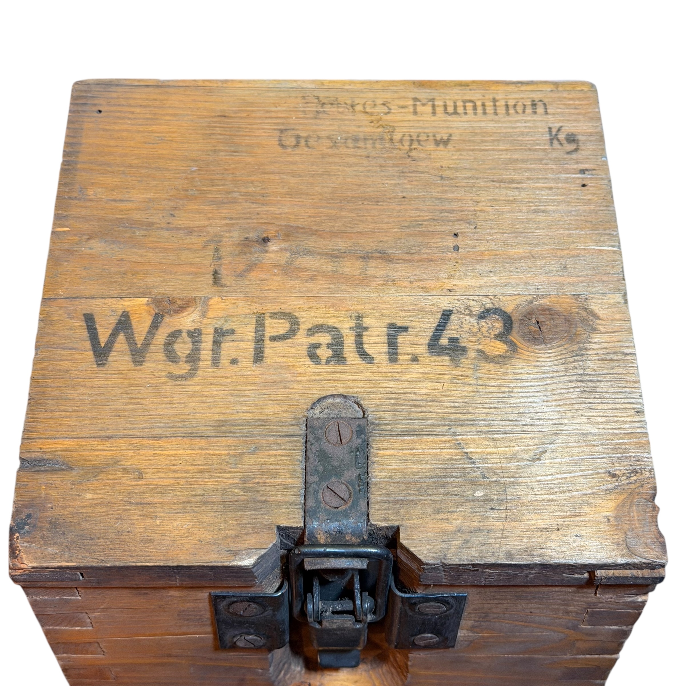 Niemiecka Drewniana skrzynka Wurfgranat patronen 43, rzadka skrzynia na pociski 12 cm do Granatwerfer 42, tuszowe sygnowanie na skrzyni ” 12 cm Wgr,Patr,43″ oznacza skrzynkę na naboje moździerzowe kal 12 cm nr 43, do 12 cm Granatwerfer jako zamiennik nabojów nr 42 które nie są odporne na zimno, amunicji tego rodzaju która znajdowała się w tej skrzynce wyprodukowano od 1943 do 1945 r. zaledwie 5373 szt! Więc ta skrzynka jest tym bardziej rzadkim okazem. Rzadka skrzynka zachowana w doskonałym stanie wraz z sznurkiem transportowym, zapięcie sprawne i w świetnie zachowanej farbie, z tyłu na zawiasie widoczna niemiecka farba feldgrau. Ciężki moździerz piechoty 12 cm s.Gr.W. 42 został opracowany w 1942 roku w niemieckich zakładach Erste Brünner Maschinenfabrik z Brünn. Była to nieznacznie zmodyfikowana kopia radzieckiego moździerza 120 mm wz. 1938. W latach 1943-1945 (do marca) wyprodukowano 8.461 egzemplarzy Moździerzy.