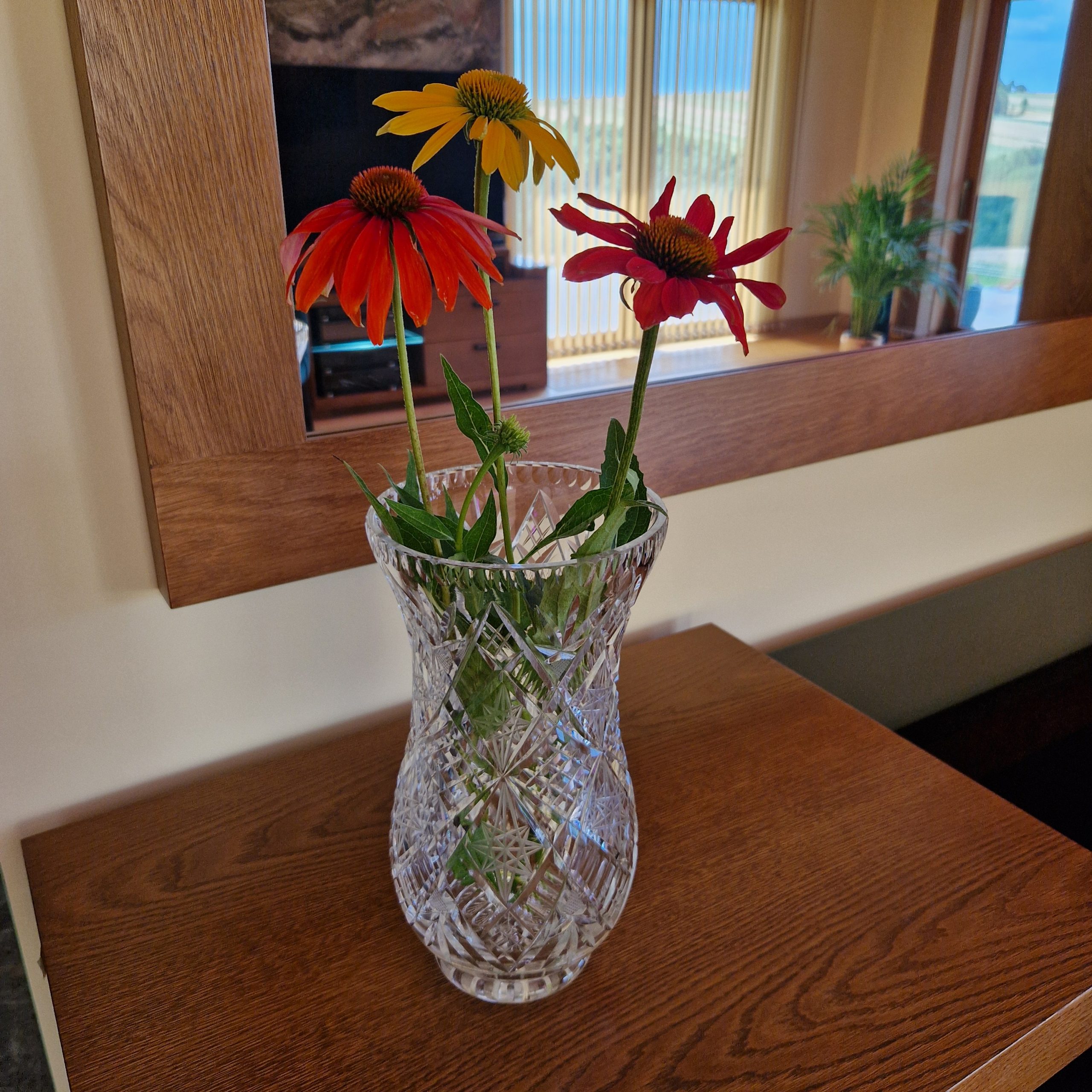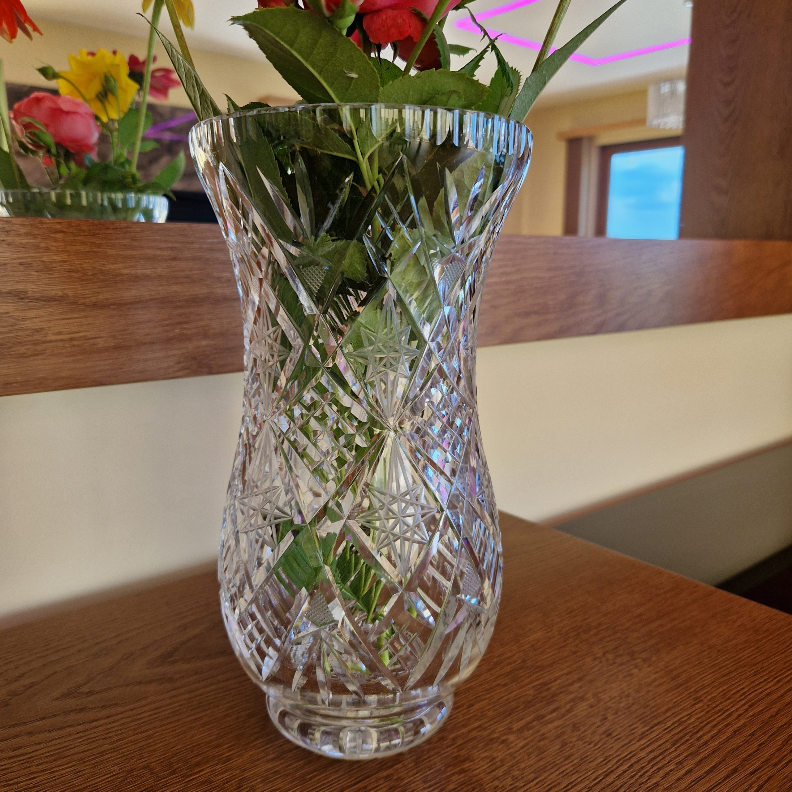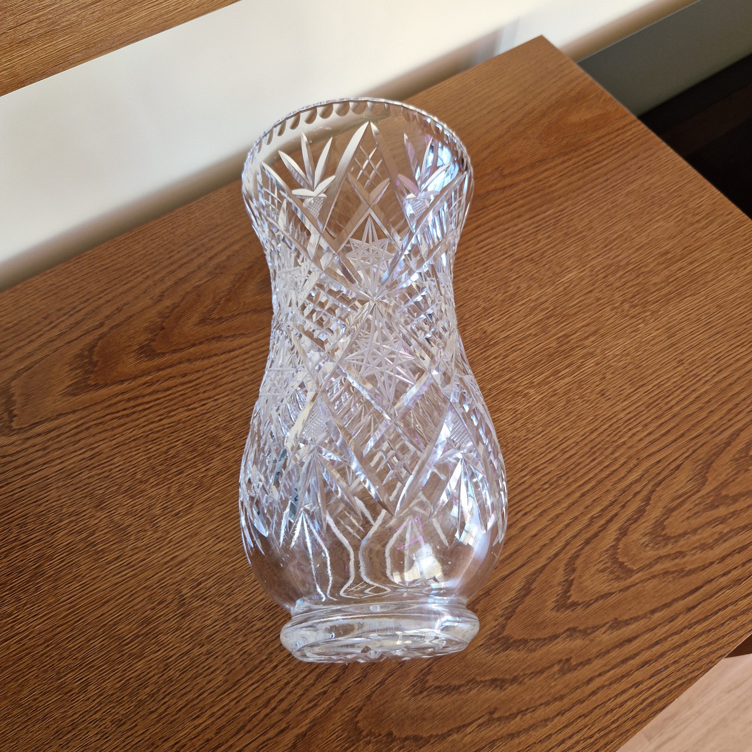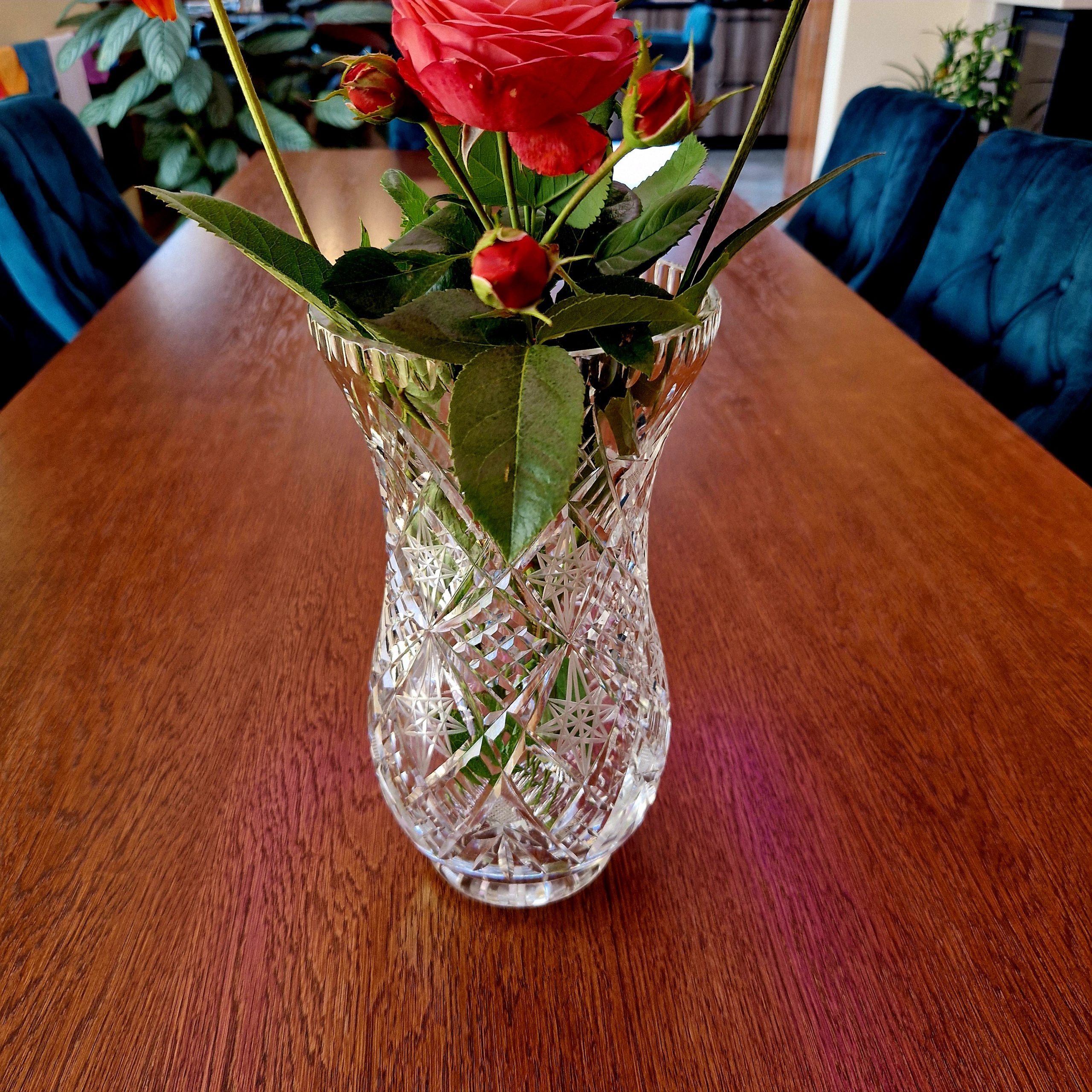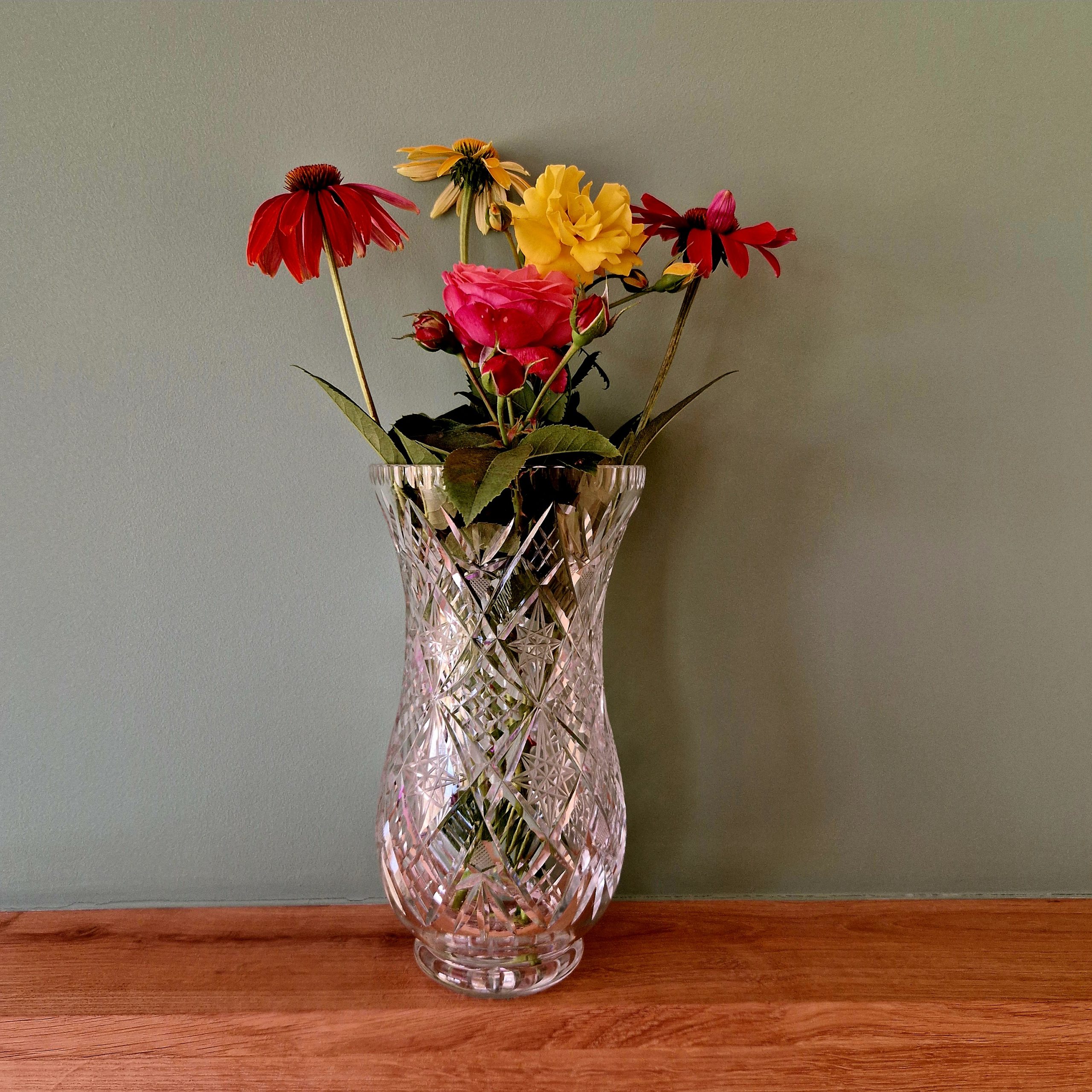 Wazon ze szkła kryształowego, na duże bukiety kwiatów, wysokość 27 cm, średnica 14,5 cm, STAN 5-