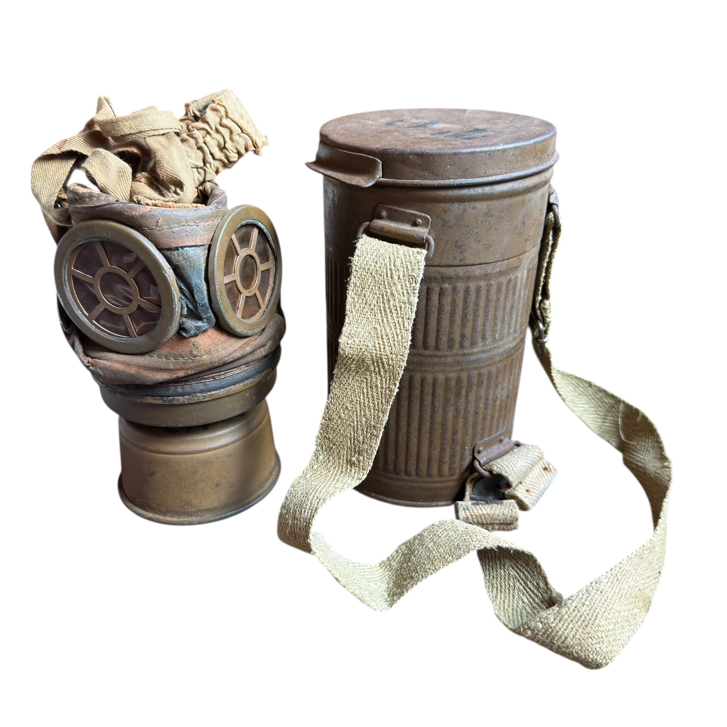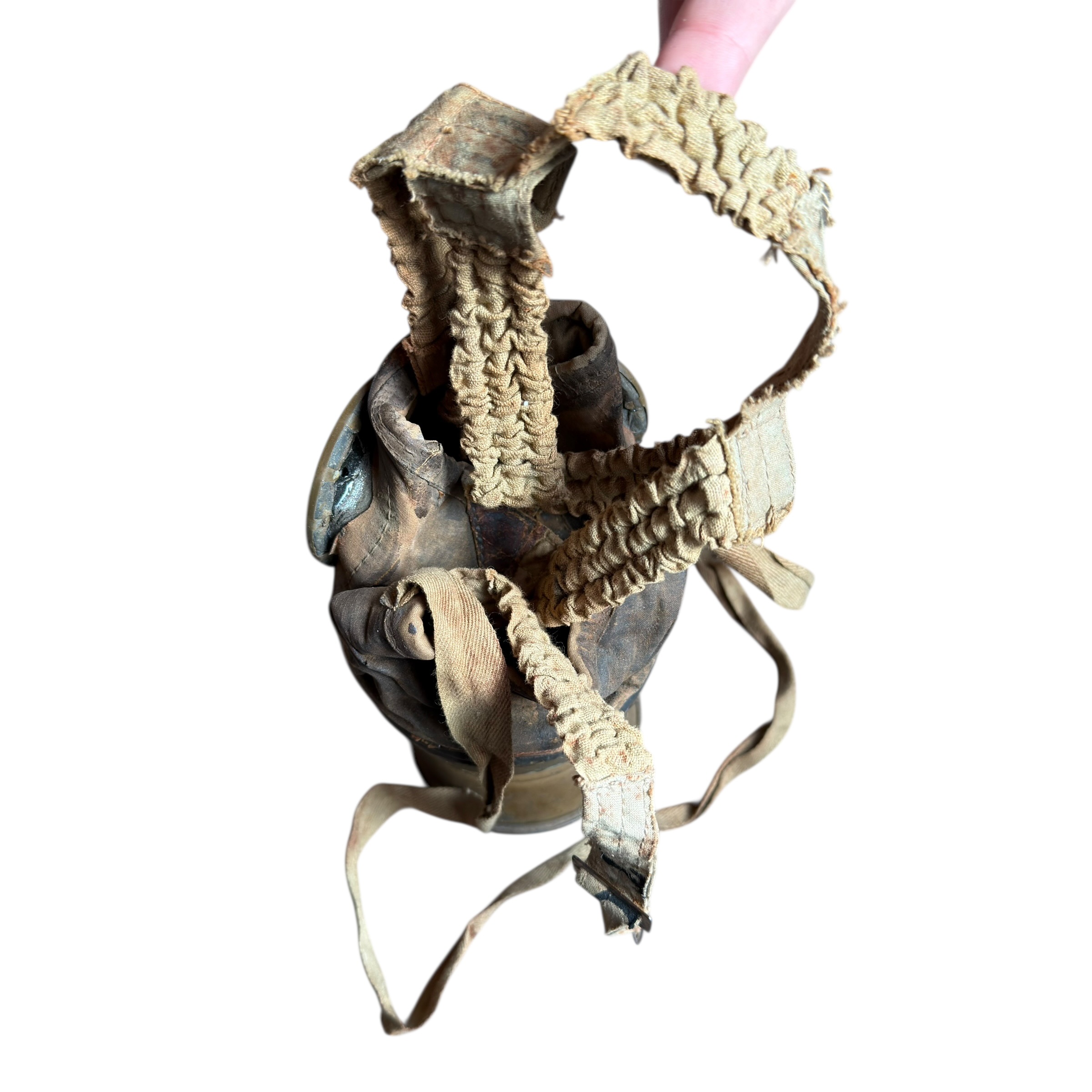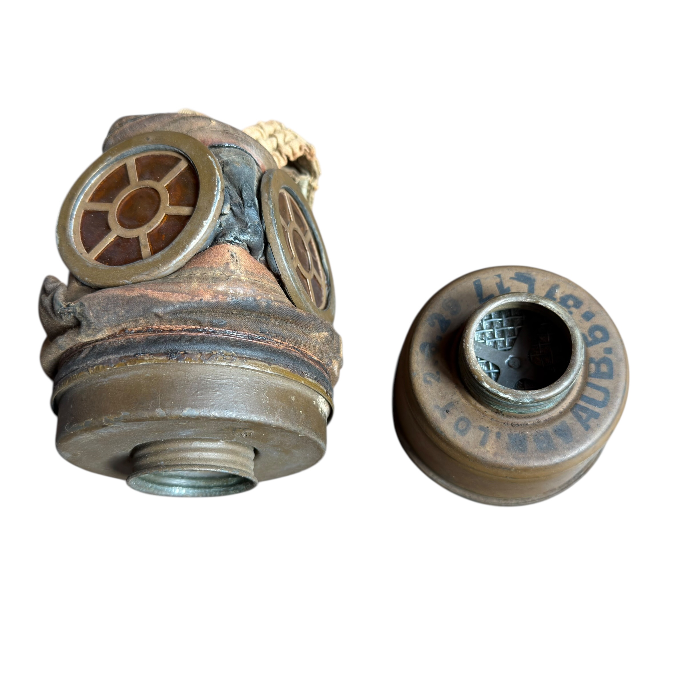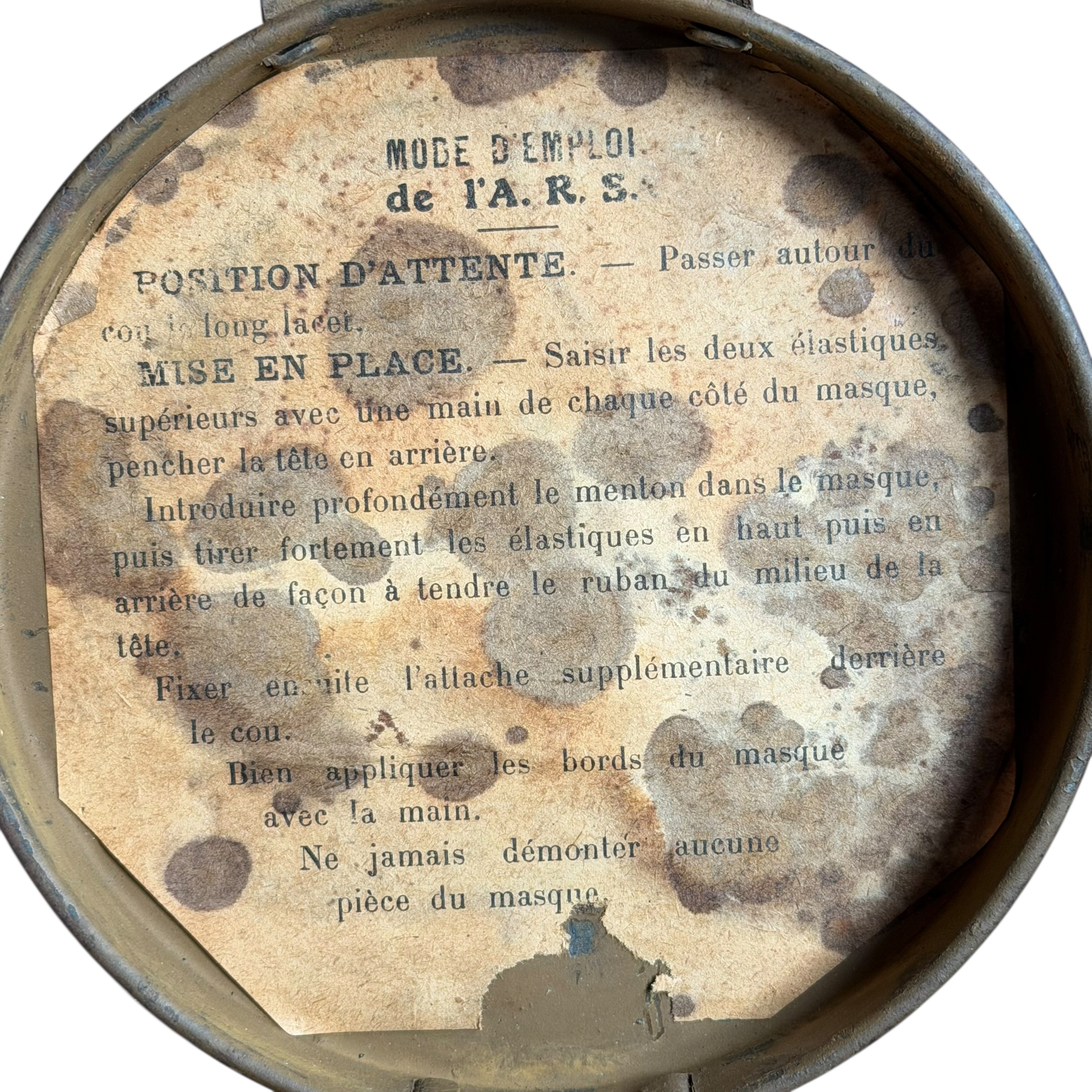 Rzadka na Polskim rynku Francuska maska przeciwgazowa ARS 17, I wojna światowa, używana do 1931, wtedy została wprowadzona ulepszona wersja czyli ANP T-31, maski były używane także w wojsku Polskim jak i Belgijskim, puszka zachowana w bardzo dobrym stanie wraz z oryginalnymi paskami i kartką zachowaną w środku, maska zachowana bardzo dobrze z wszystkimi paskami, jednak materiał jest stwardniały, całość zachowana bardzo dobrze, dużo widocznych sygnatur (tuszowych), komplet pasków, cała puszka pokryta oryginalną farbą, szkła z tworzywa oryginalne.
