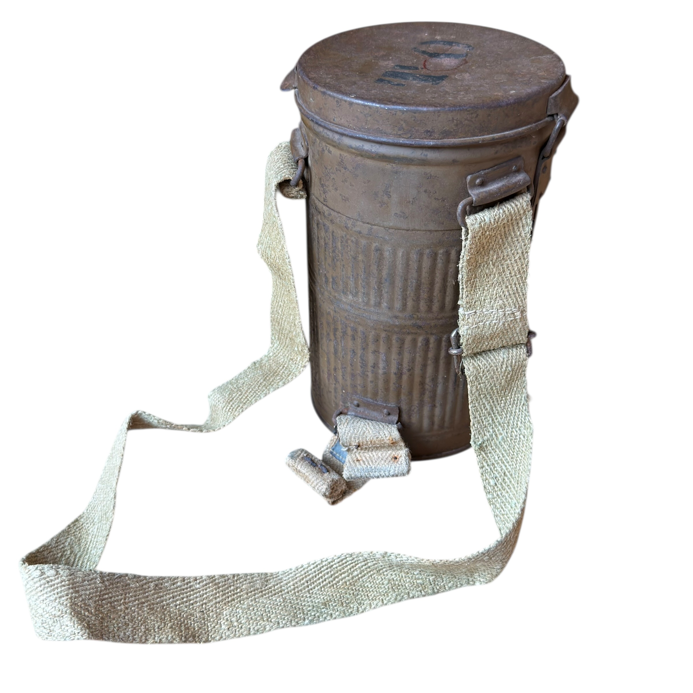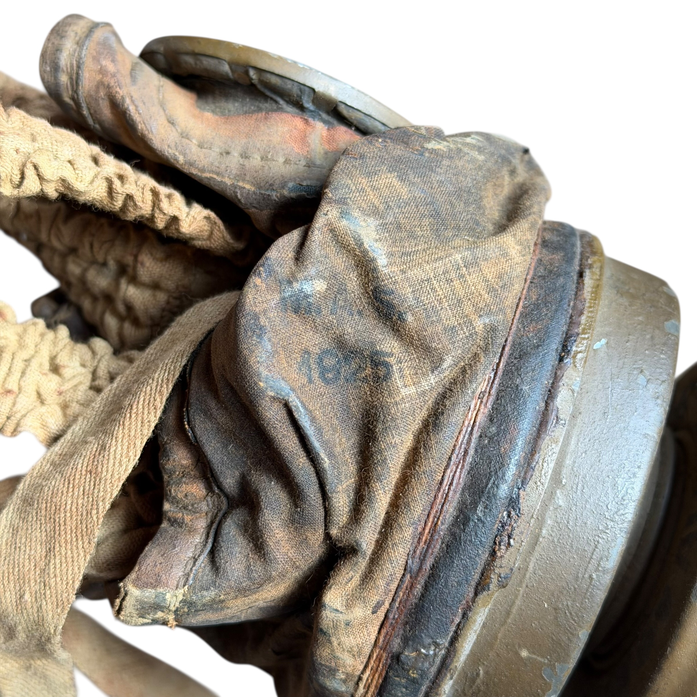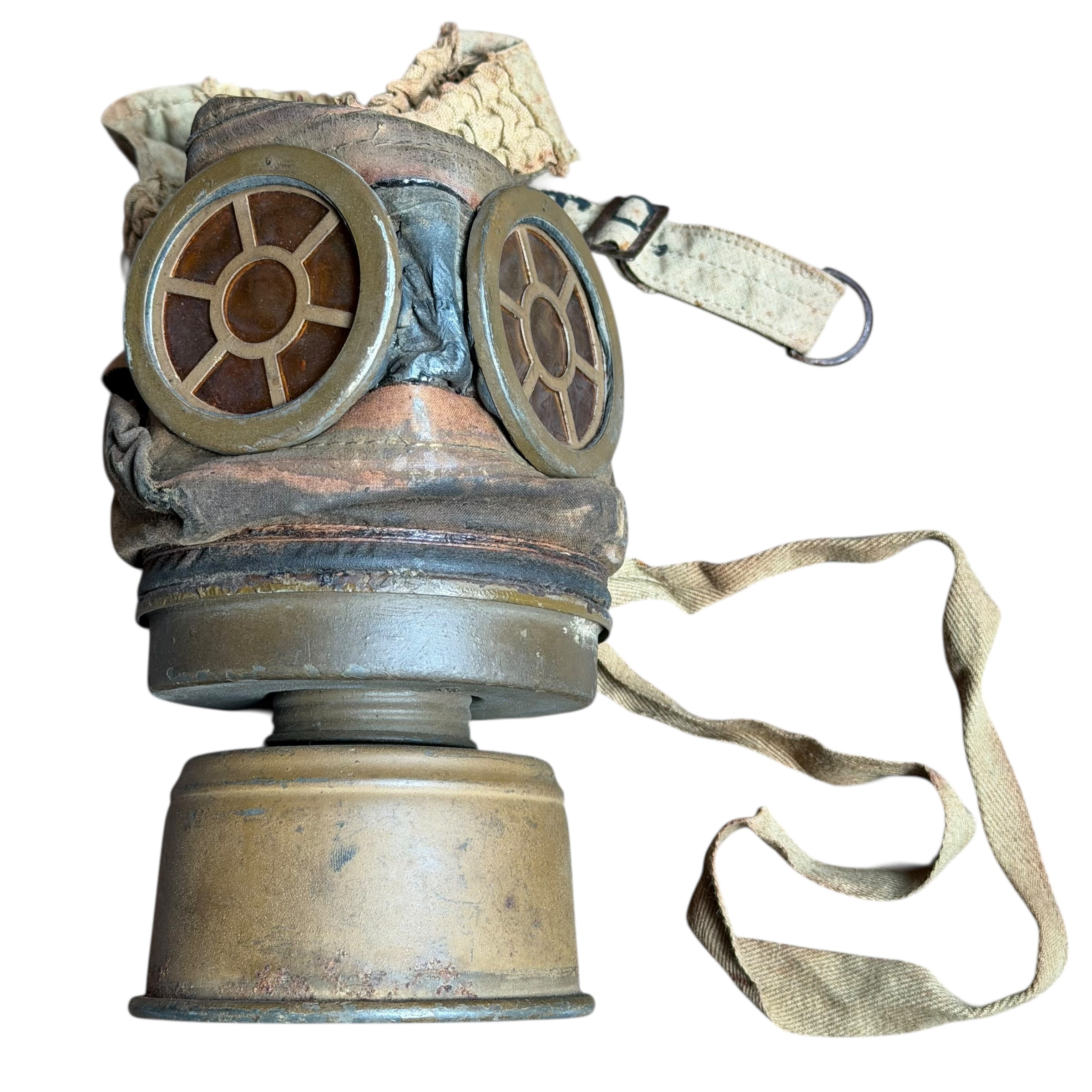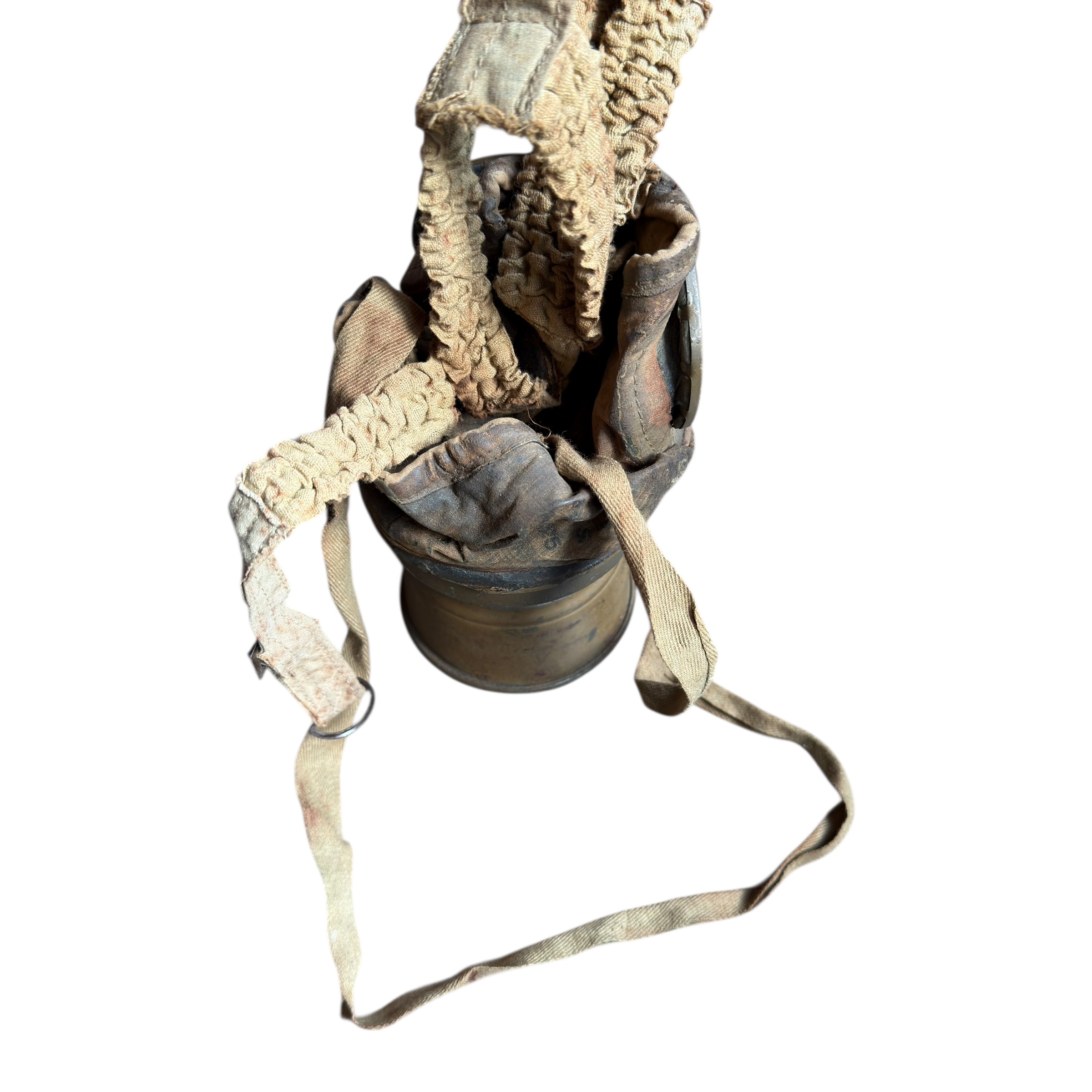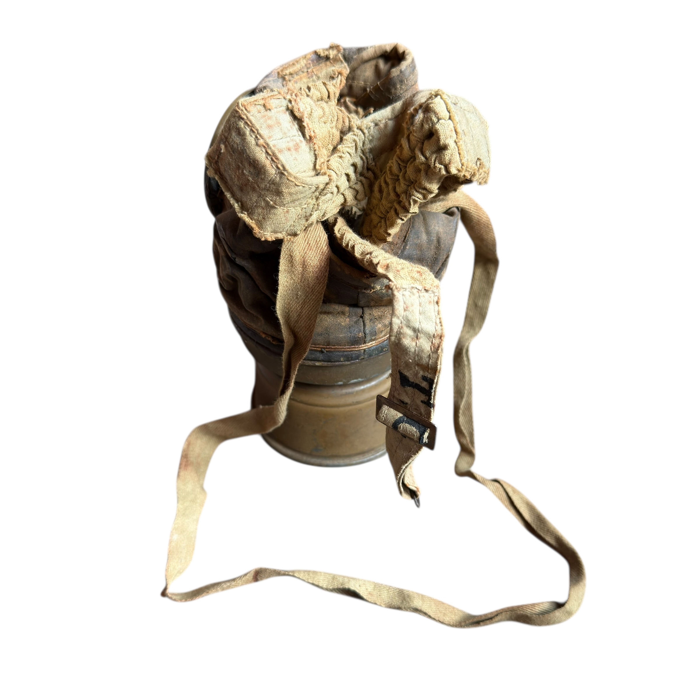Rzadka na Polskim rynku Francuska maska przeciwgazowa ARS 17, I wojna światowa, używana do 1931, wtedy została wprowadzona ulepszona wersja czyli ANP T-31, maski były używane także w wojsku Polskim jak i Belgijskim, puszka zachowana w bardzo dobrym stanie wraz z oryginalnymi paskami i kartką zachowaną w środku, maska zachowana bardzo dobrze z wszystkimi paskami, jednak materiał jest stwardniały, całość zachowana bardzo dobrze, dużo widocznych sygnatur (tuszowych), komplet pasków, cała puszka pokryta oryginalną farbą, szkła z tworzywa oryginalne.