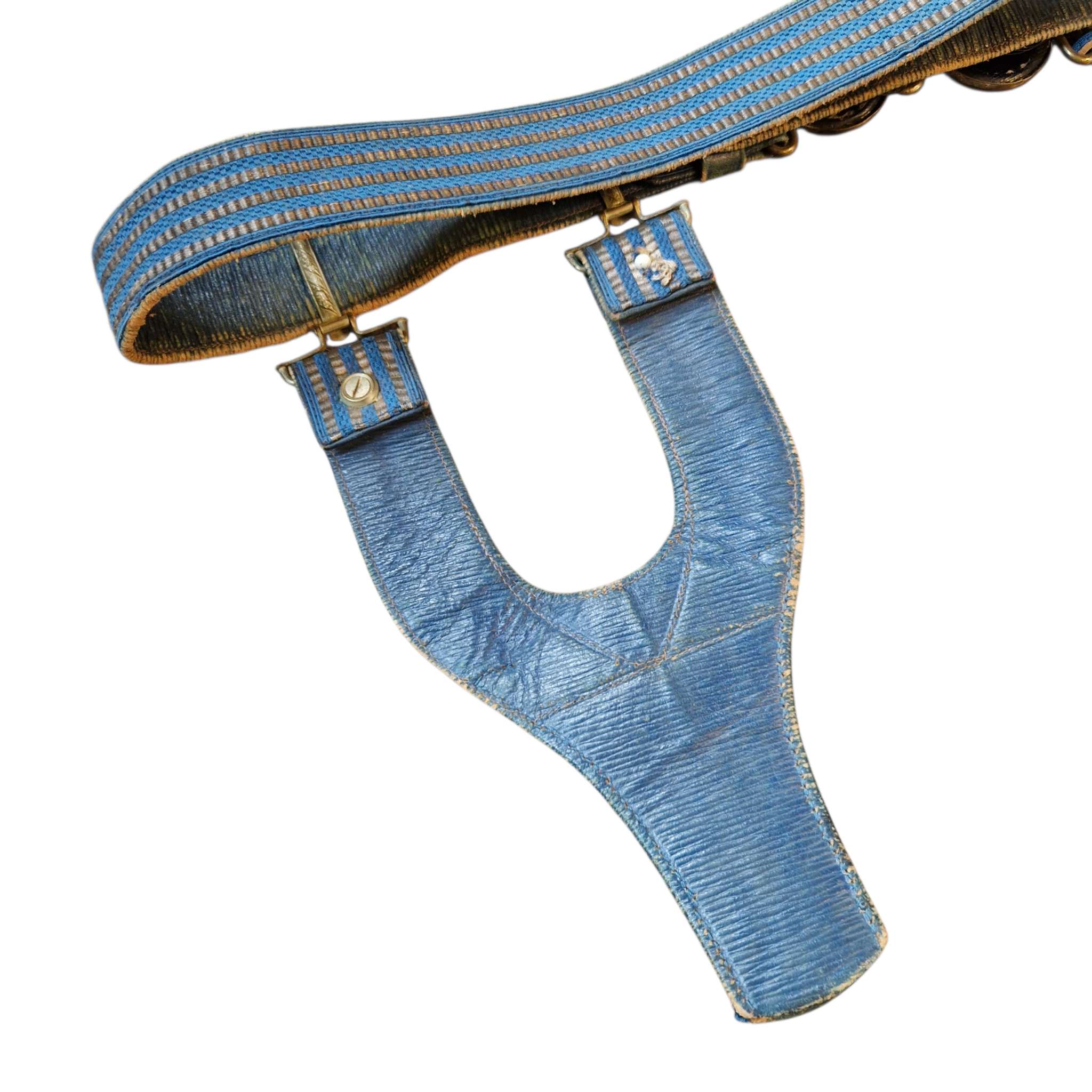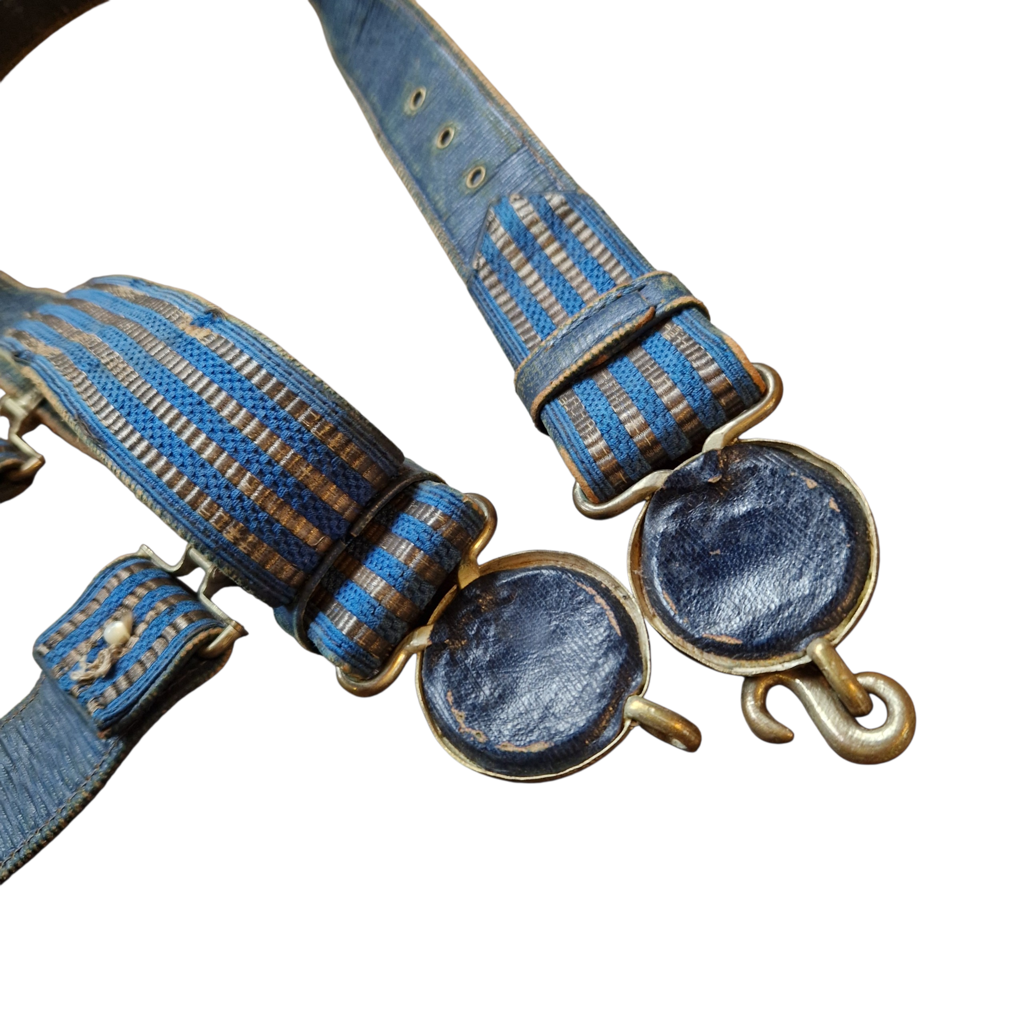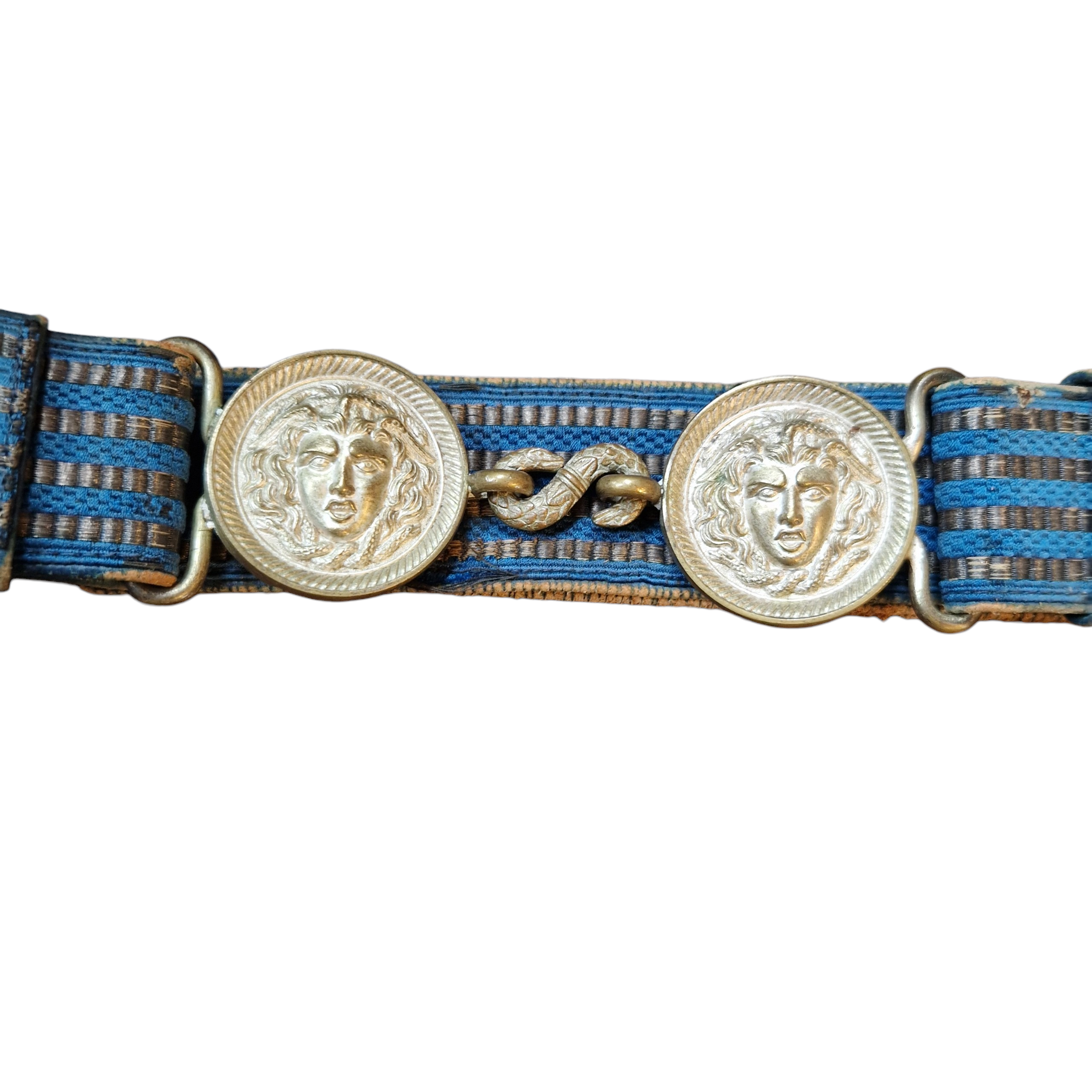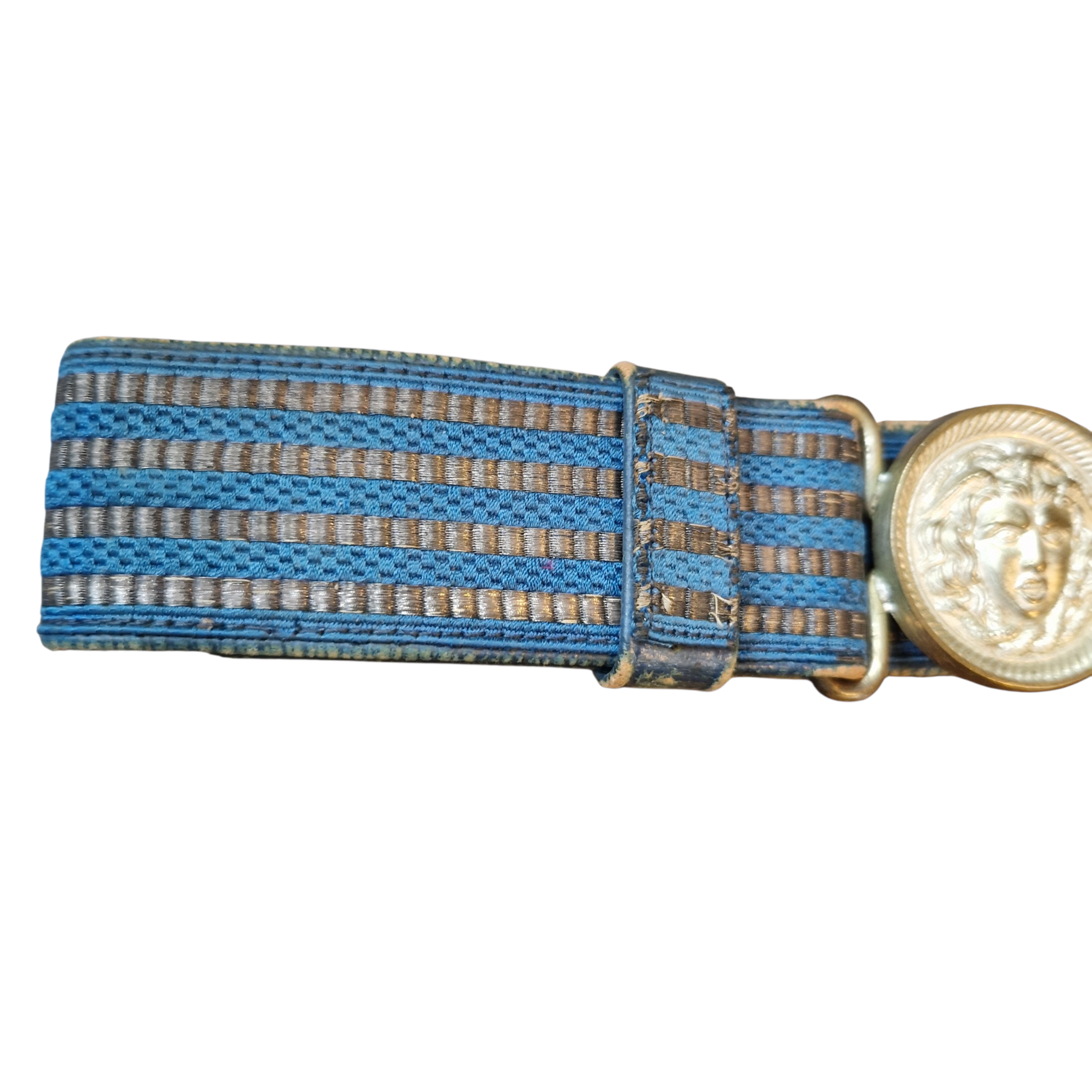Bardzo rzadki na Polskim rynku Francuski pas wysokiego oficera z XIX wieku tak zwany Centurion Porte-epee de Grande Tenue, klamry, okucia mosiężne srebrzone, klamry z głowami gorgon, pas pięknie prezentuje się w zestawie z bagnetem typu Gras, pas pięknie tkany, niebieska skórzana podszewka pasa jak i żabki, jeden guzik przy żabce wymieniony, w epoce? wygląda na guzik z masy perłowej, pas całkowicie sprawny bez znaczących uszkodzeń i dzisiejszych napraw. rzadki przedmiot.