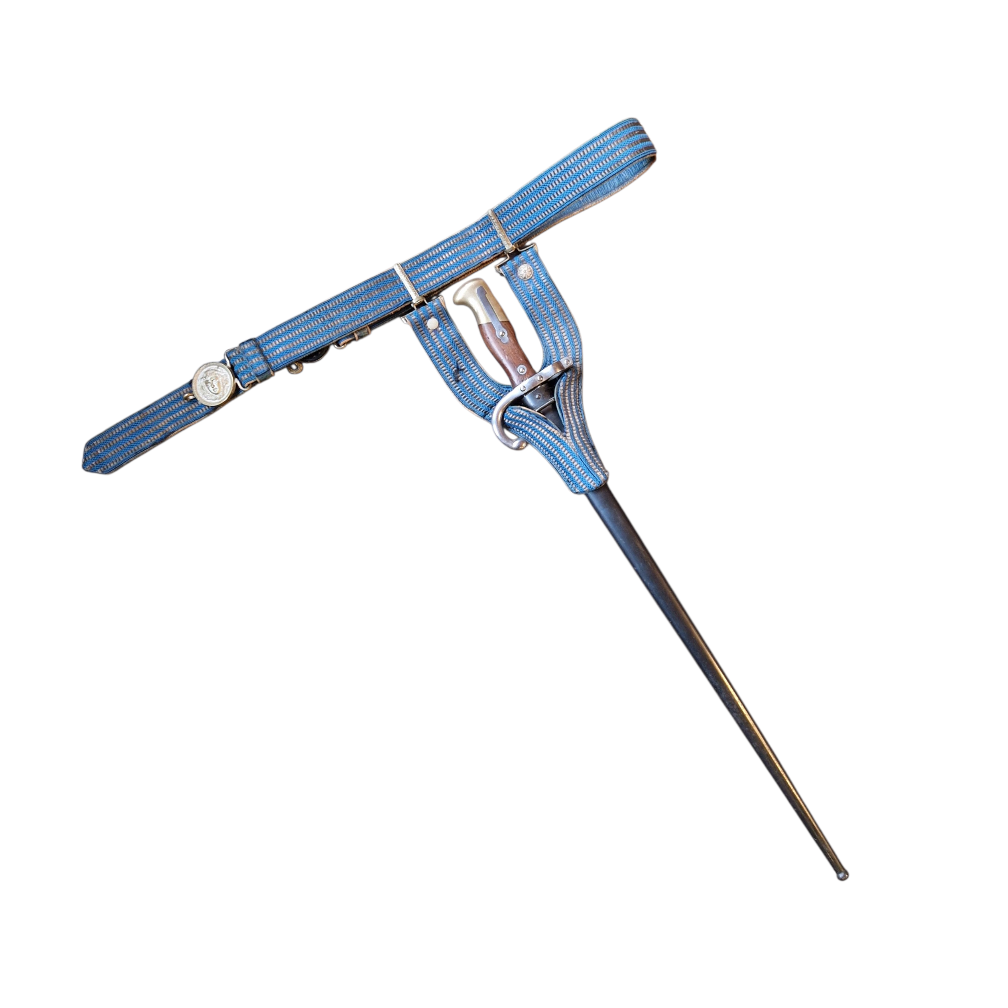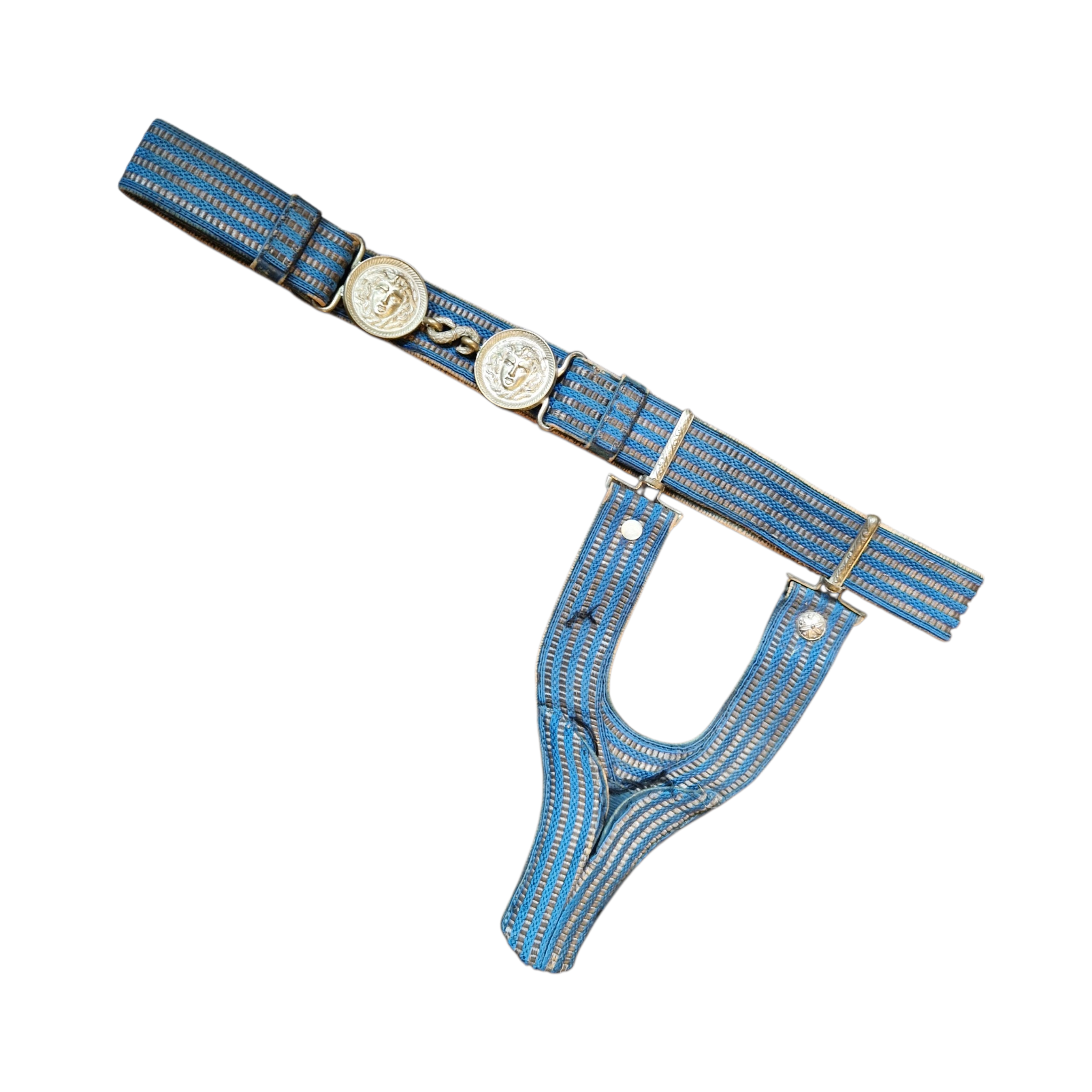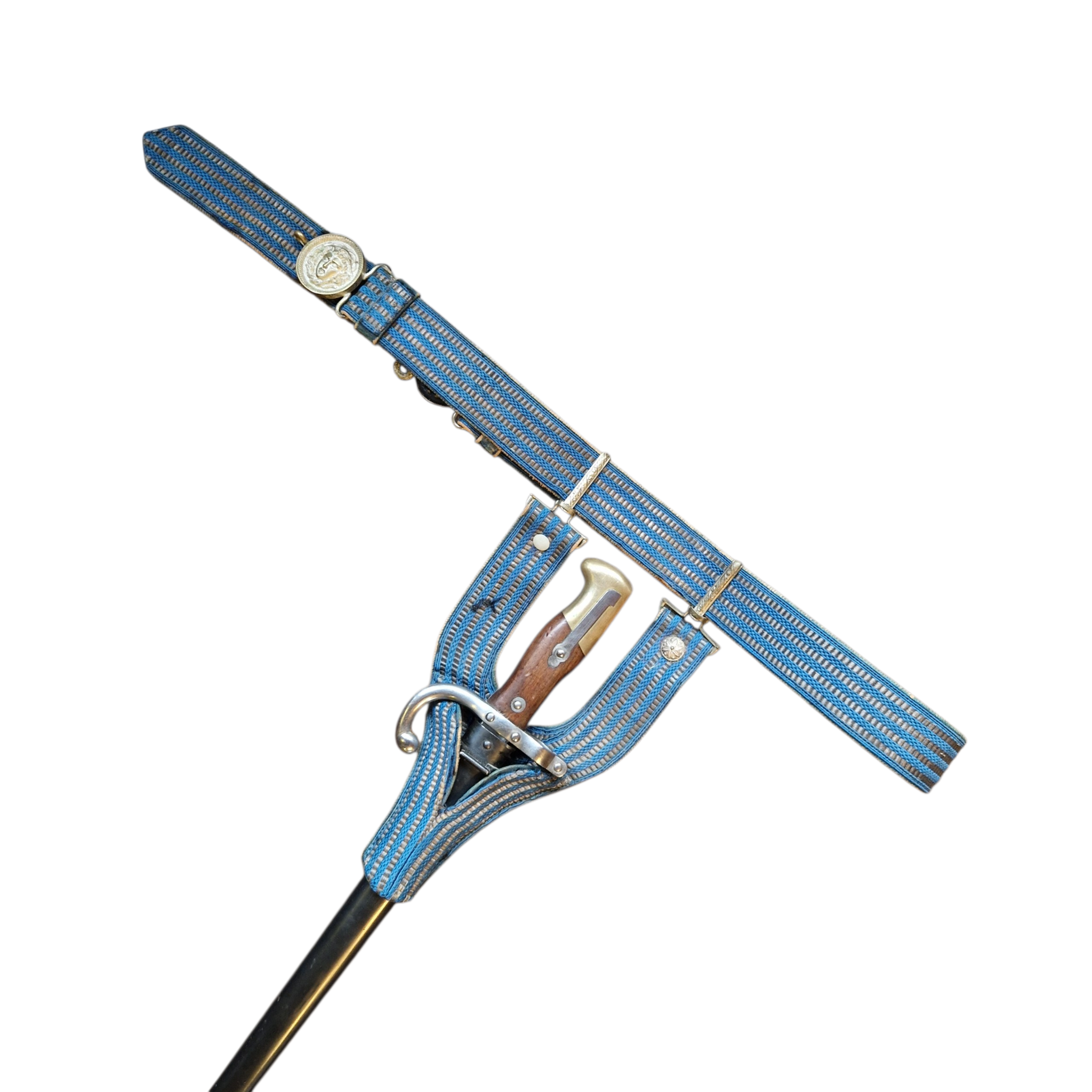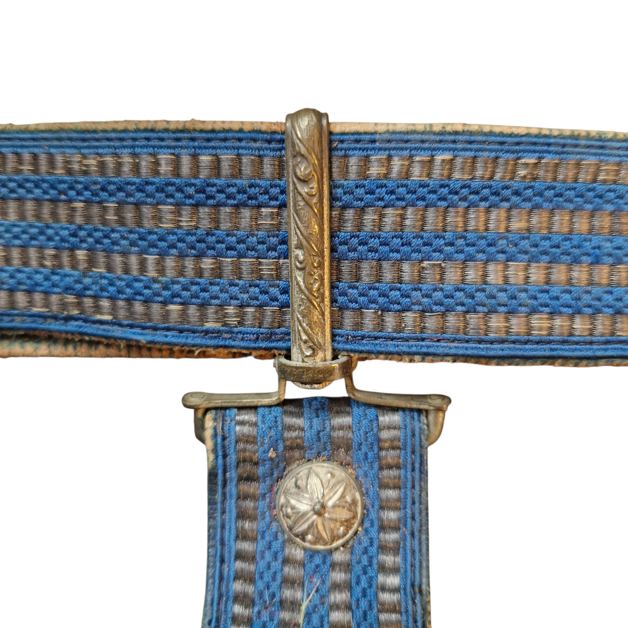 Bardzo rzadki na Polskim rynku Francuski pas wysokiego oficera z XIX wieku tak zwany Centurion Porte-epee de Grande Tenue, klamry, okucia mosiężne srebrzone, klamry z głowami gorgon, pas pięknie prezentuje się w zestawie z bagnetem typu Gras, pas pięknie tkany, niebieska skórzana podszewka pasa jak i żabki, jeden guzik przy żabce wymieniony, w epoce? wygląda na guzik z masy perłowej, pas całkowicie sprawny bez znaczących uszkodzeń i dzisiejszych napraw. rzadki przedmiot.