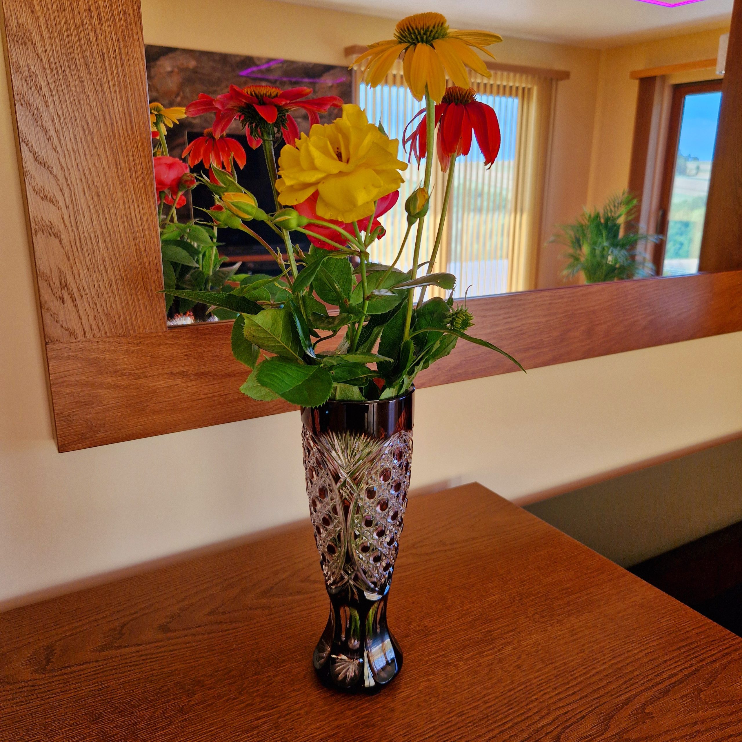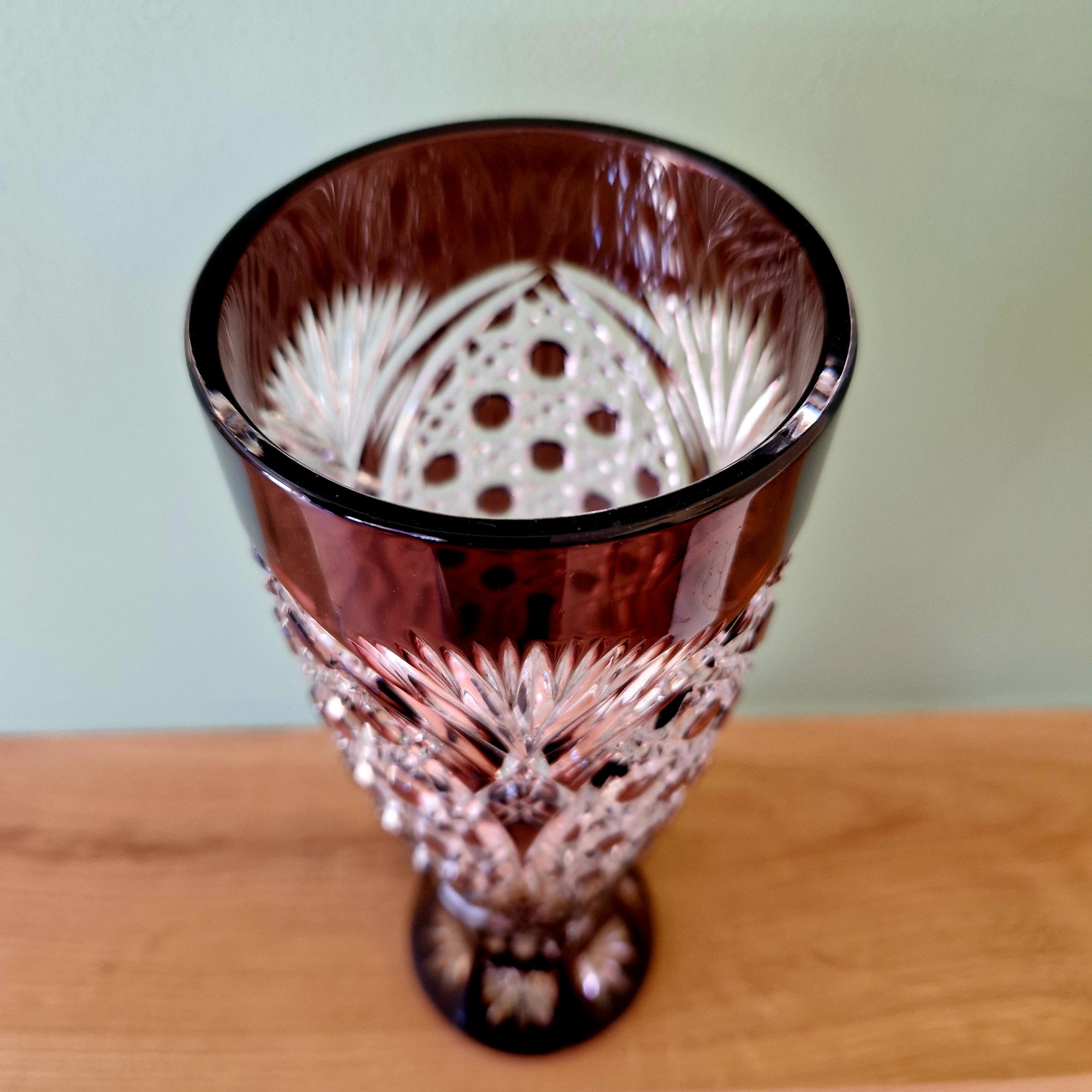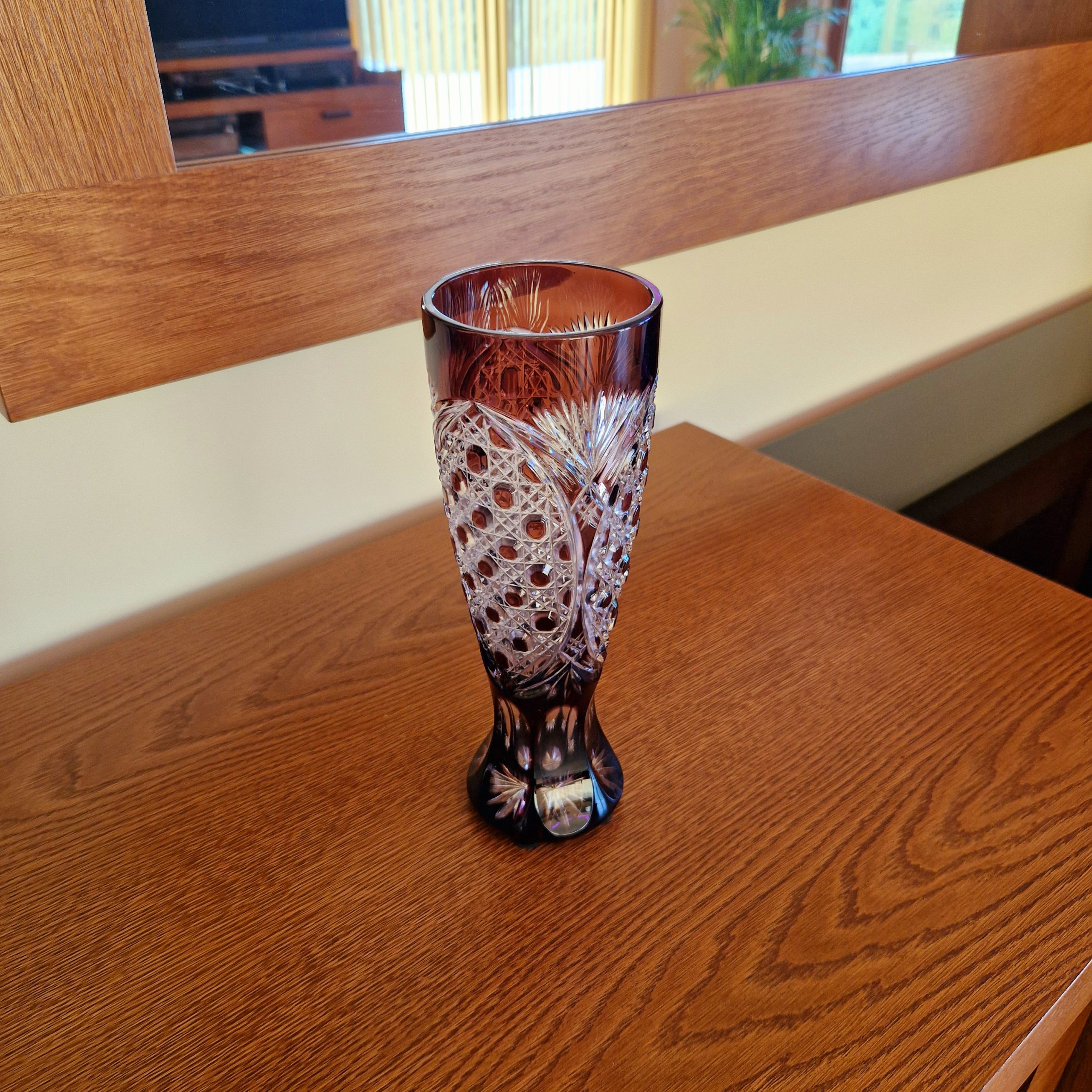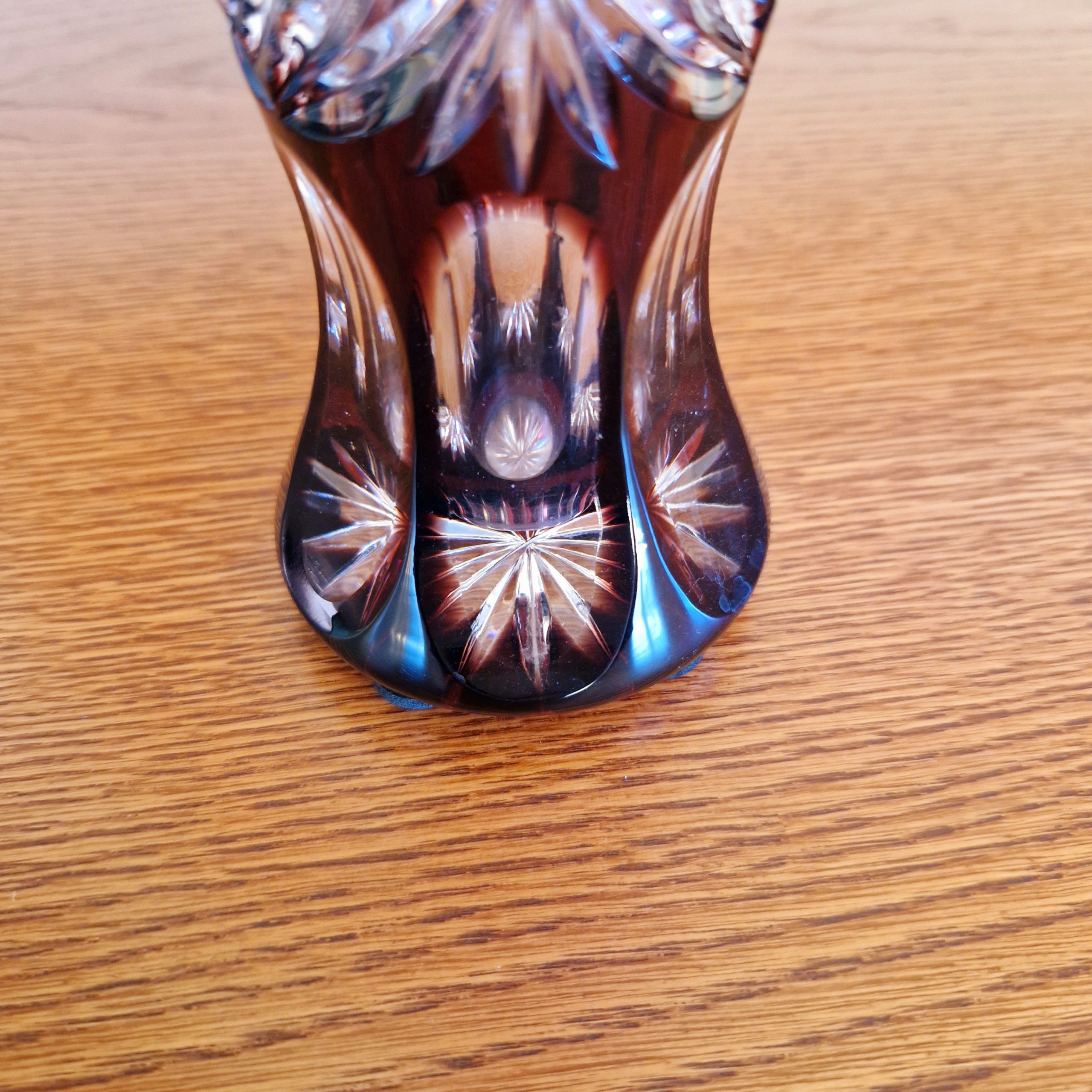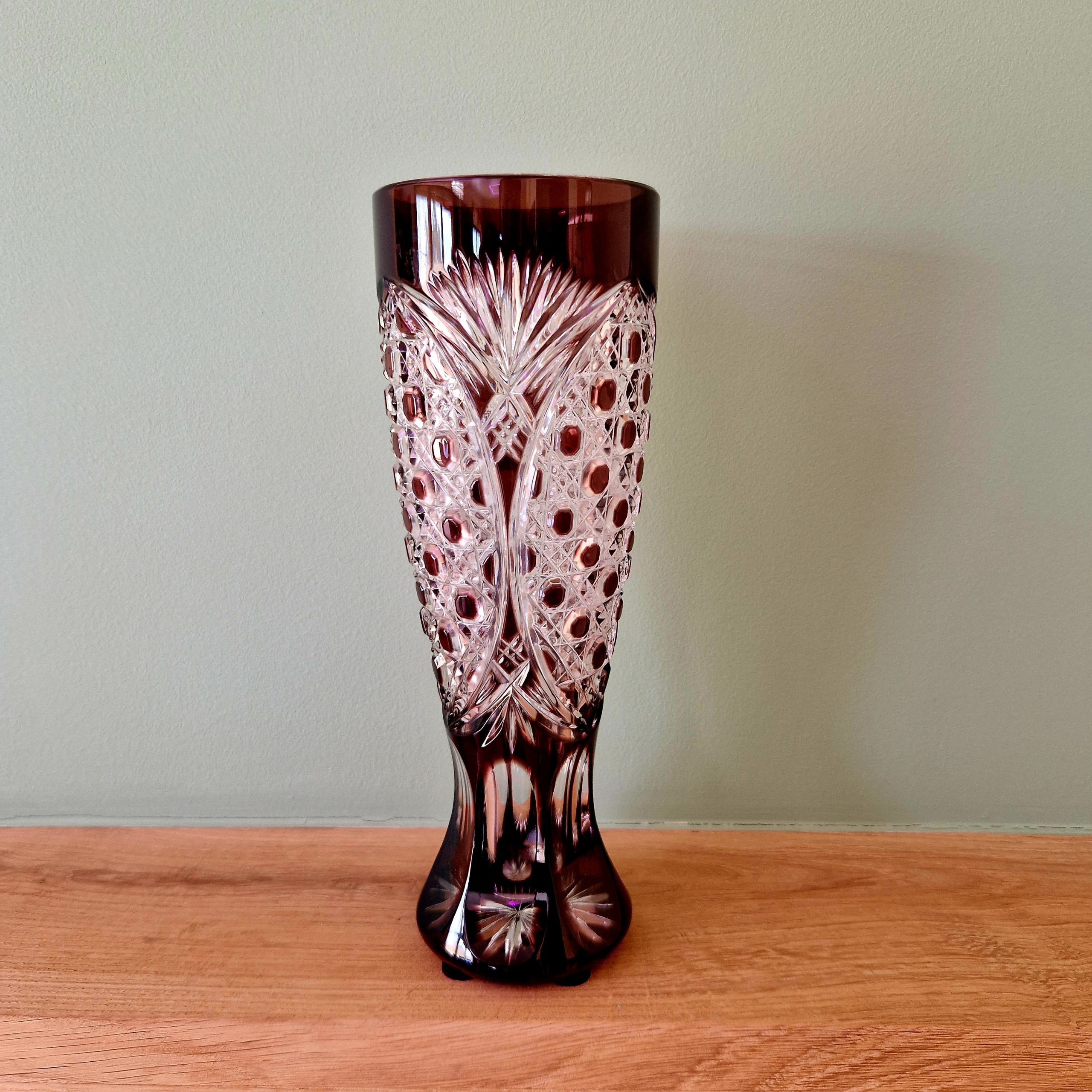 Przepiękny brązowy kryształ, frezowany ręcznie, jakość 1, niewielki bukiet , kwiaty pojedyncze, wysokość wazonu 24 cm, STAN; 5+