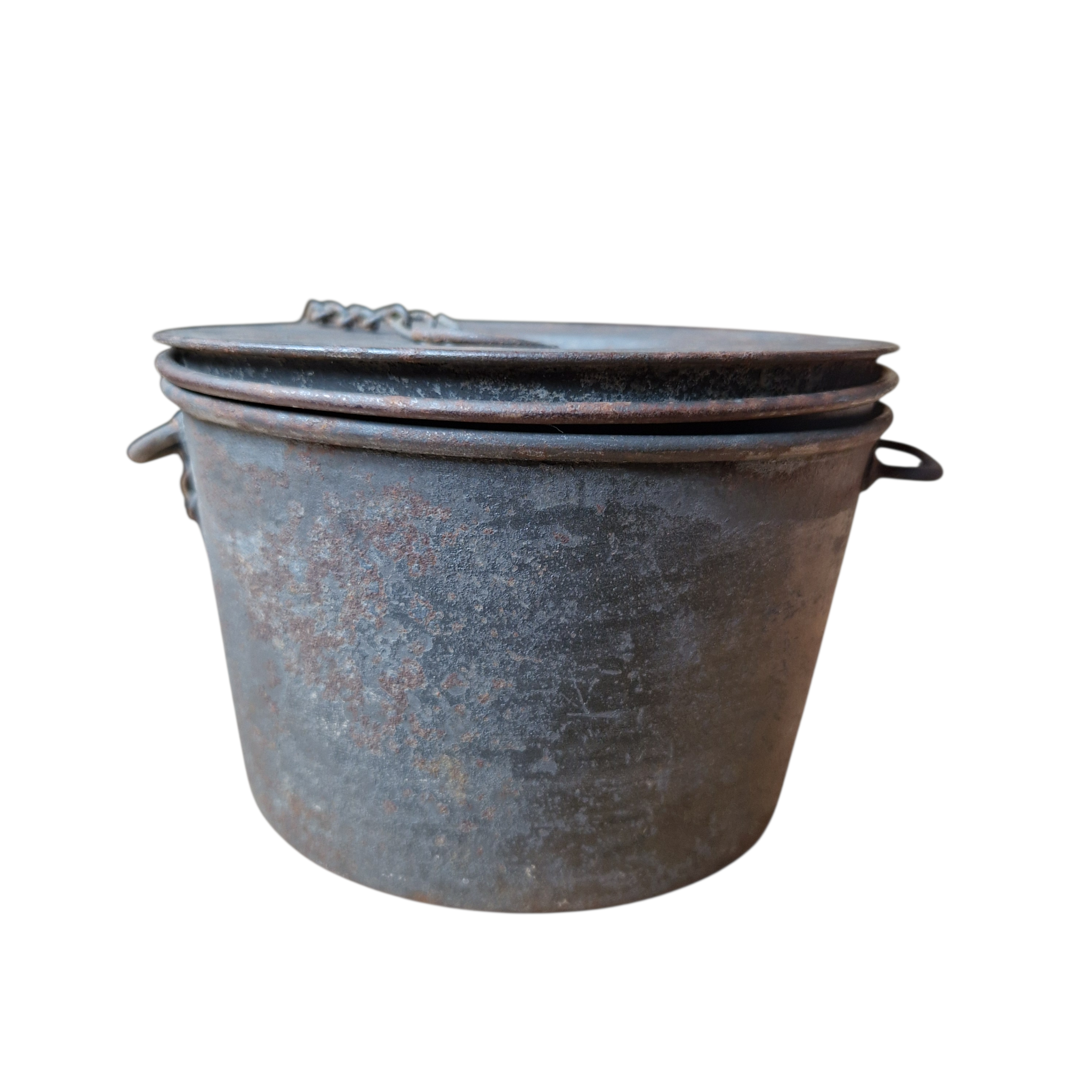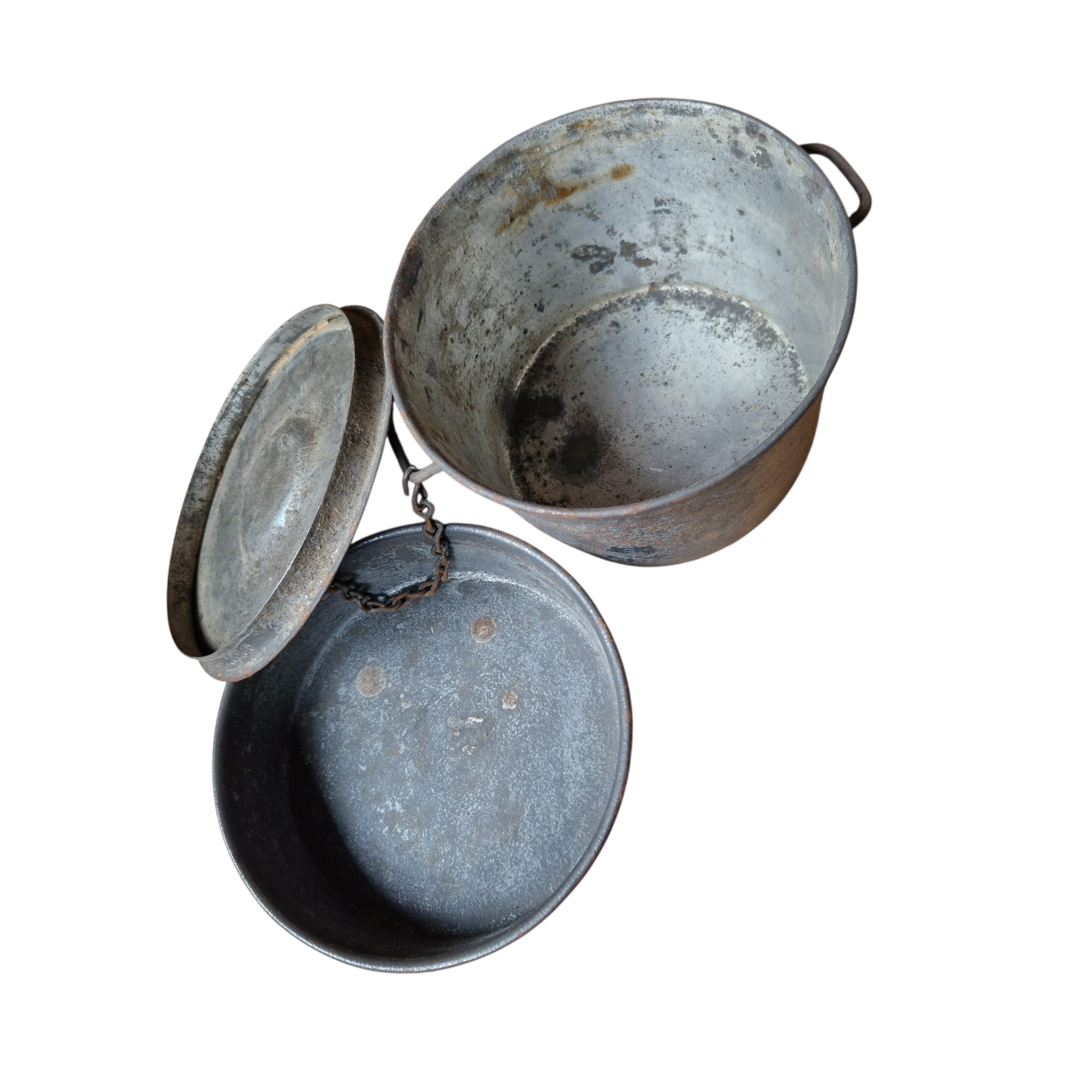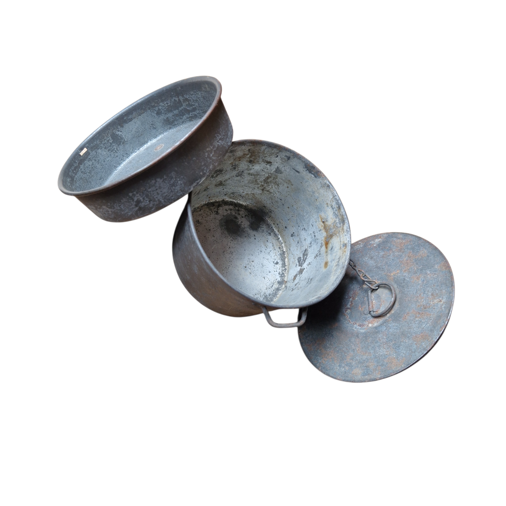 Francuska menażka polowa, używana przez armię Francuską w okresie I jak i II wojny światowej, menażka z blachy stalowej, cynowanej, dodatkowo malowanej w kolorze khaki, kolor resztkowy ale widoczny, producent LEON DELMA, menażka w bardzo dobrym stanie, kompletna, łańcuszek w całości, pełny oryginał.