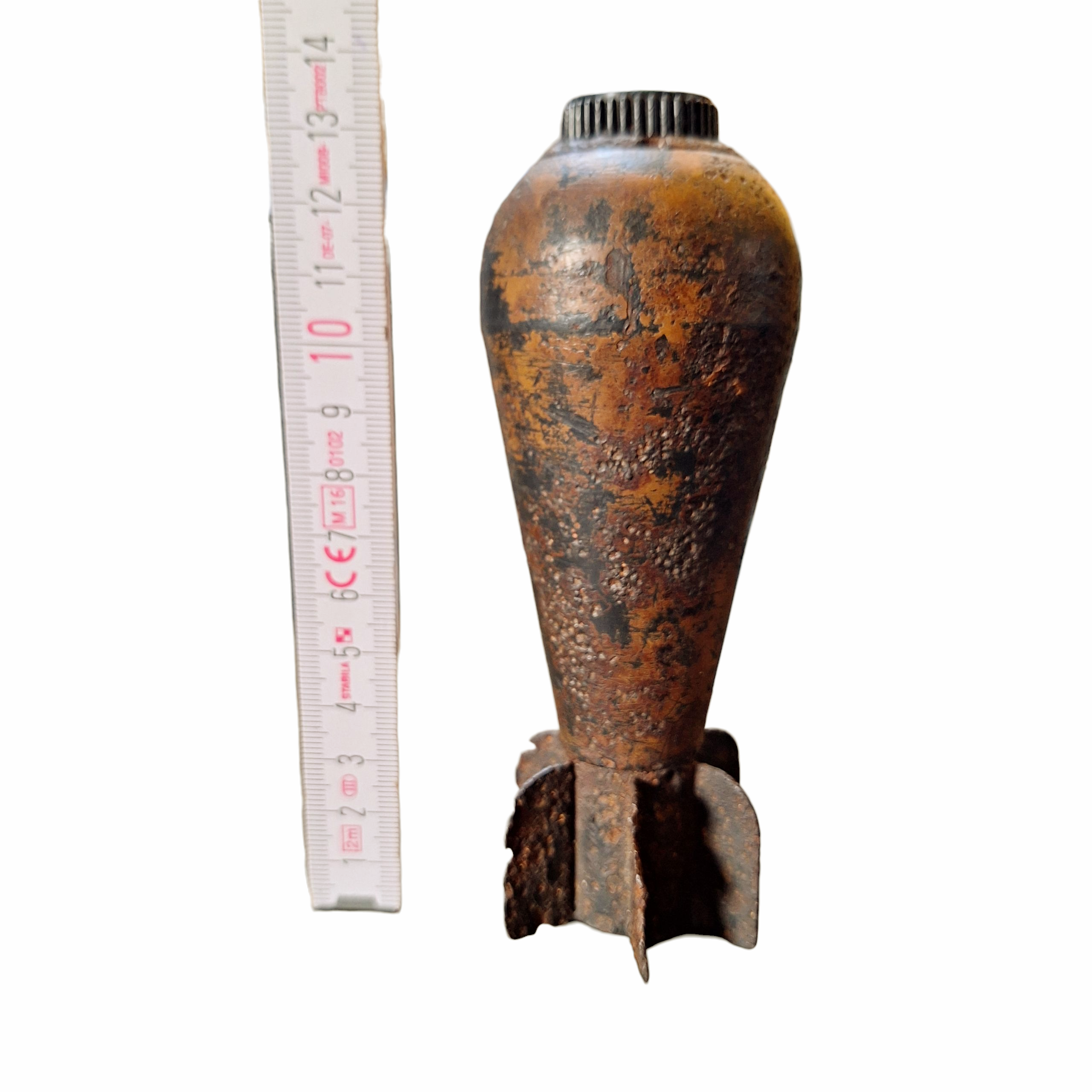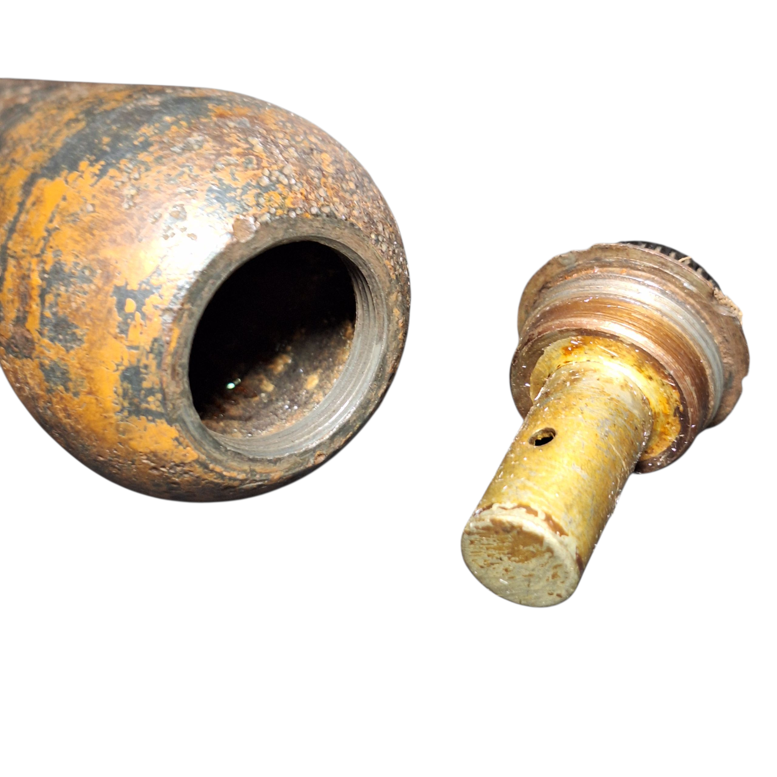 Niemiecka bombka kasetowa SD1 DEKO dużo zachowanej żółtej i zielonej niemieckiej farby, wraz z zapalnikiem transportowym z pięknie sygnowanym bakelitowym korkiem, bardzo przyjemny stan. Po zdobyciu przez Niemców Francuskiego uzbrojenia, pocisk ten został użyty jako bombka kasetonowa SD1 i tak stał się Niemieckim pociskiem moździerzowym (kasetowym) 50 mm. Produkt w pełni bezpieczny, nie zawiera materiałów niebezpiecznych i zakazanych, puste metalowe skorupy , nie podlega pod UoBiA