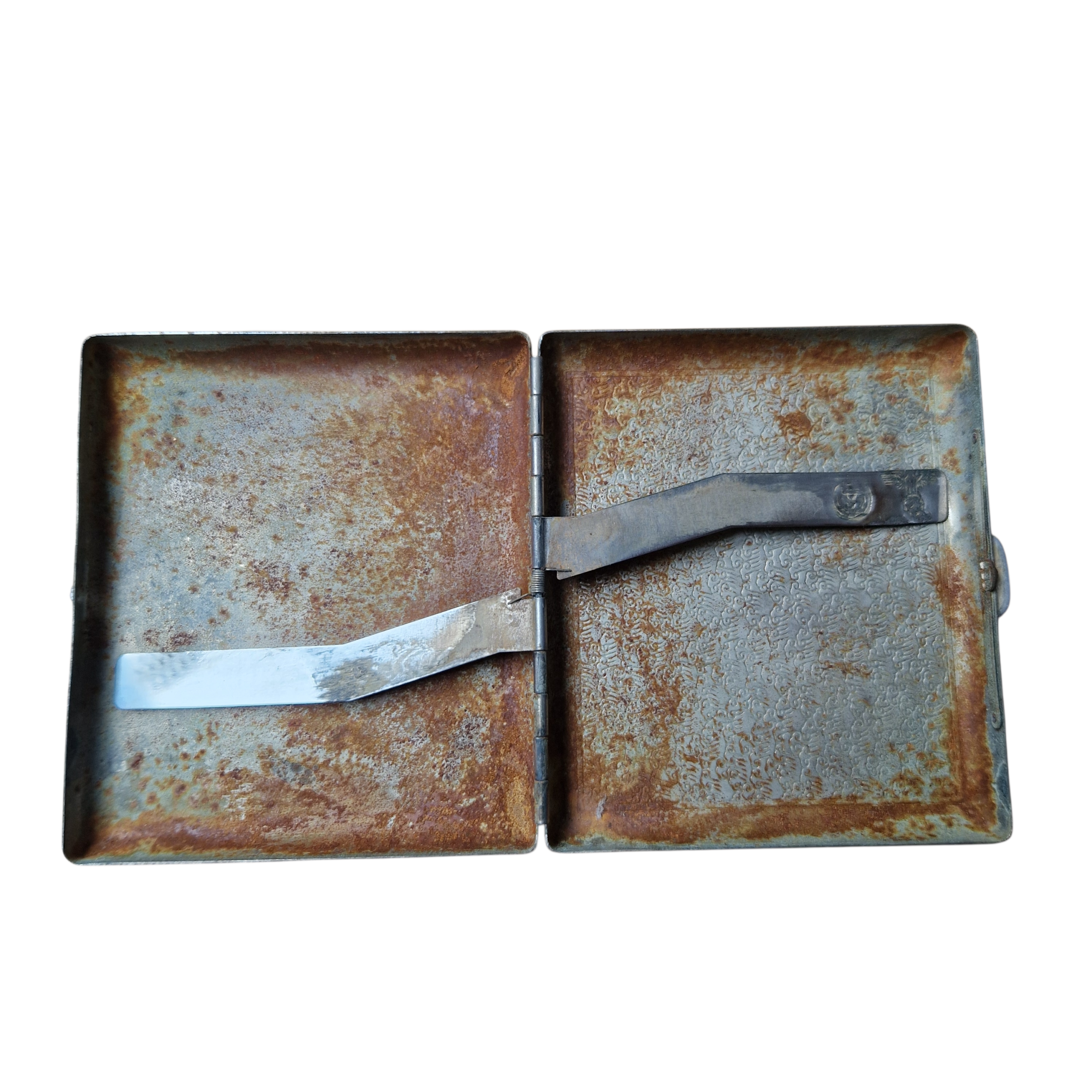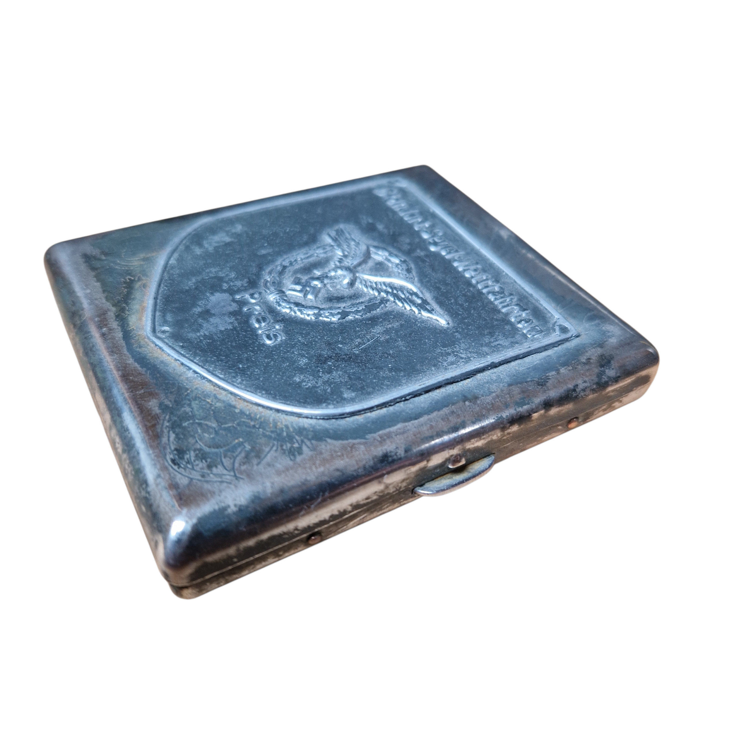 Papierośnica niewiadomego pochodzenia, gapa III rzeszy z pewnością kopia, sama papierośnica jest raczej stara, z jakiego okresu? niewiadomo, zawias sprawny, zapięcie sprawne, do rekonstrukcji historycznych jak najbardziej się nadaje.