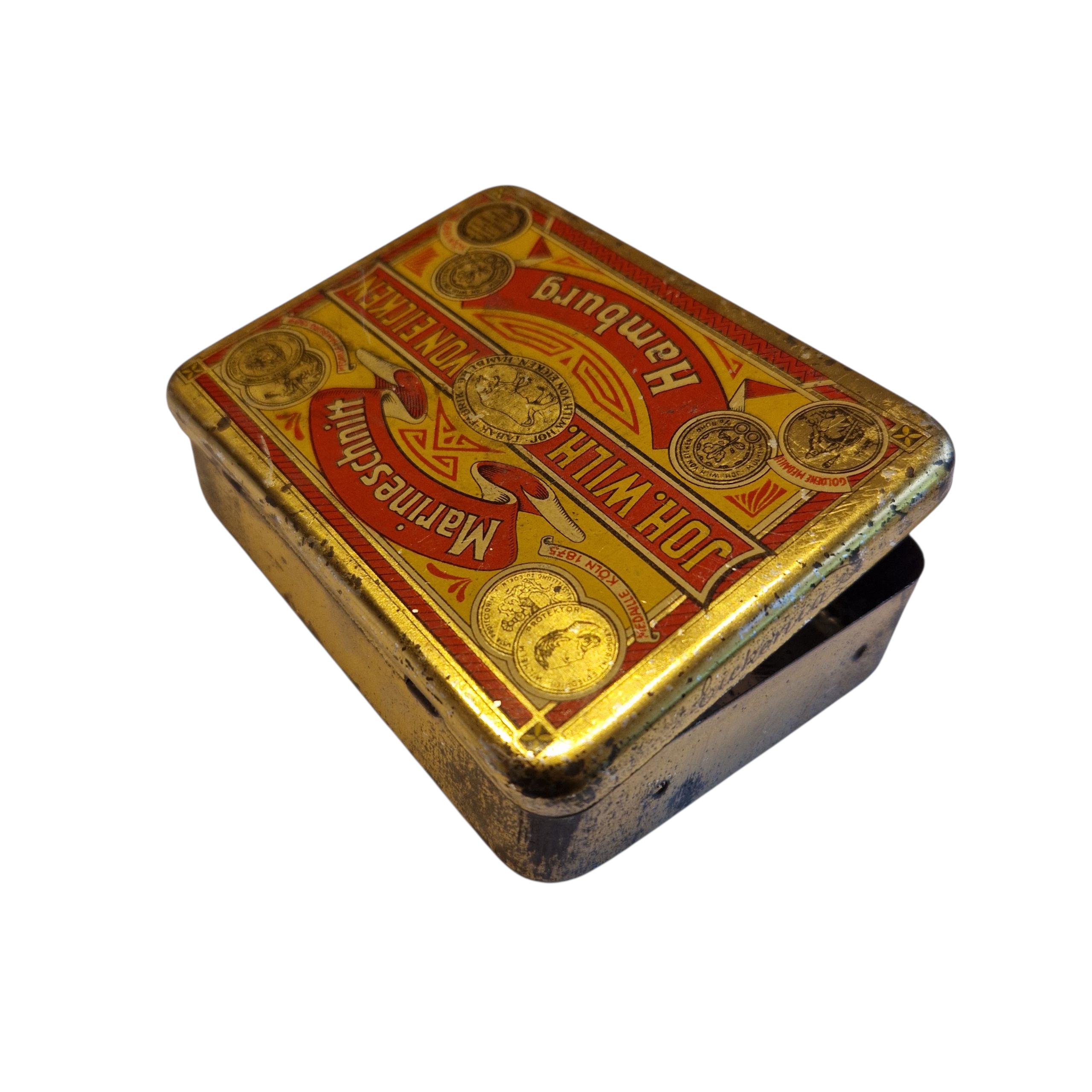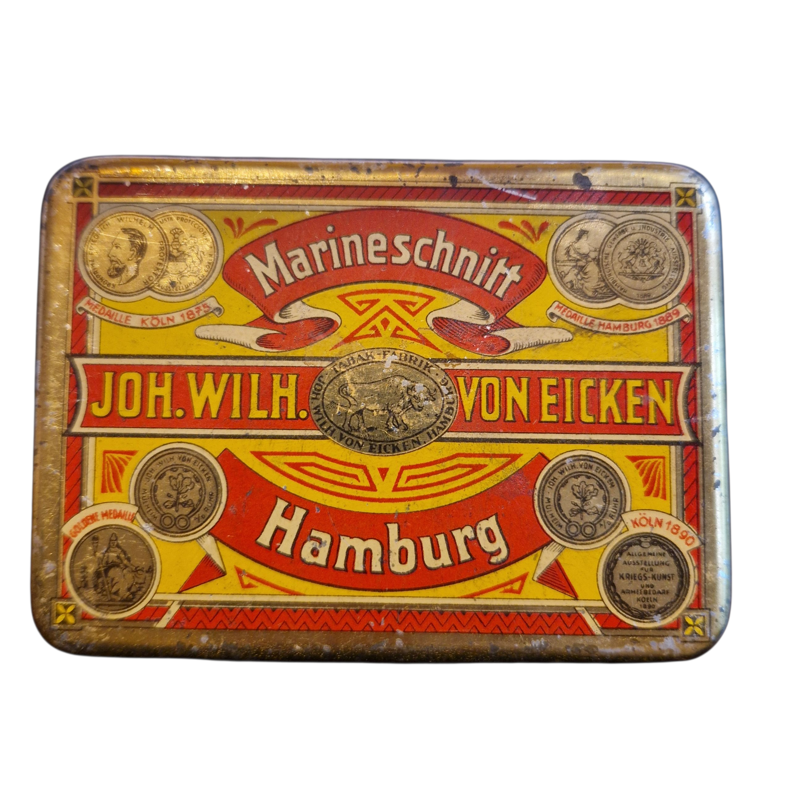 Pudełko na tytoń mieszanka ,, marynarska” tytoniu, okres I wojny światowej, z całą pewnością palony w okopach I wojny św. producent JOH.Wilhelm Von Eicken HAMBURG Niemcy