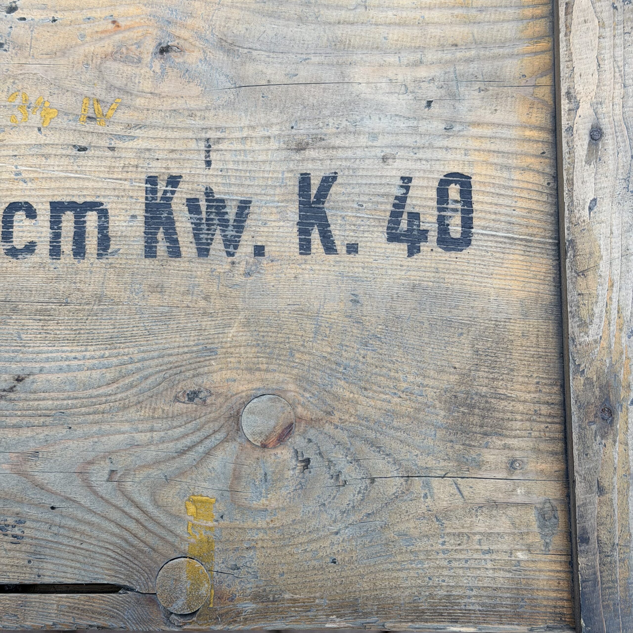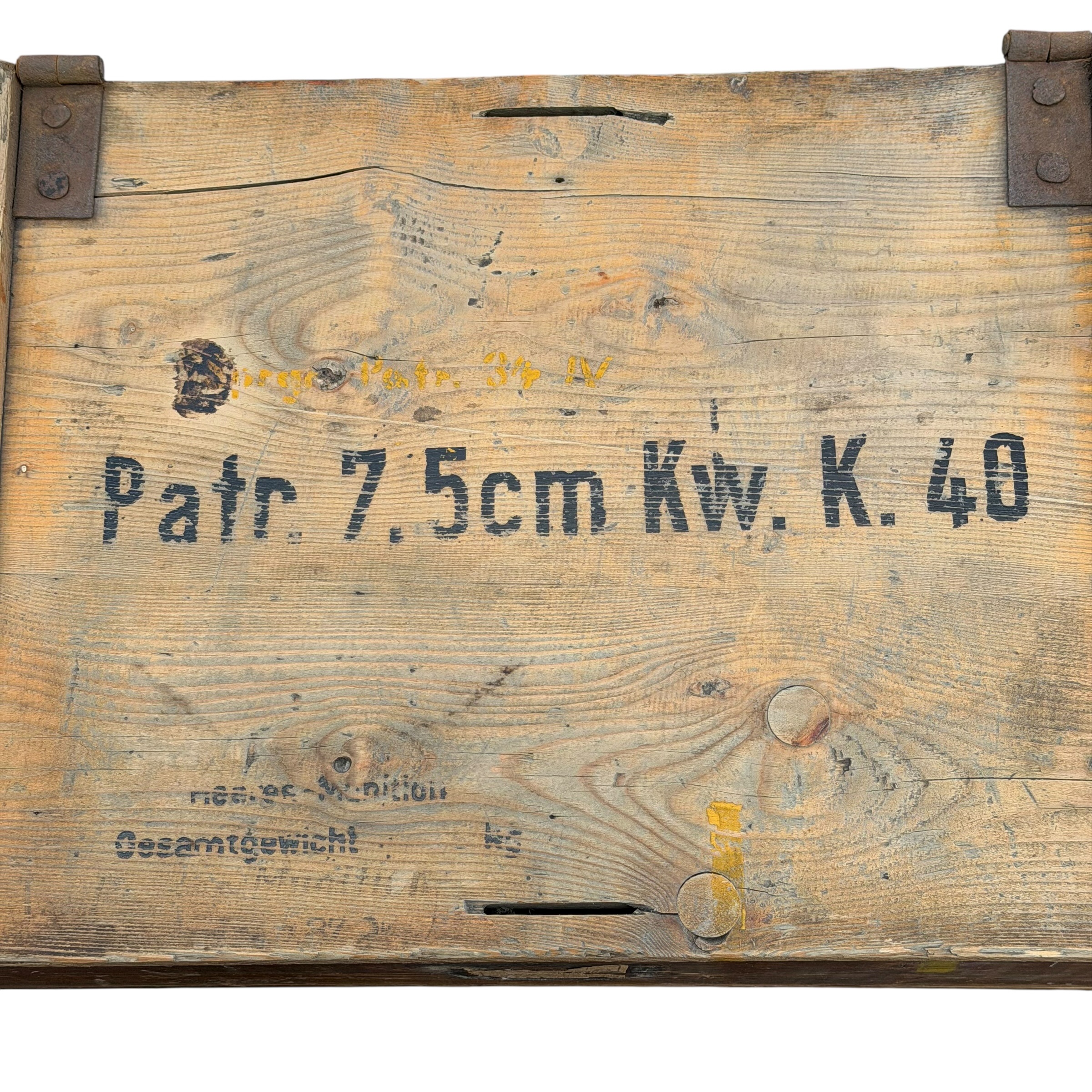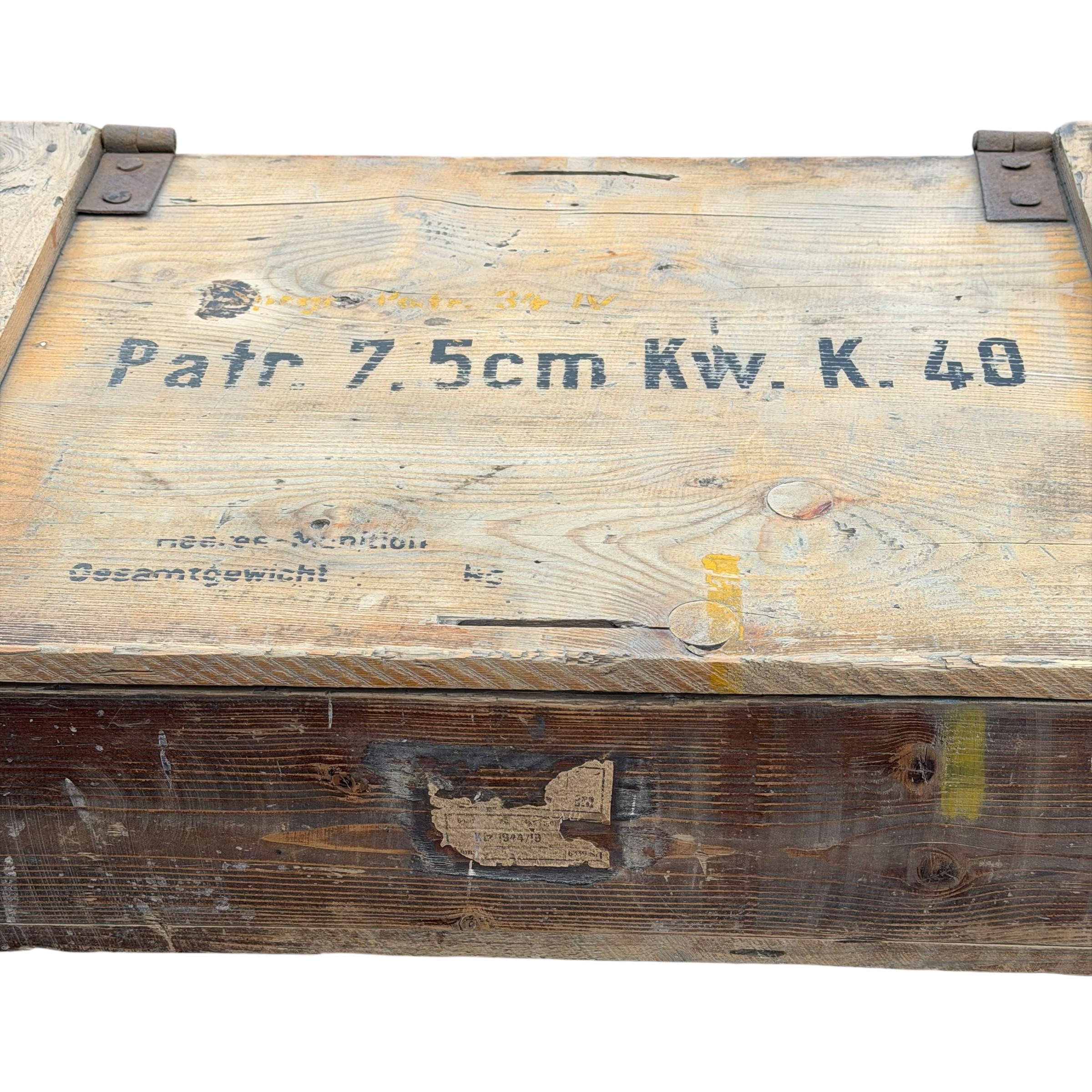 Niemiecka skrzynka na amunicję 7,5 cm KwK 40, używaną w czołgach PzKpfw IV a także w działach pancernych takich jak Sturmgeschutz III i Sturmgeschutz I, ta dokłądna skrzynka była przeznaczona dla Sprgr Patr 34 (Pocisk burzący) dobrze zachowane napisy na klapie, jak i karteczka od przodu i w środku, drewno mocne, zawiasy sprawne