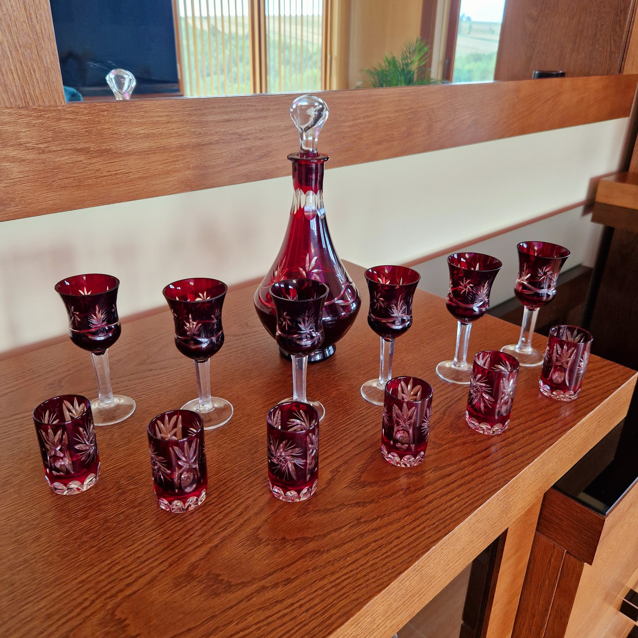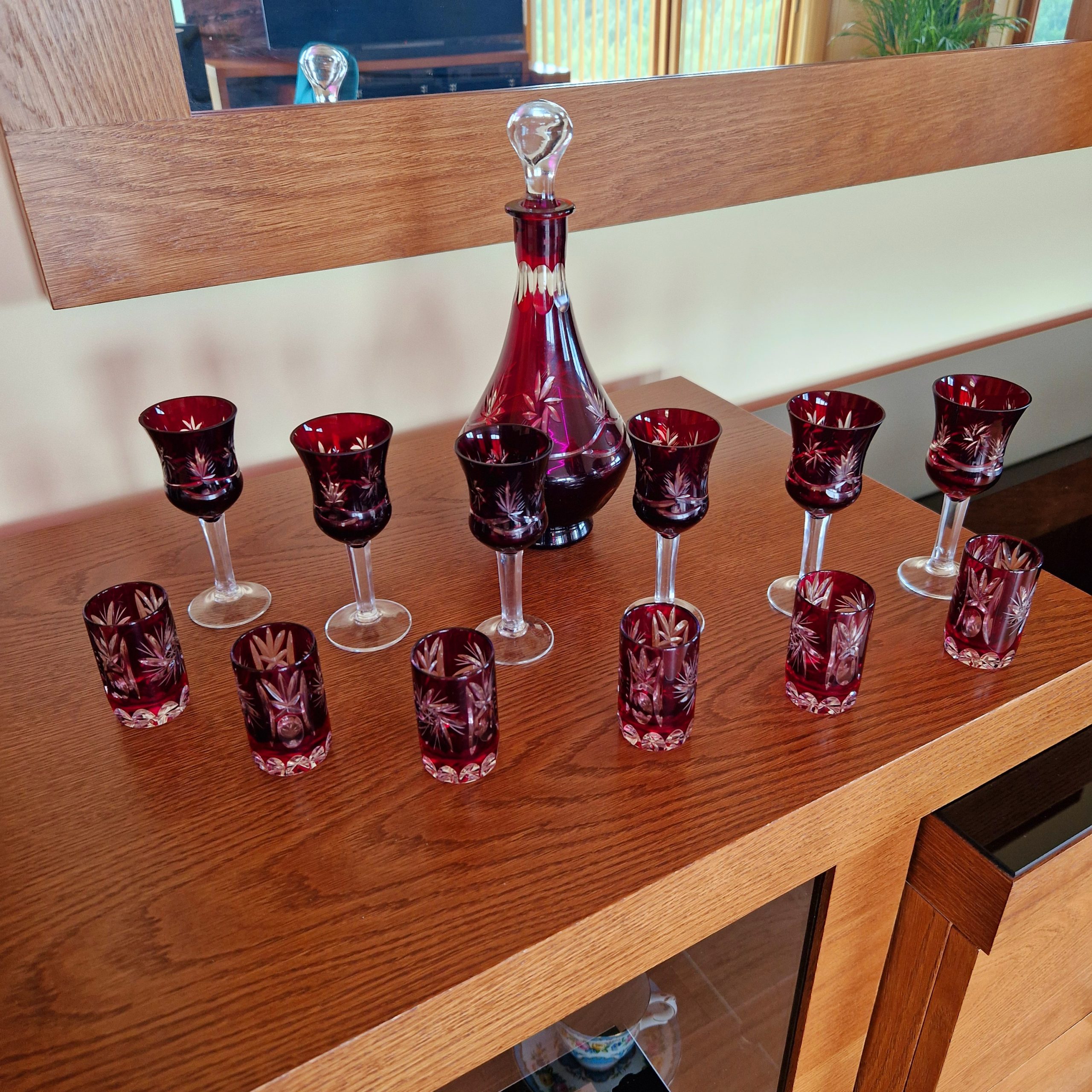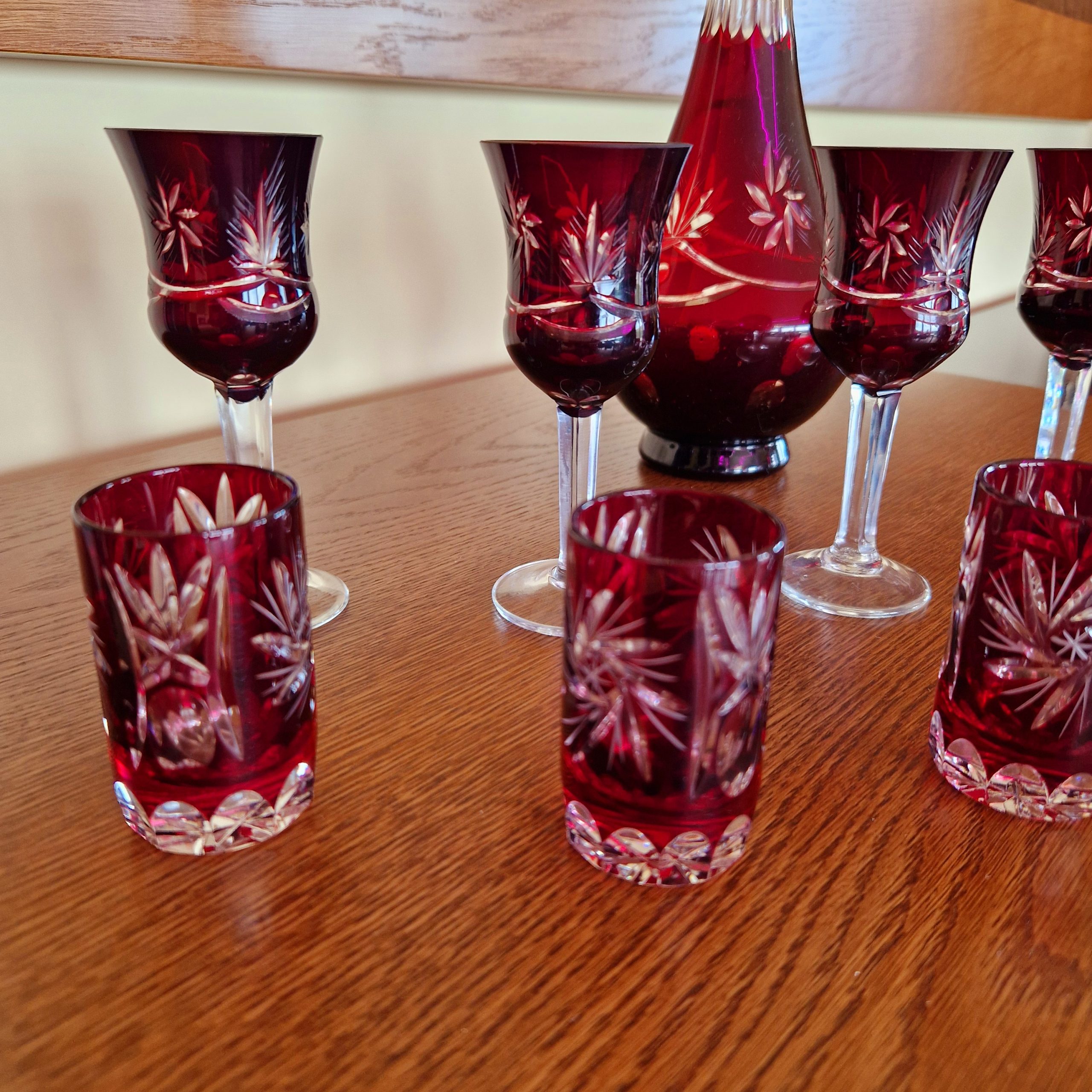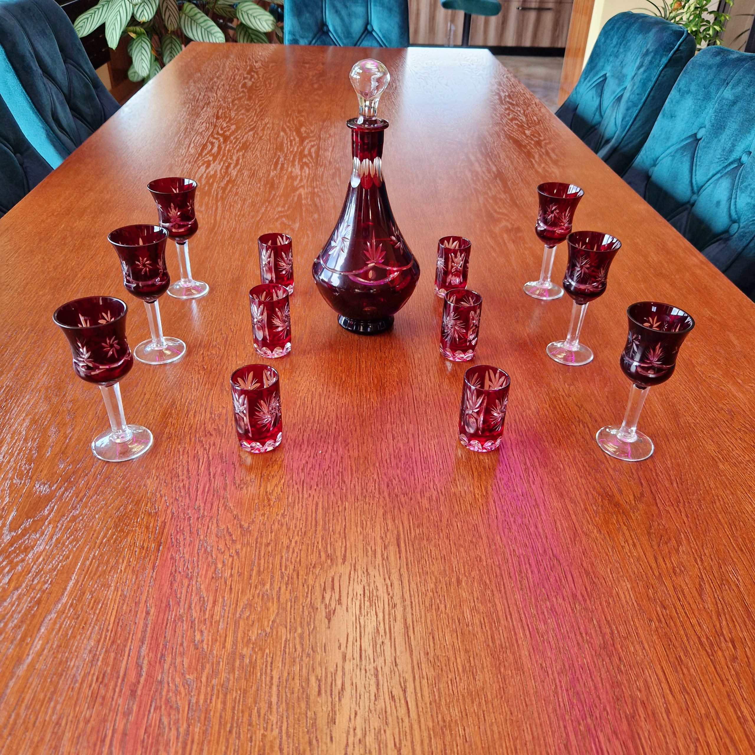 Kryształowa karafka wraz z zestawem kieliszków do likieru – 6 szt oraz wódki – 6 szt, piękny rubinowy kolor,ciężkie szkło kryształowe, szkło frezowane ręcznie. cztery kieliszki do likieru widoczne na ostatnim zdjęciu lekko wyszczerbione na rancie [około 2-3 mm] z uwagi na kolor i błyski światła w szkle uszkodzenia trudno zauważalne, nie wpływające na użytkowanie. Cena za zestaw, pojemność karafki ok. 0,5 l wysokość karafki 26 cm, wysokość kieliszka do likieru 12 cm, kieliszka do wódki 6,5 cm . STAN 4+