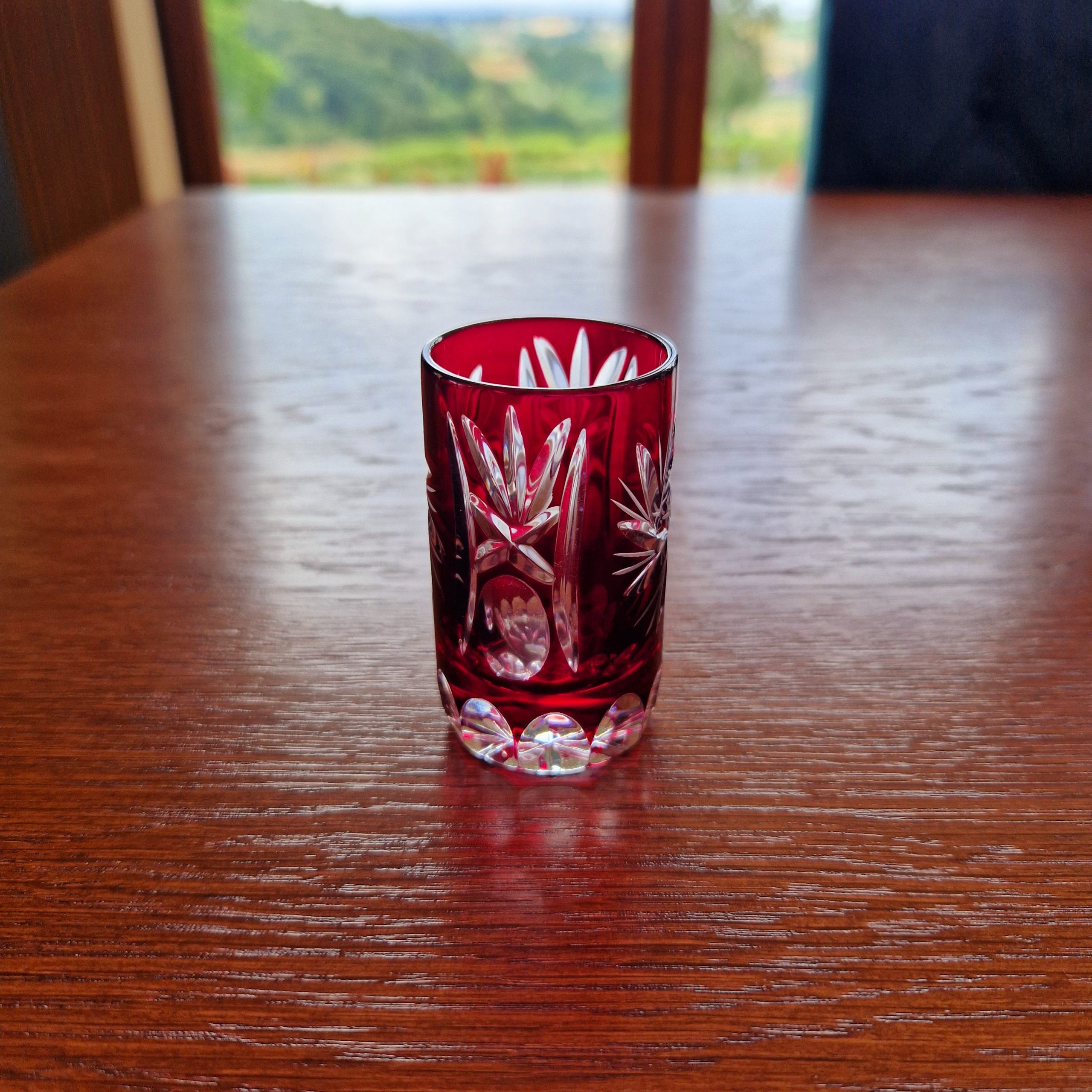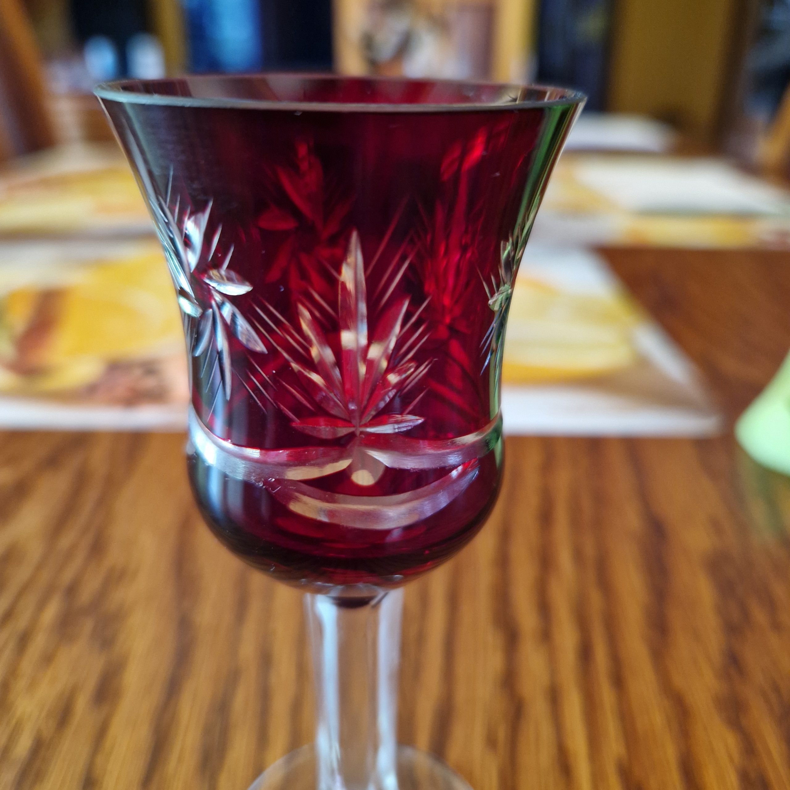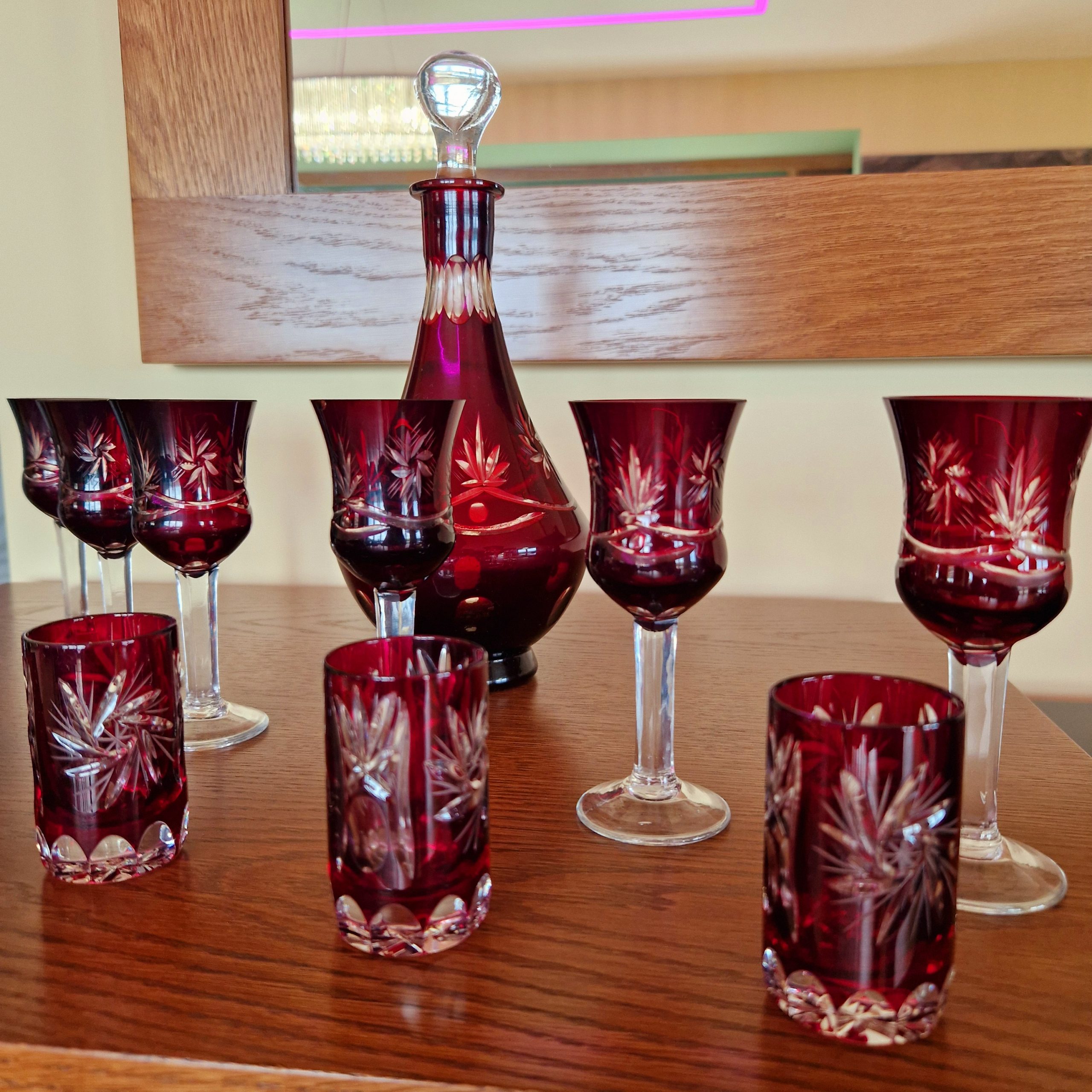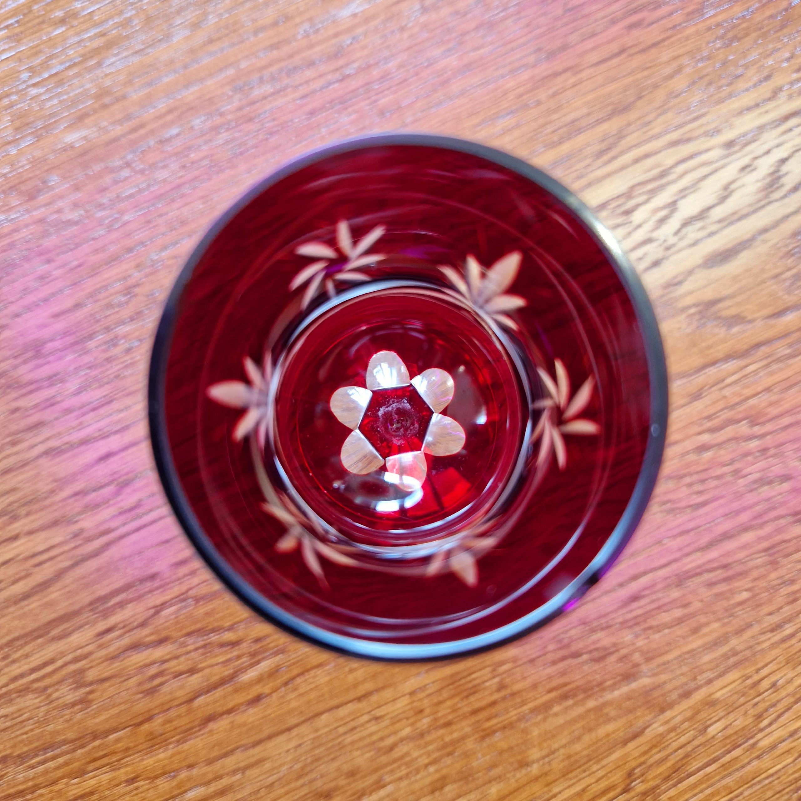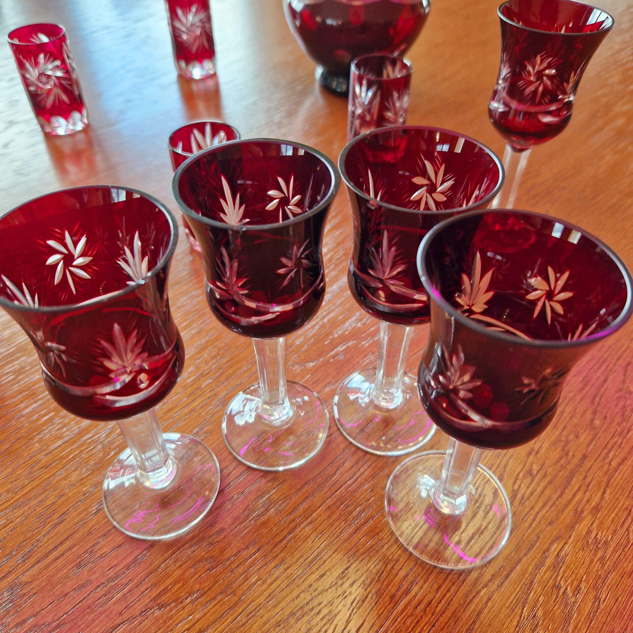 Kryształowa karafka wraz z zestawem kieliszków do likieru – 6 szt oraz wódki – 6 szt, piękny rubinowy kolor,ciężkie szkło kryształowe, szkło frezowane ręcznie. cztery kieliszki do likieru widoczne na ostatnim zdjęciu lekko wyszczerbione na rancie [około 2-3 mm] z uwagi na kolor i błyski światła w szkle uszkodzenia trudno zauważalne, nie wpływające na użytkowanie. Cena za zestaw, pojemność karafki ok. 0,5 l wysokość karafki 26 cm, wysokość kieliszka do likieru 12 cm, kieliszka do wódki 6,5 cm . STAN 4+